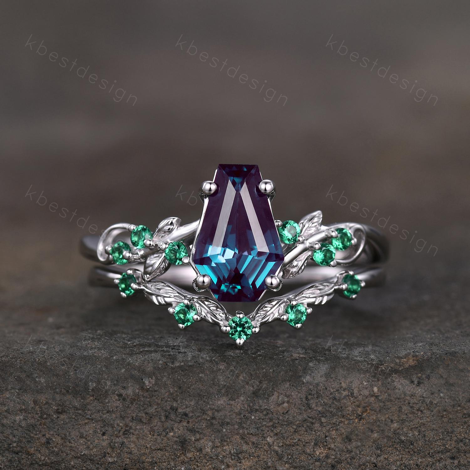 Coffin cut Alexandrite Engagement Ring Set Art Deco Branch Design Leaf Ring Curved Emerald Stacking Band Unique Bridal Promise Ring Gift
