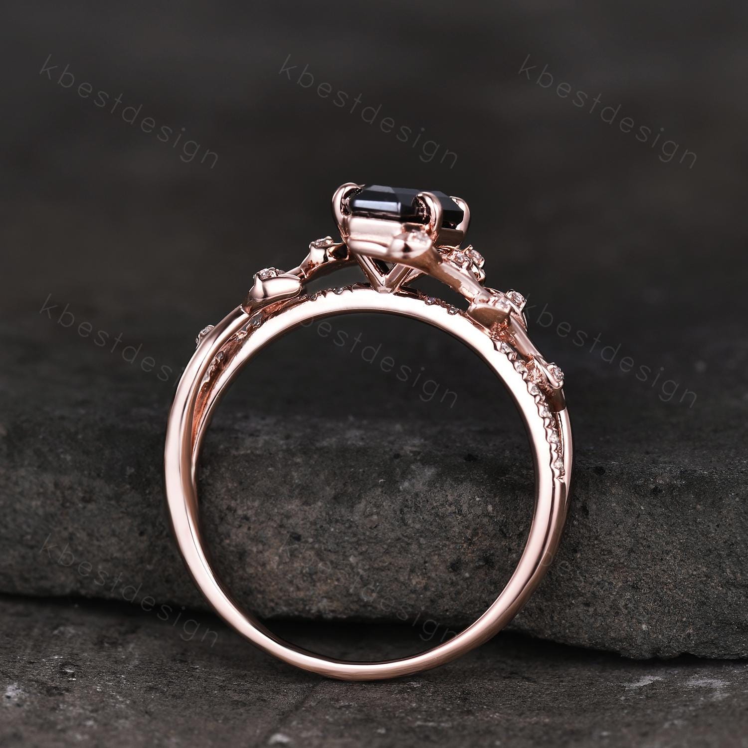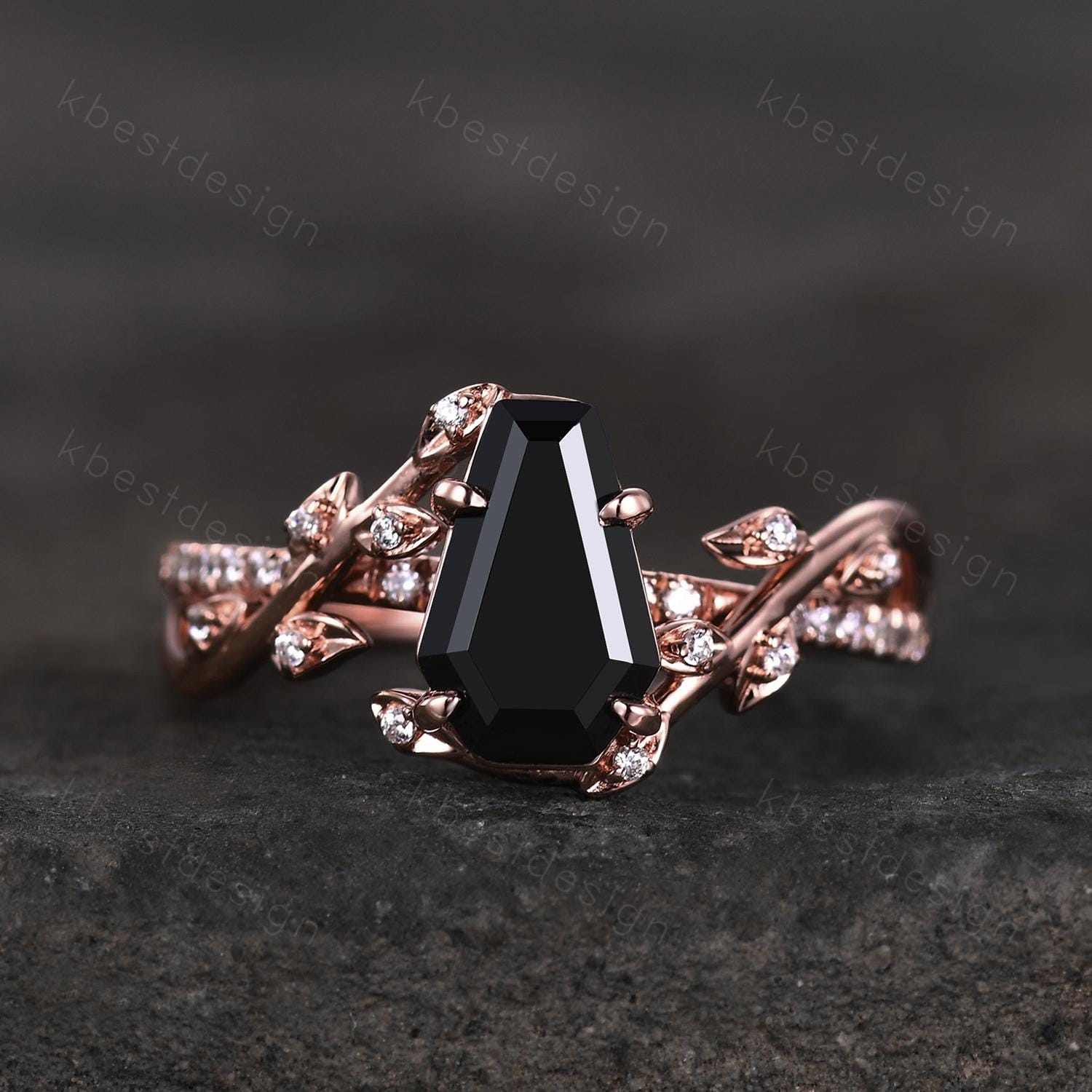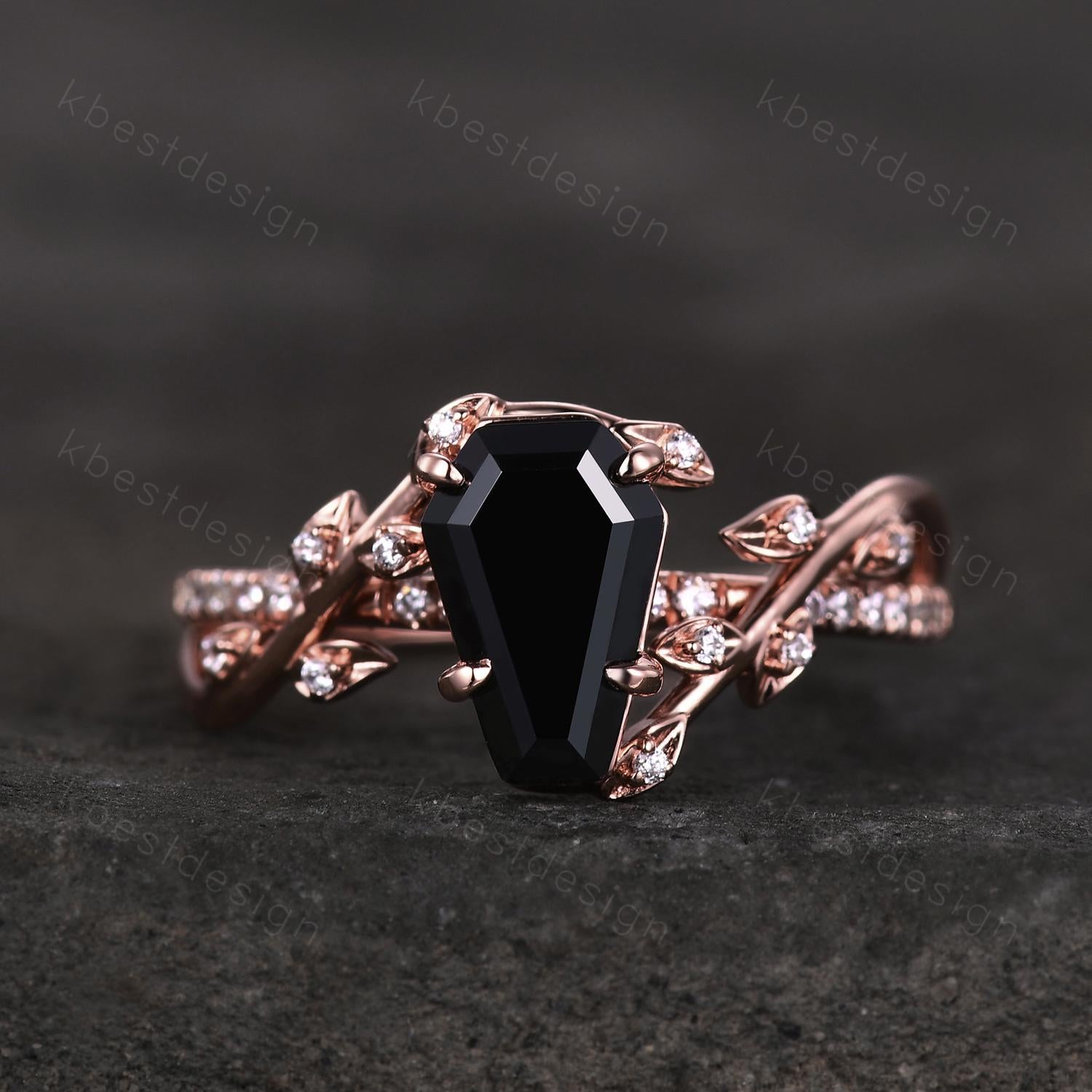 Coffin cut black onyx engagement ring Rose gold ring Art deco twig leaf moissanite wedding ring nature inspired ring bridal promise ring