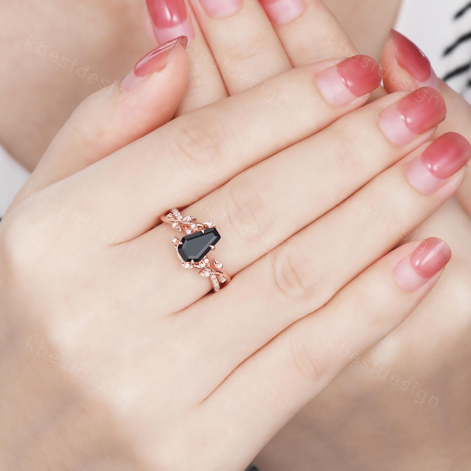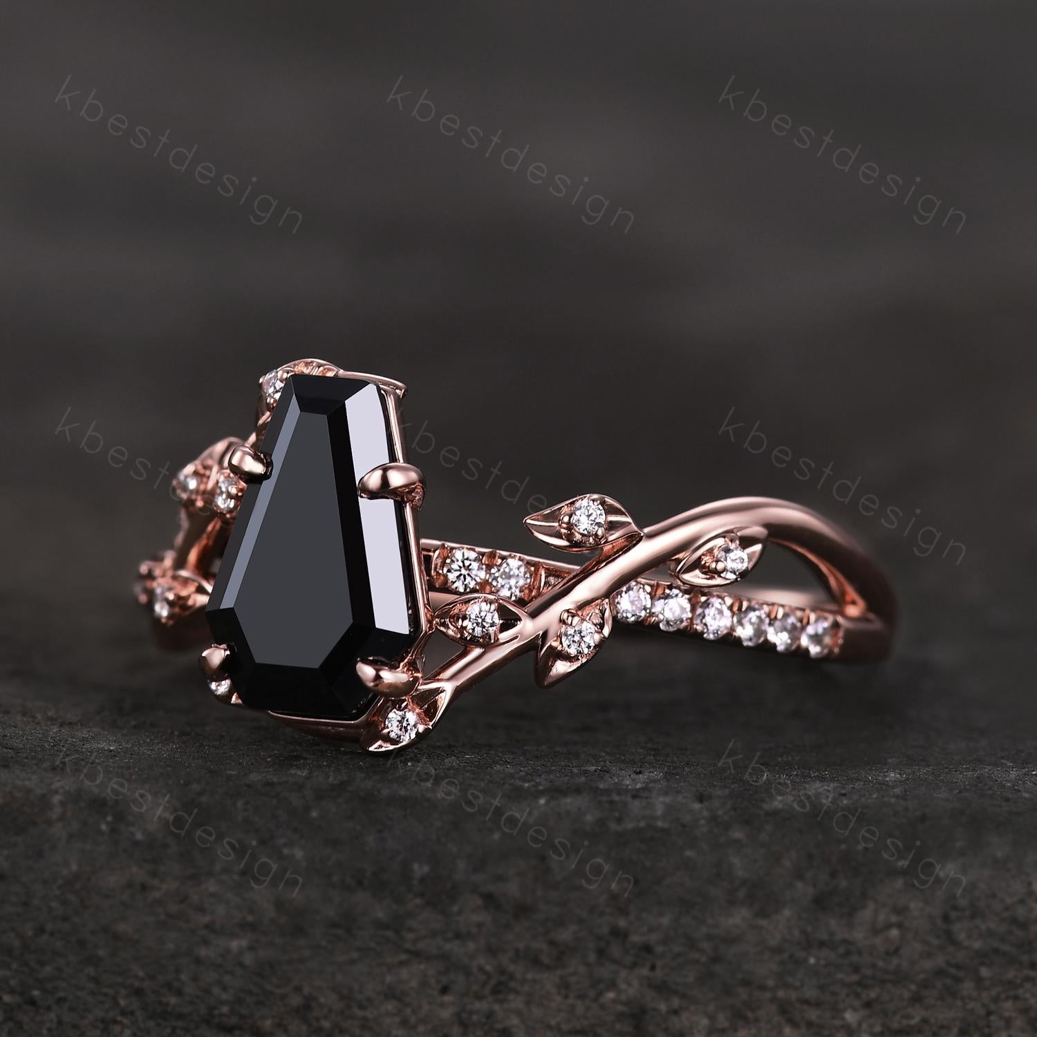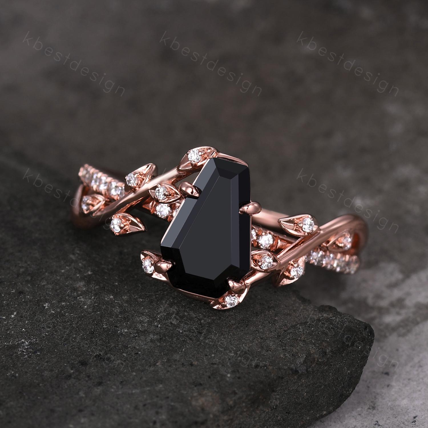 Coffin cut black onyx engagement ring Rose gold ring Art deco twig leaf moissanite wedding ring nature inspired ring bridal promise ring