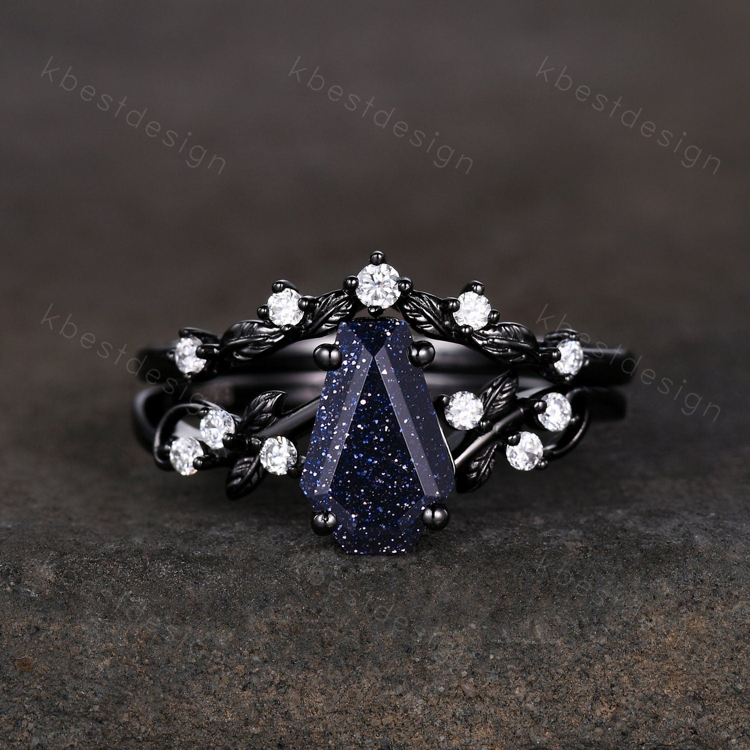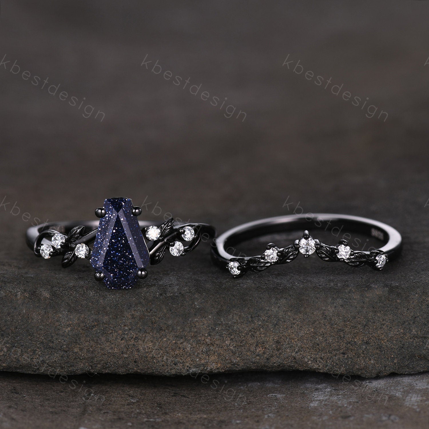 Vintage coffin blue sandstone engagement ring set black gold twig leaf moissanite ring nature branch ring unique bridal wedding ring set