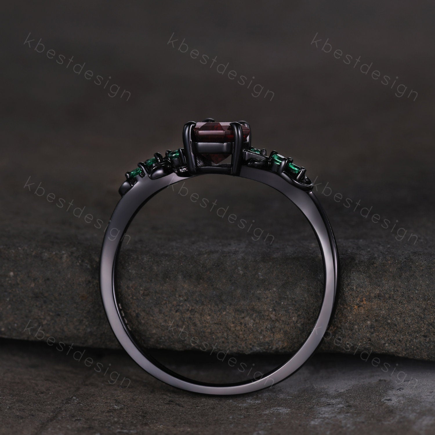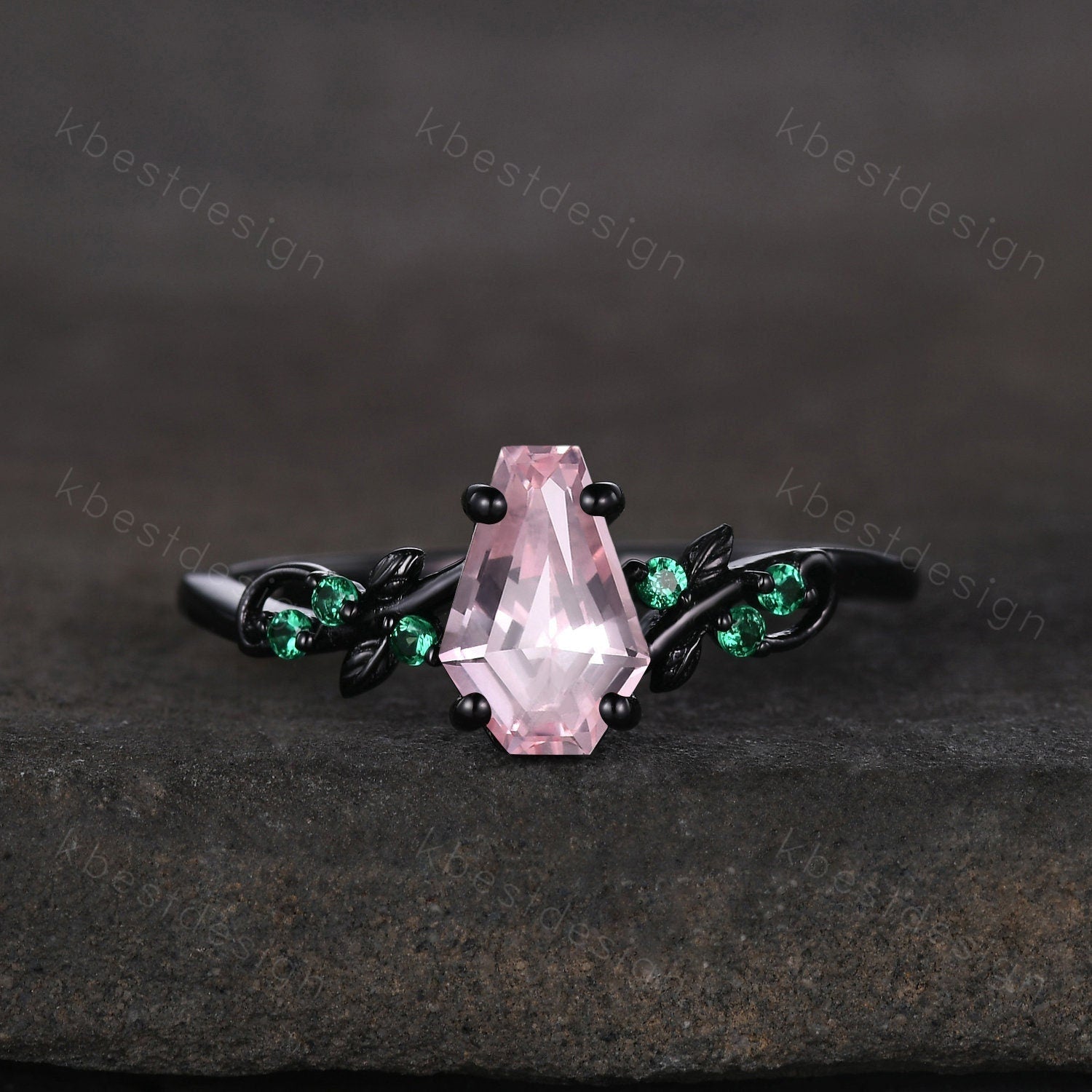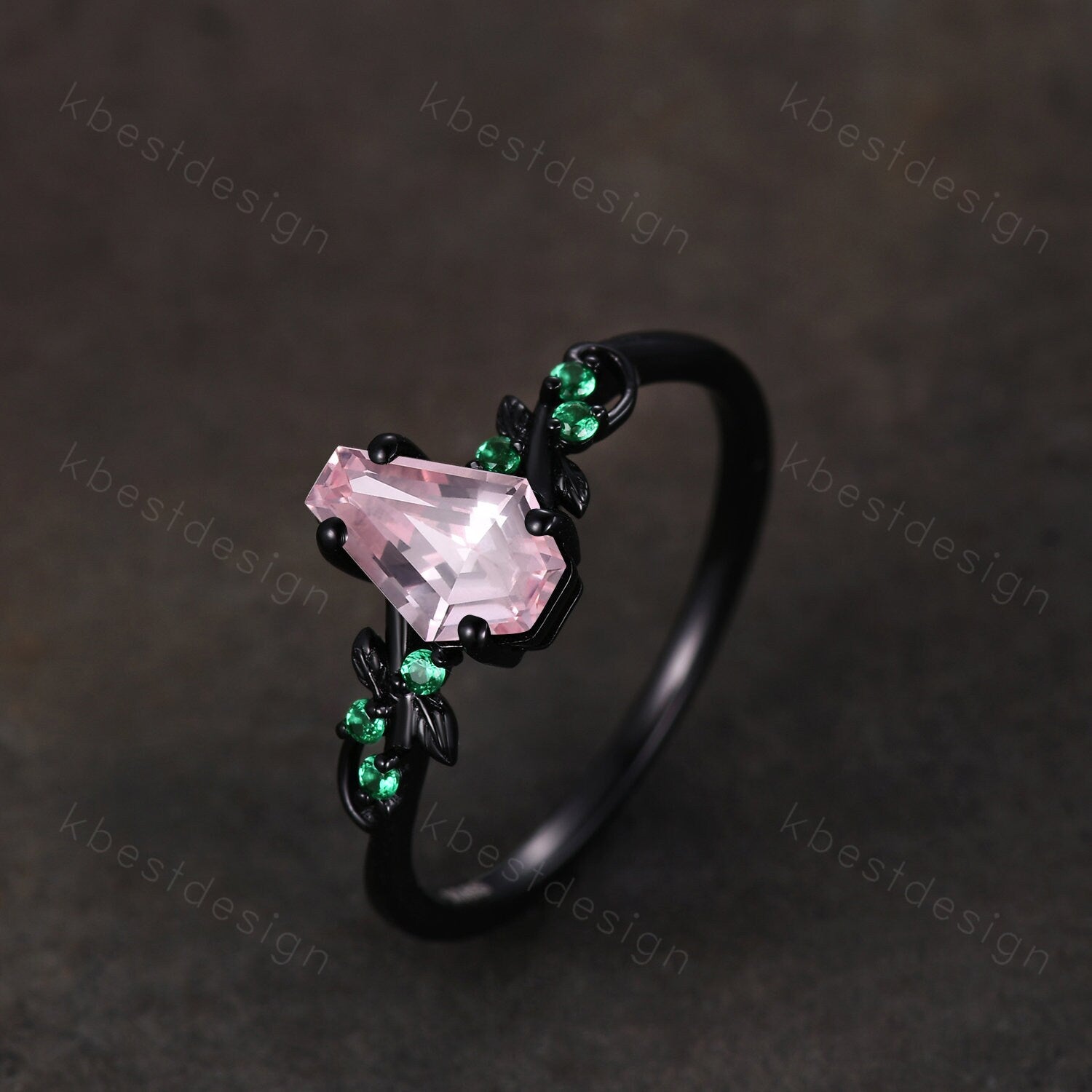 Coffin cut pink sapphire engagement ring Black gold ring Art deco leaf design emerald wedding ring nature inspired ring bridal promise ring