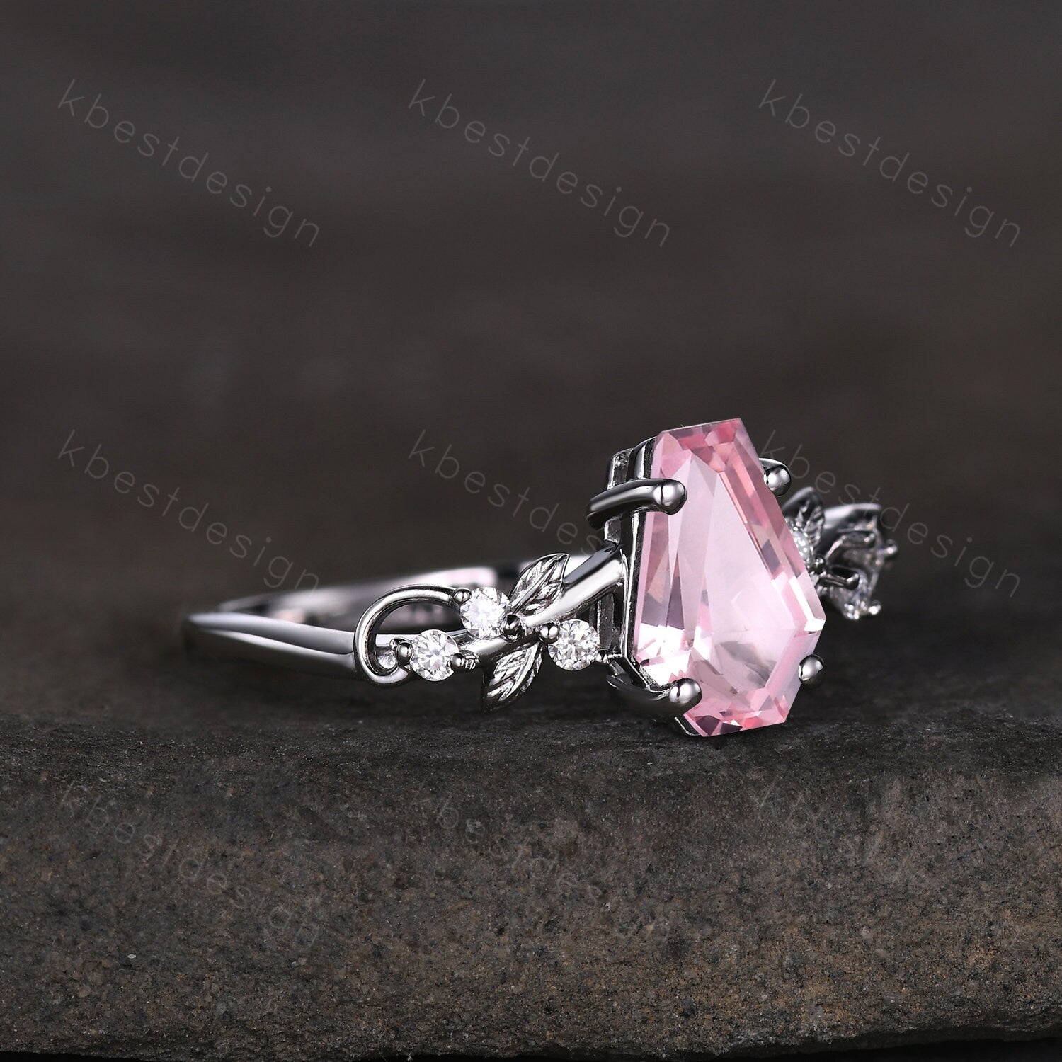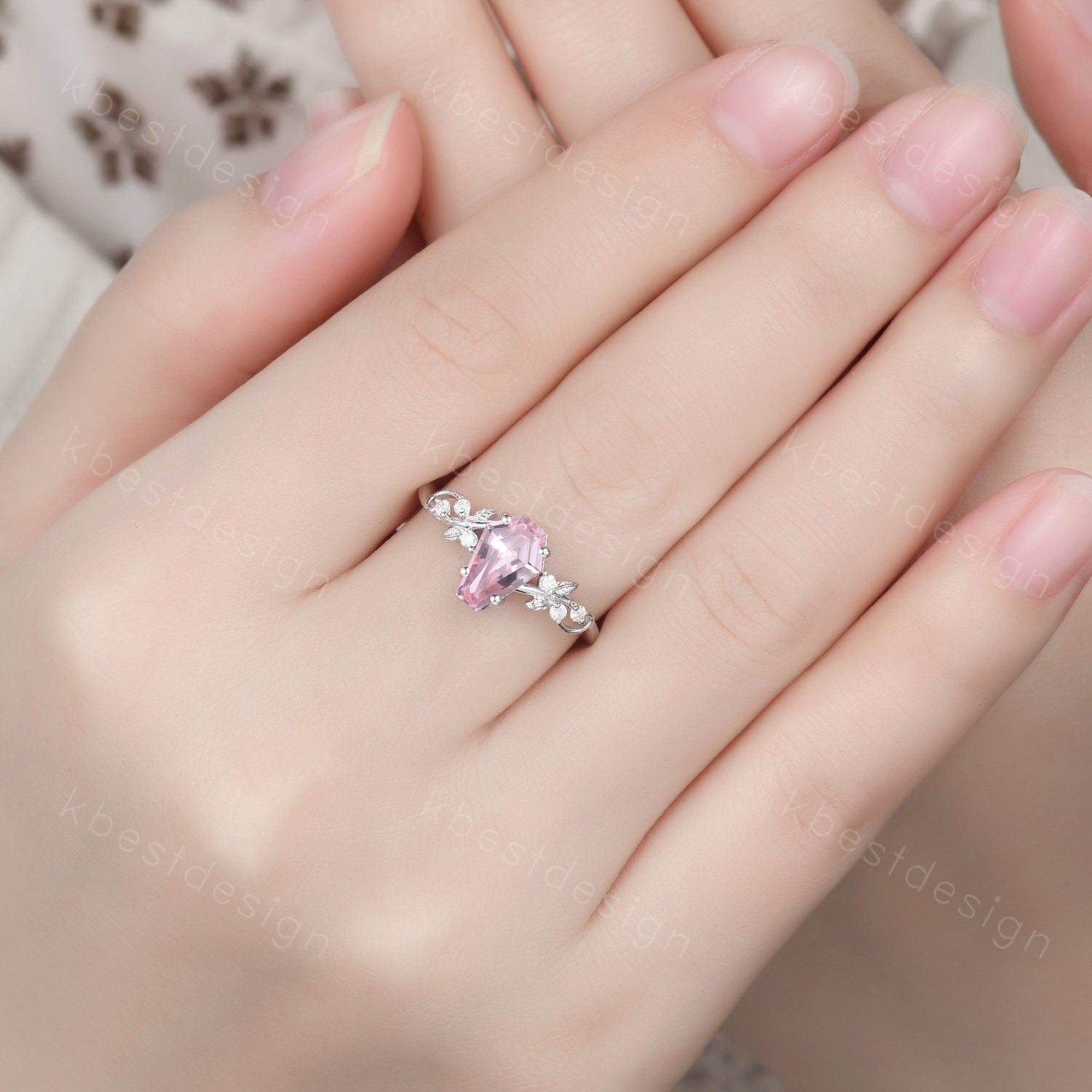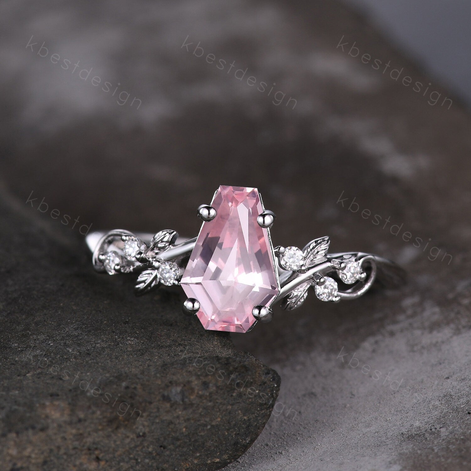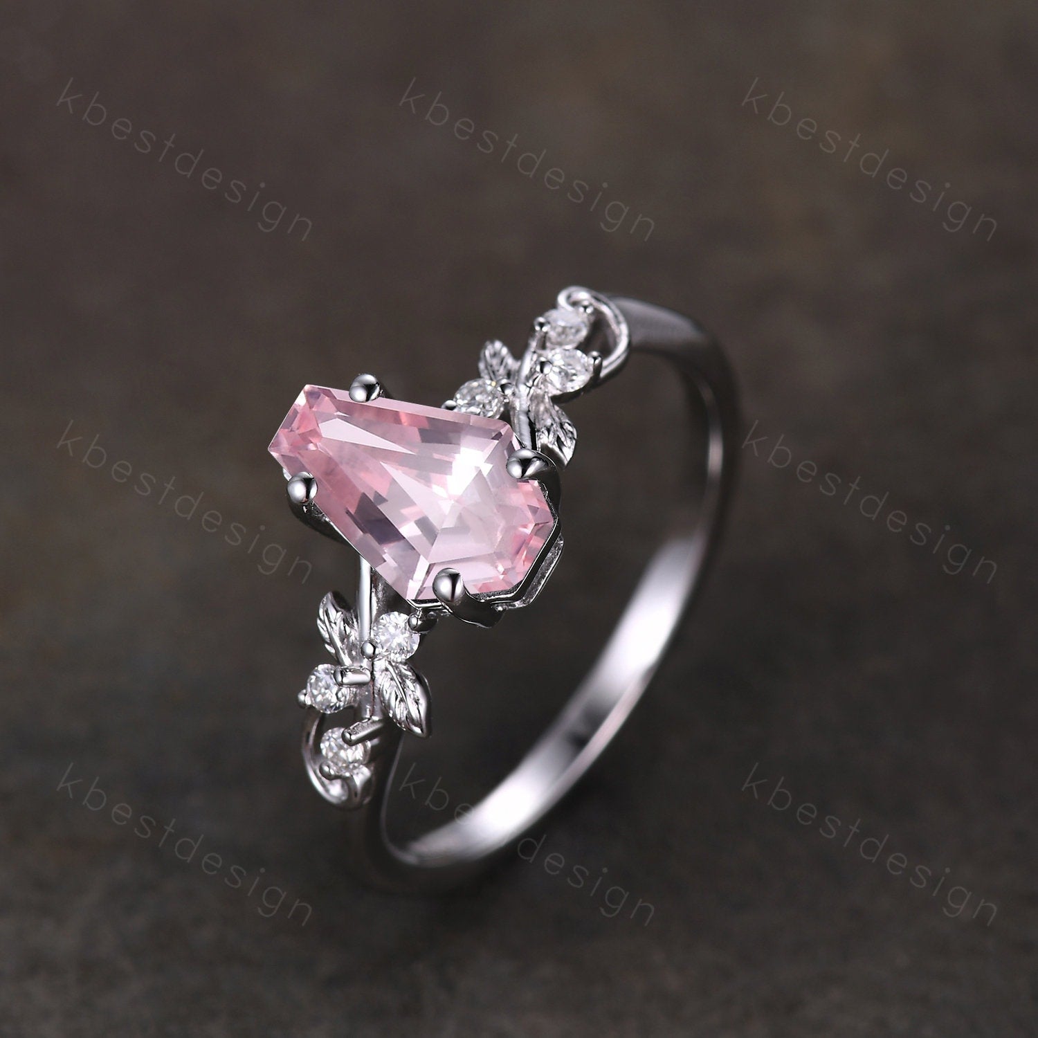 Coffin cut pink sapphire engagement ring silver ring Art deco leaf design moissanite wedding ring nature inspired ring bridal promise ring.