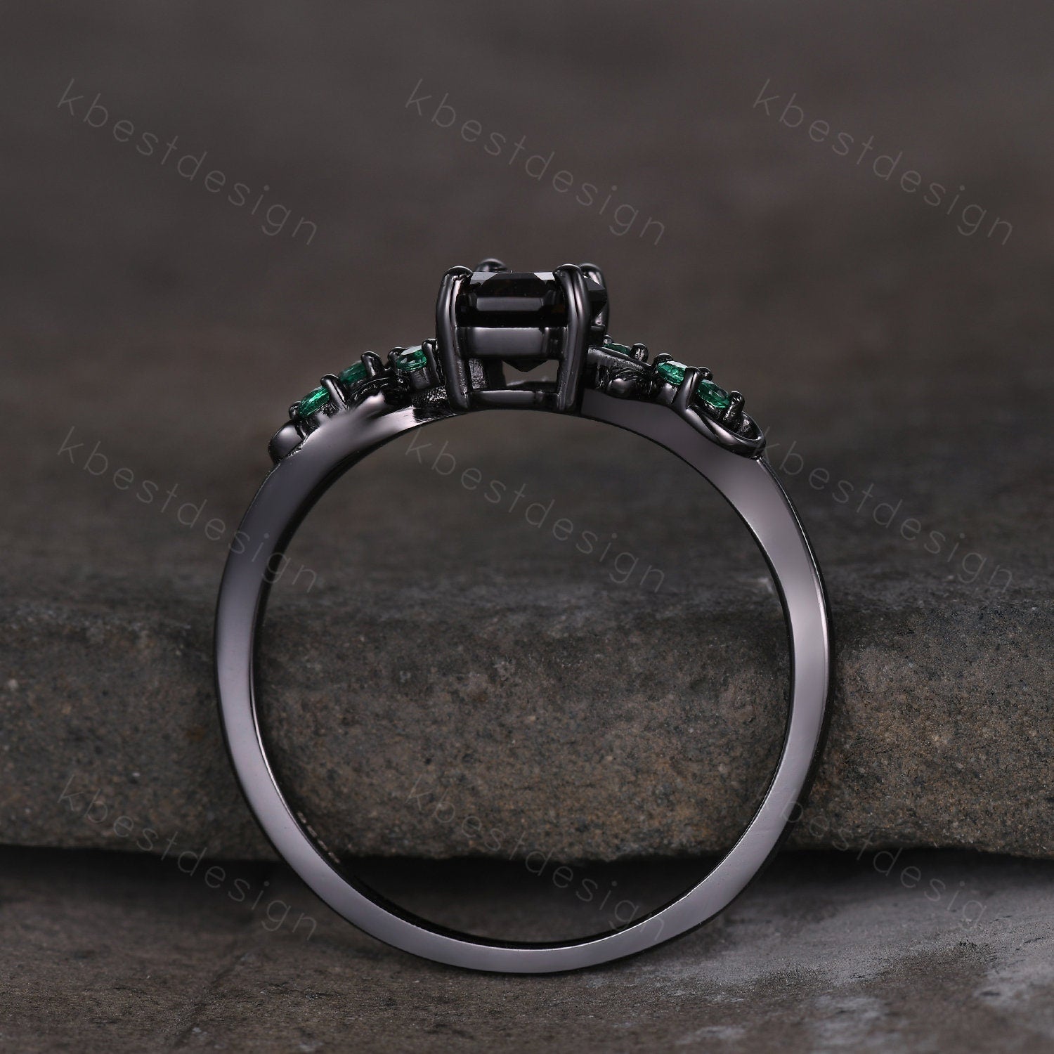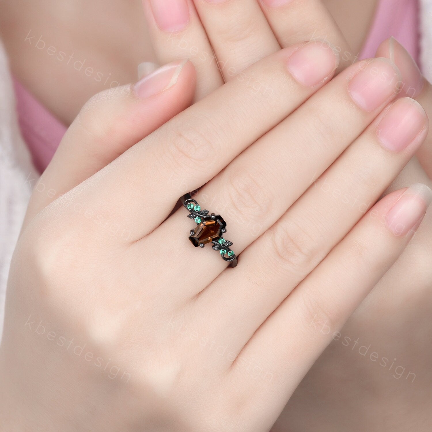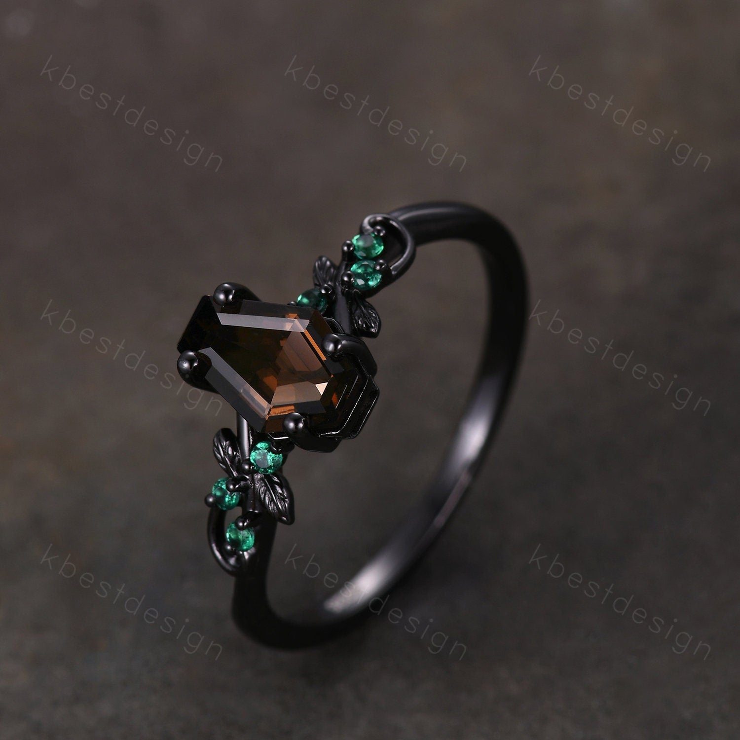 Coffin cut smoky quartz engagement ring Black gold ring Art deco leaf design emerald wedding ring nature inspired ring bridal promise ring.