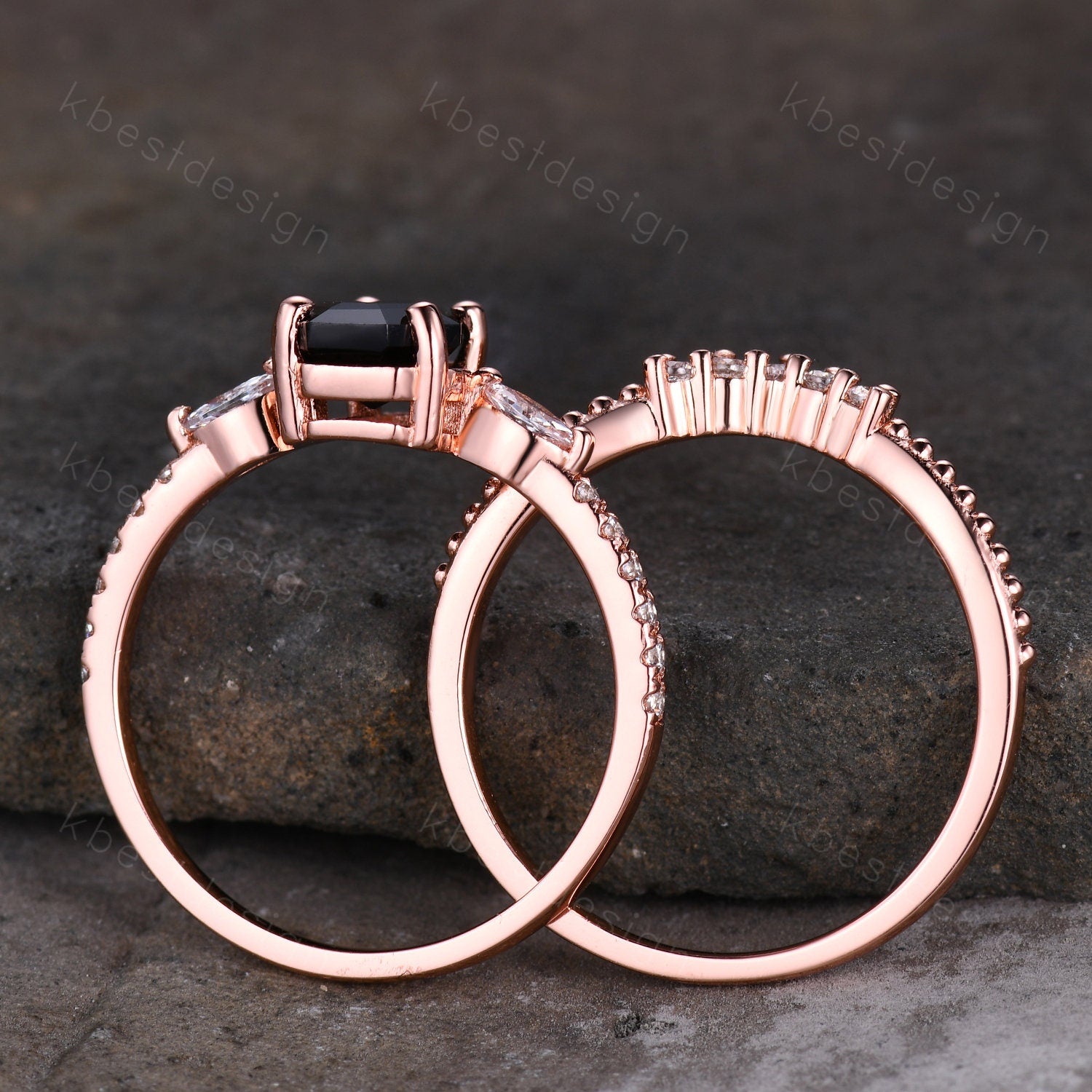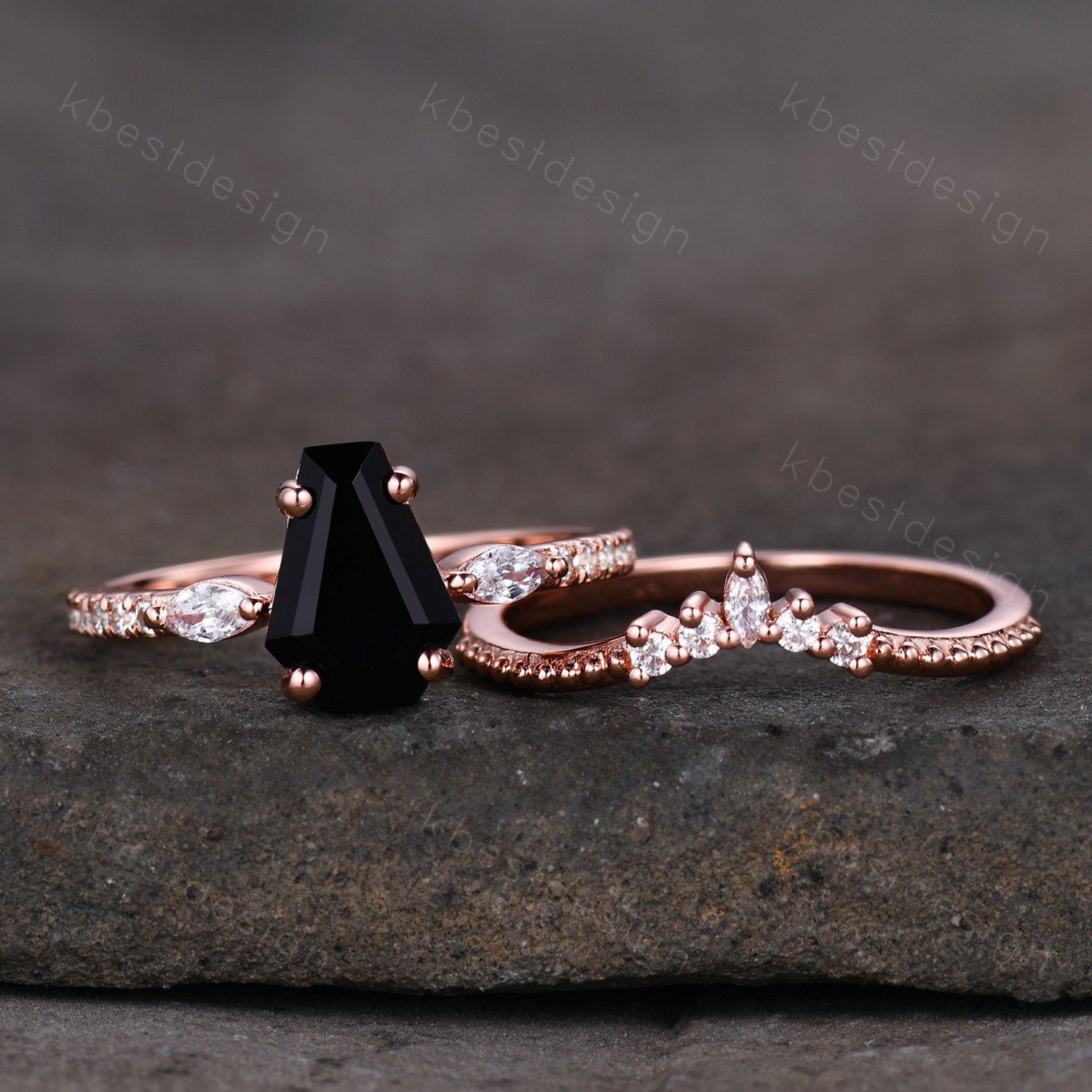 Coffin Shape Black Onyx Engagement Ring Set Vintage Moissanite Cluster Wedding Ring Art Deco Curved Stacking Band Unique Bridal Promise Set