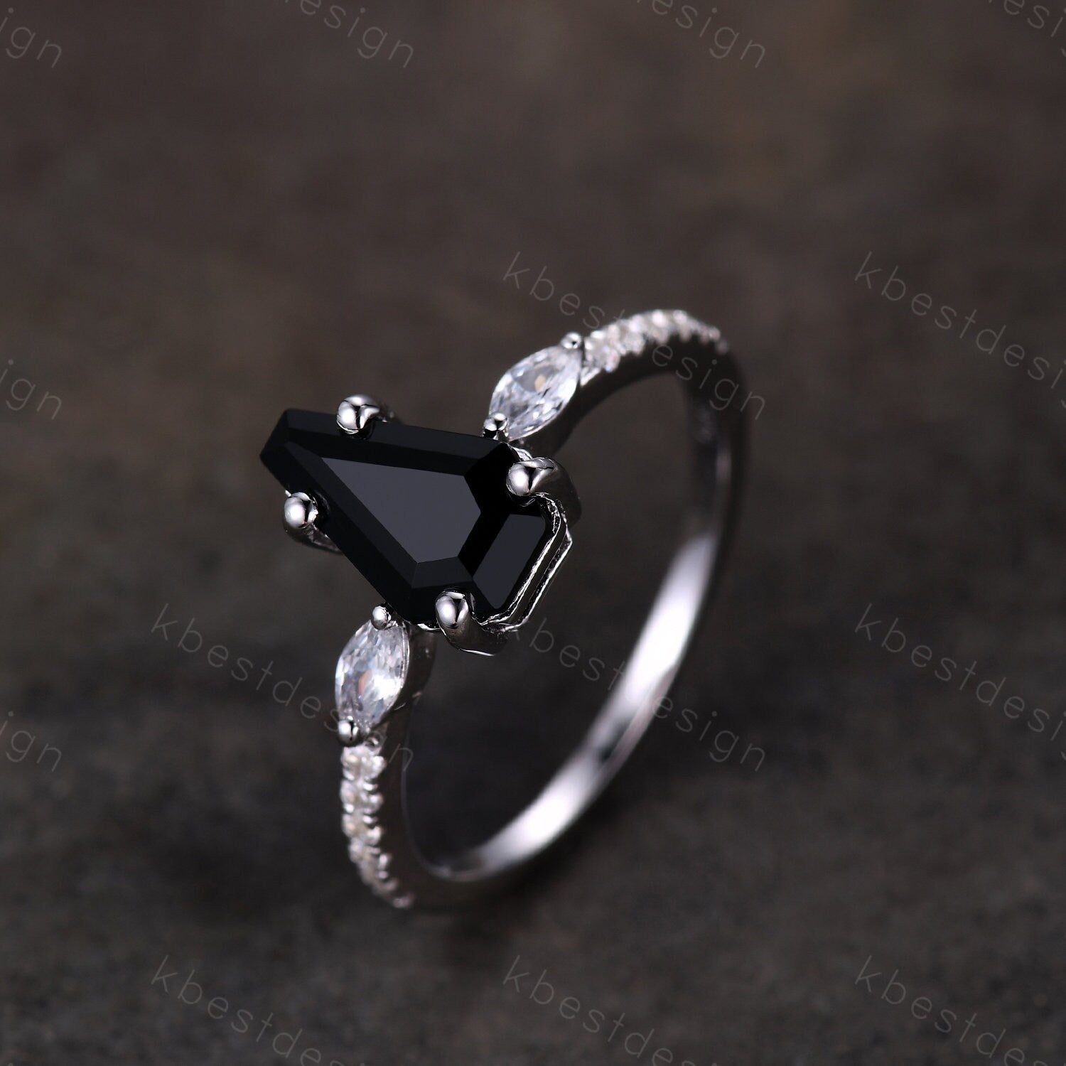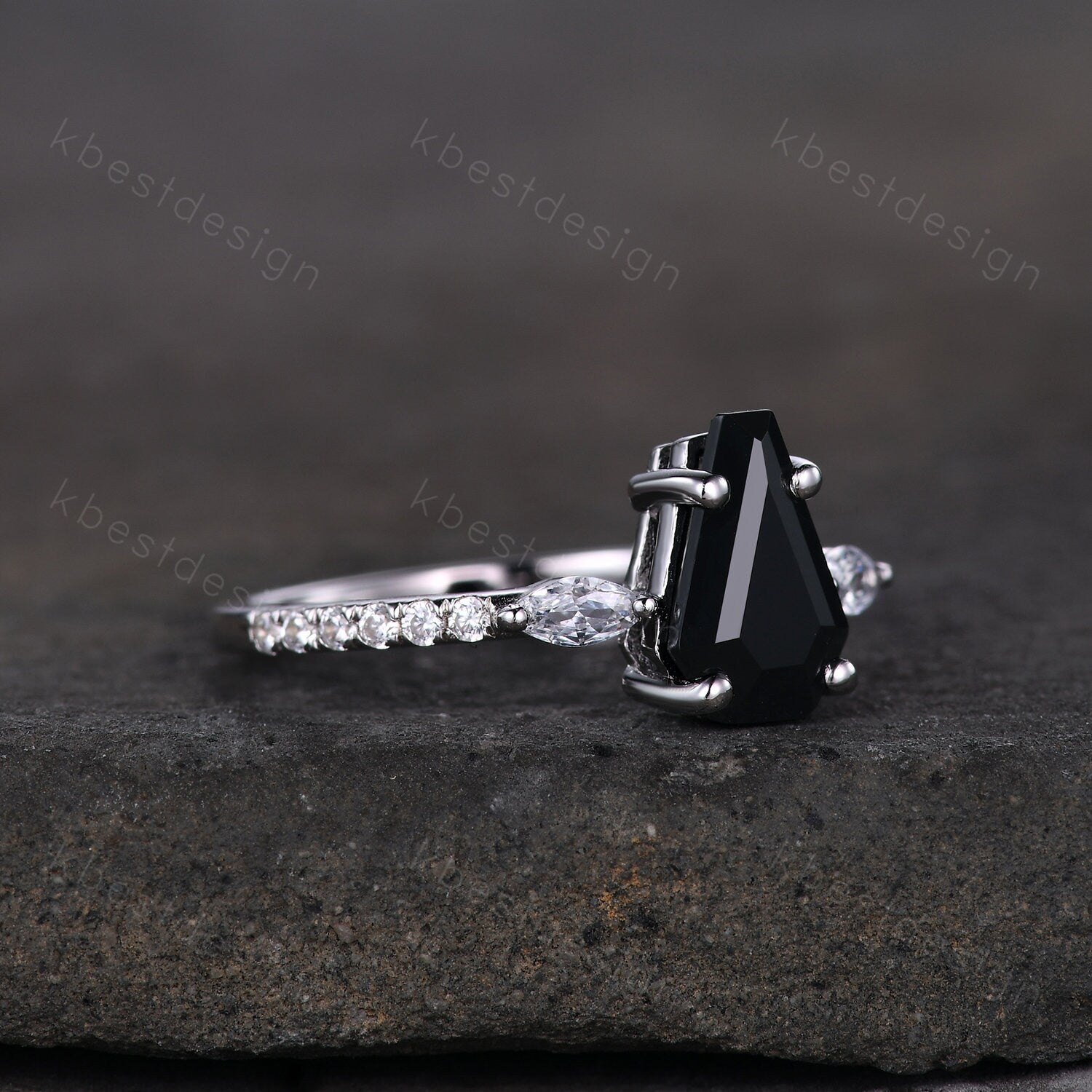 Coffin shaped black onyx engagement ring vintage white gold rings for women art deco marquise cut moissanite ring antique promise ring