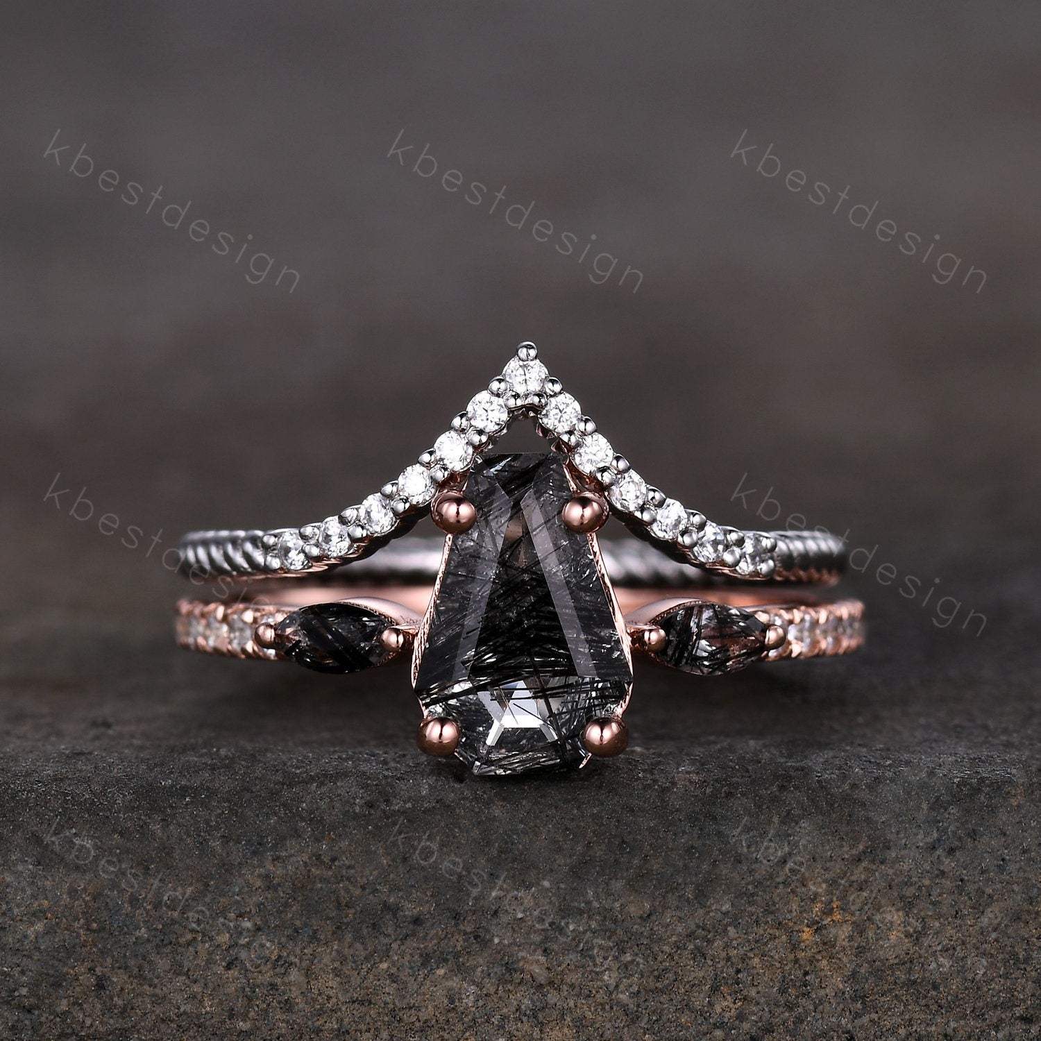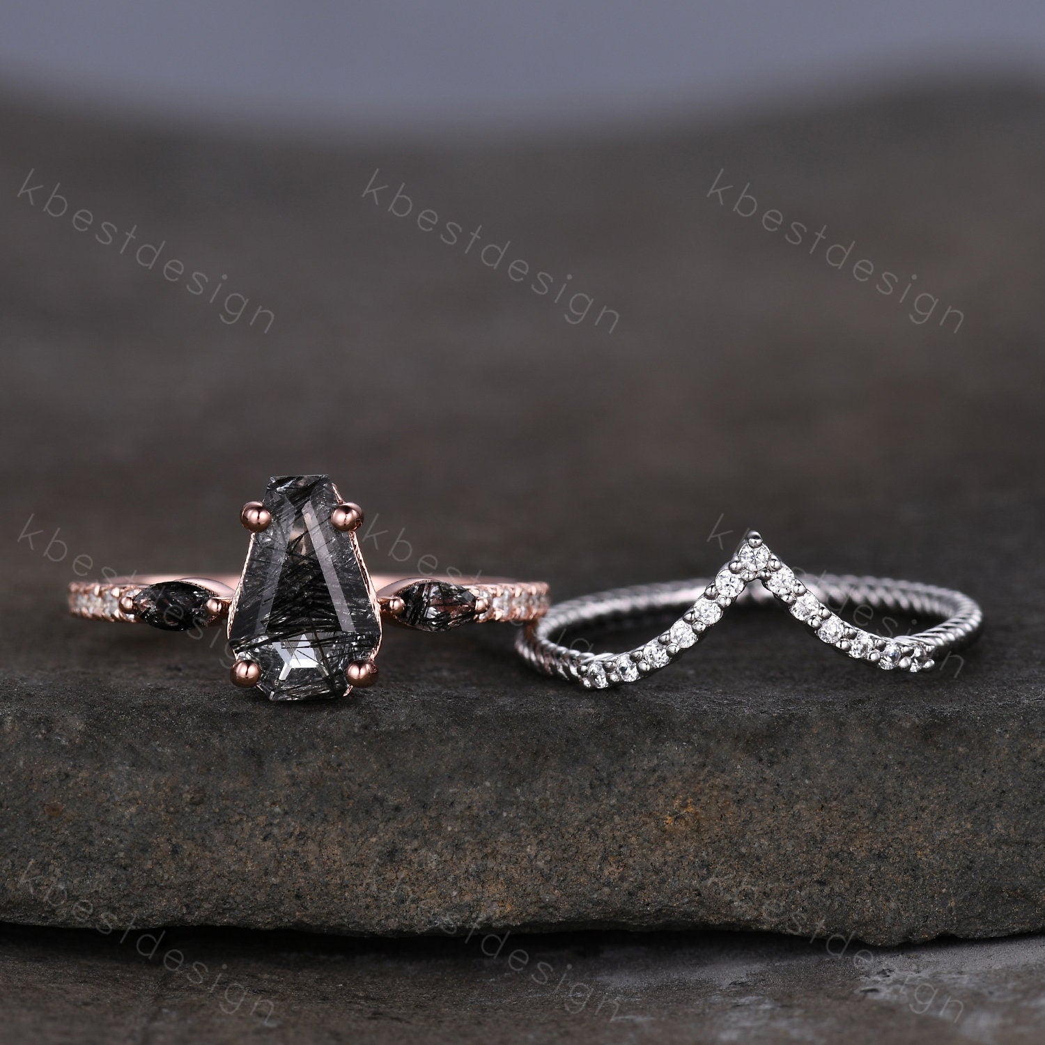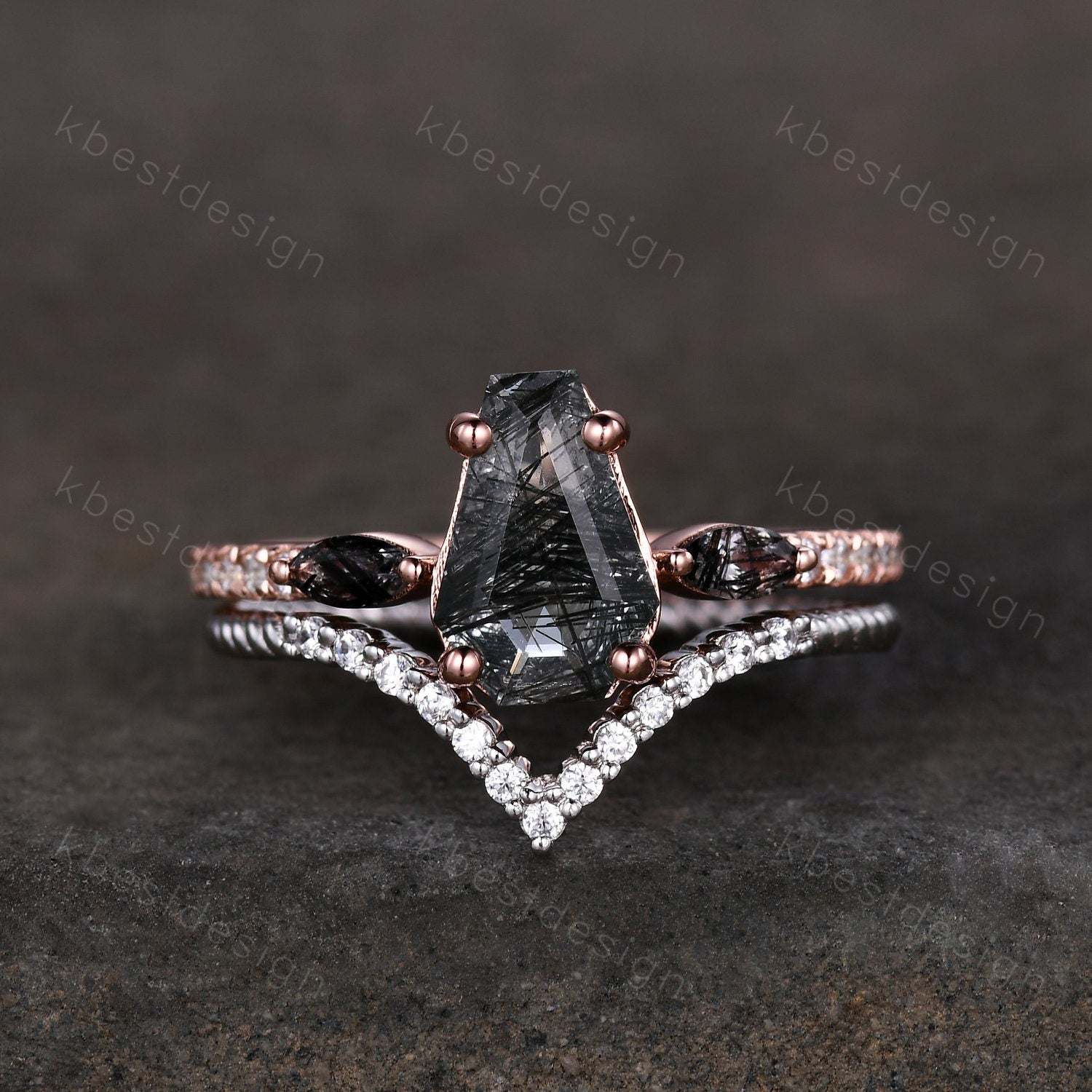 This is a Coffin shaped black rutilated quartz engagement ring set unique curved Moissanite stacking band Rose gold vintage bridal wedding ring set.