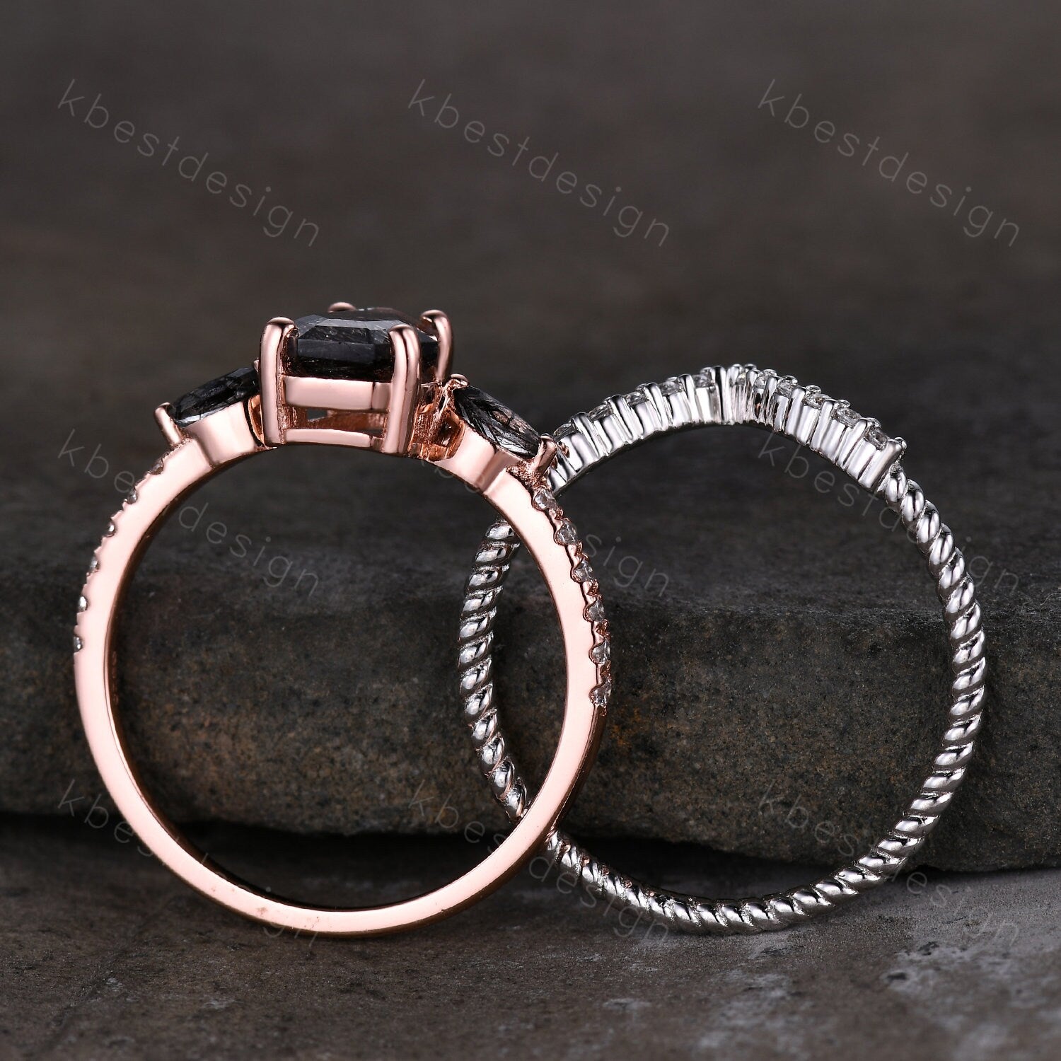 Side stone: Moissanite + Marquise cut black rutilated quartz