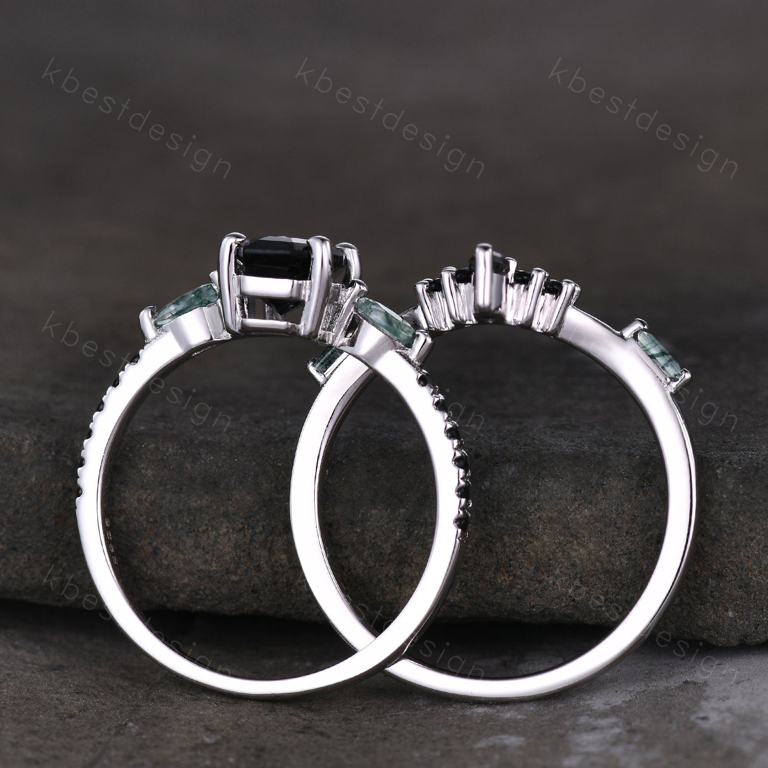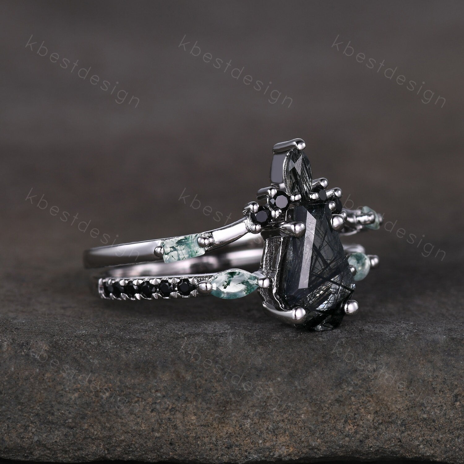 Coffin shaped black rutilated quartz engagement ring set unique curved moss agate wedding ring black ring vintage bridal wedding ring set