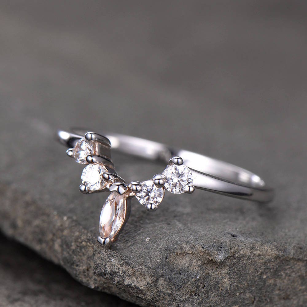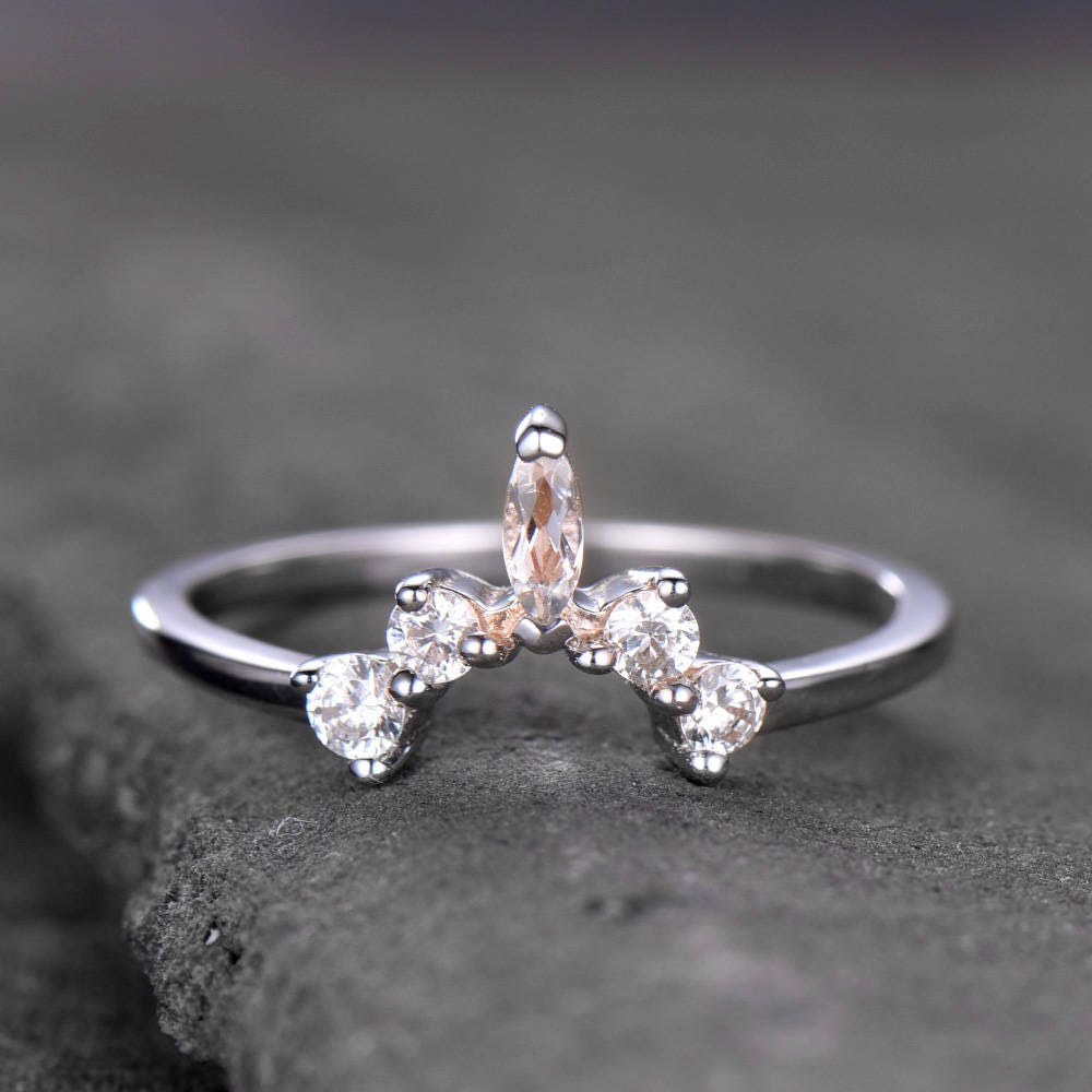 Crown Wedding Band White Topaz Wedding Band Curve Wedding Ring Stacking Ring Chevron Ring White Gold Plated Sterling Silver Anniversary Ring