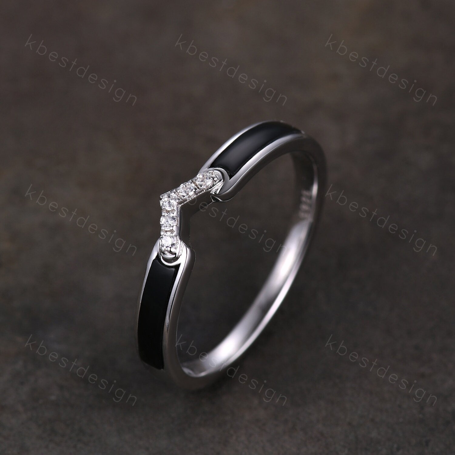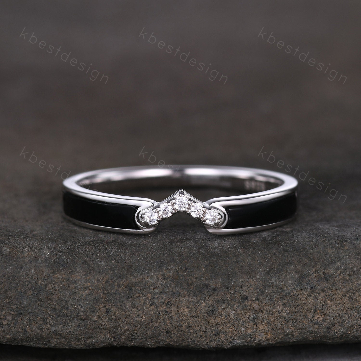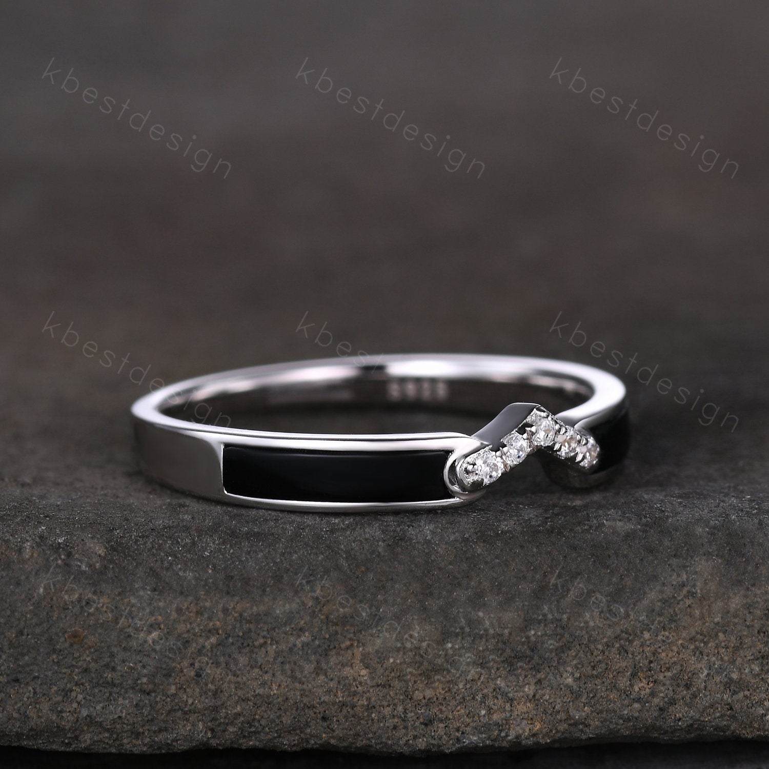 Curved Black Onyx Wedding Band Silver White Gold Ring Unique V Curved Stacking Matching Band Half Eternity Band Anniversary Gift for Her