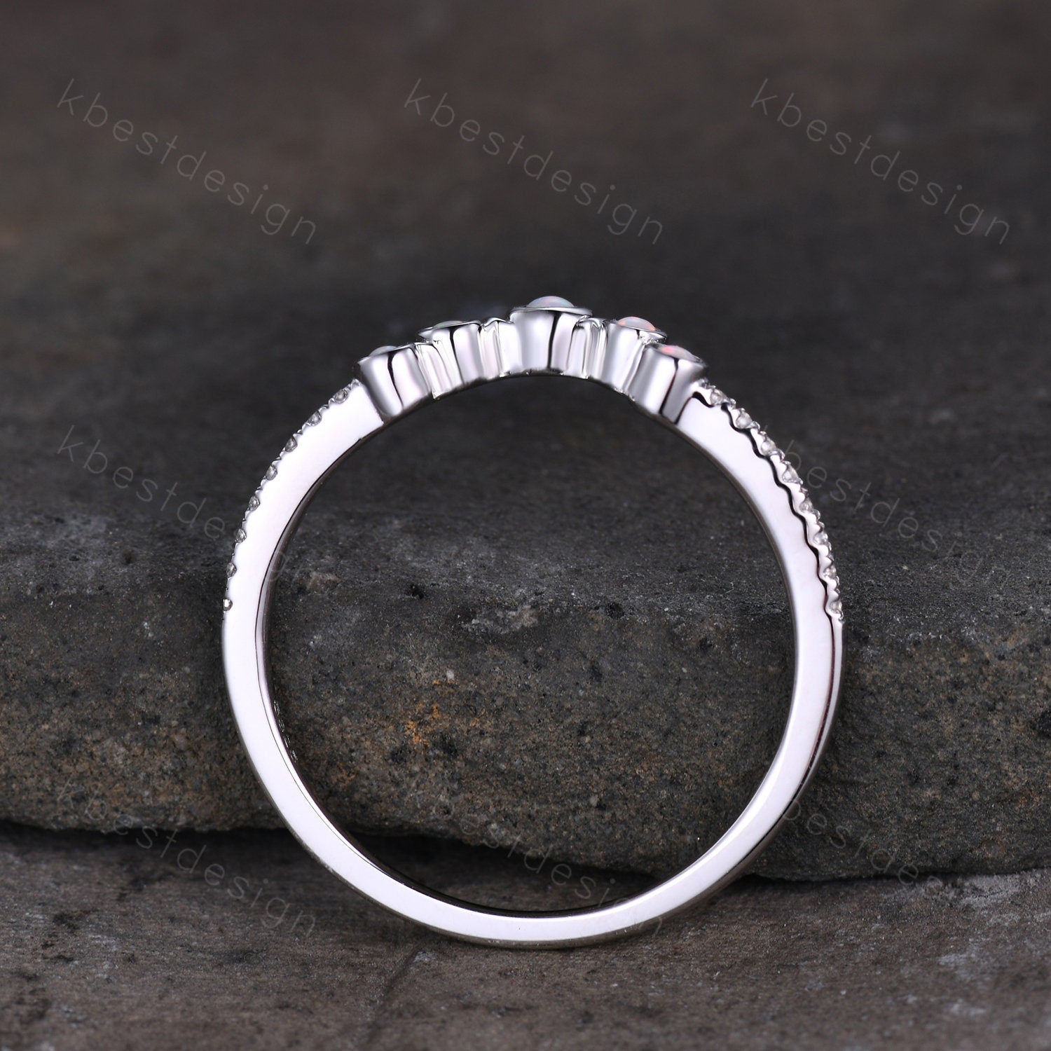 Curved Opal wedding band Unique sterling silver wedding band Half eternity moissanite Stacking matching band Anniversary ring