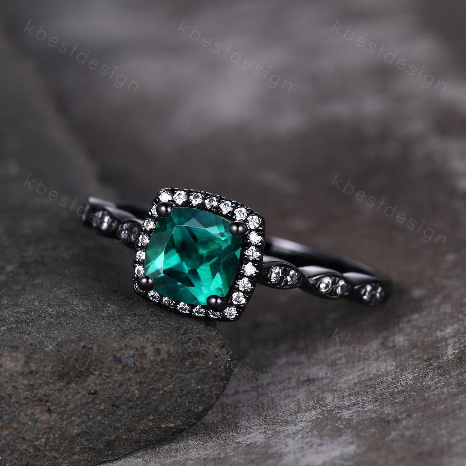 Cushion cut emerald ring black gold vintage emerald engagement ring May birthstone emerald ring art deco moissanite wedding promise ring