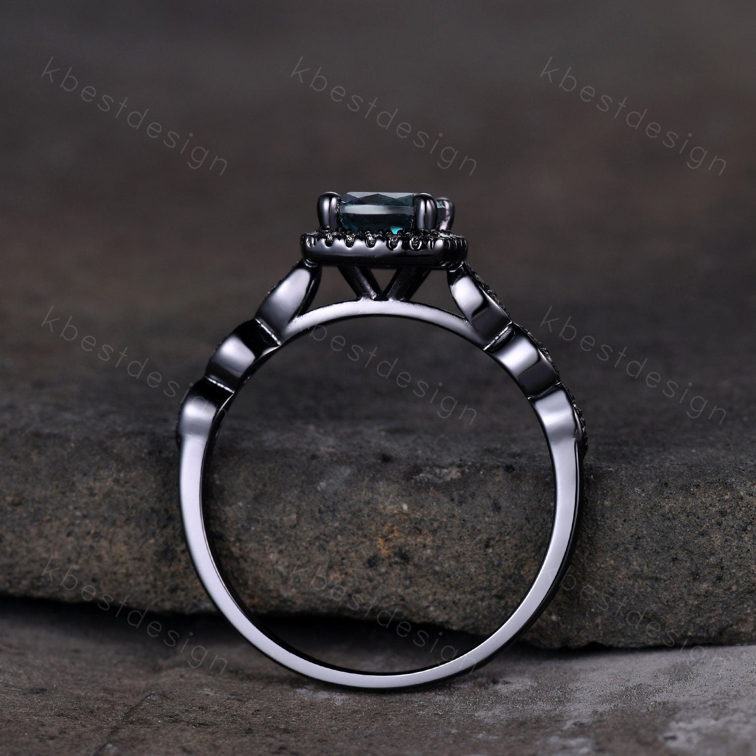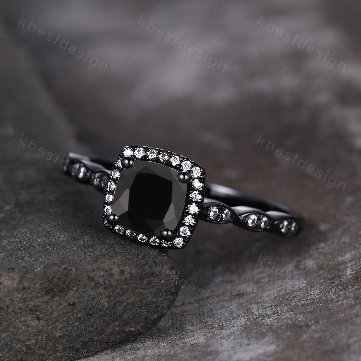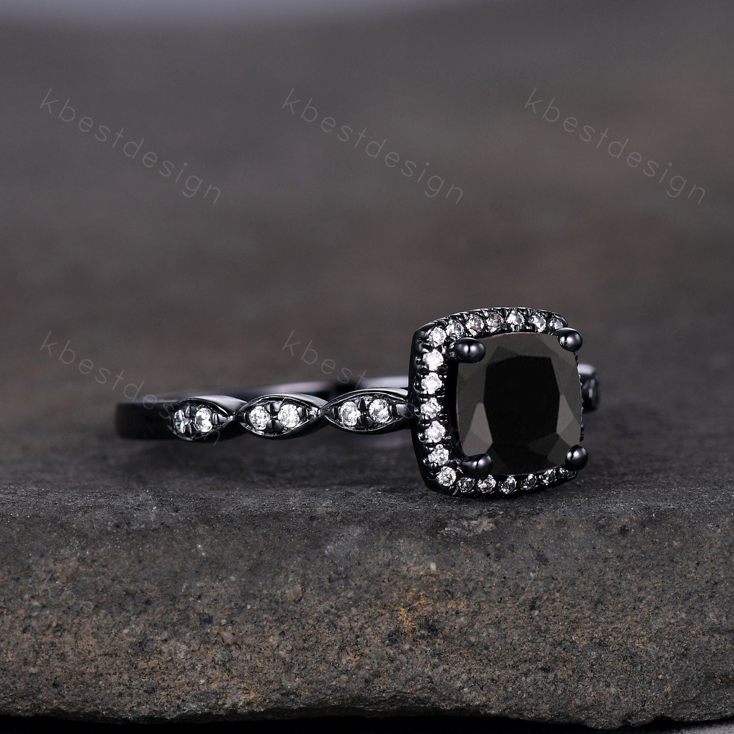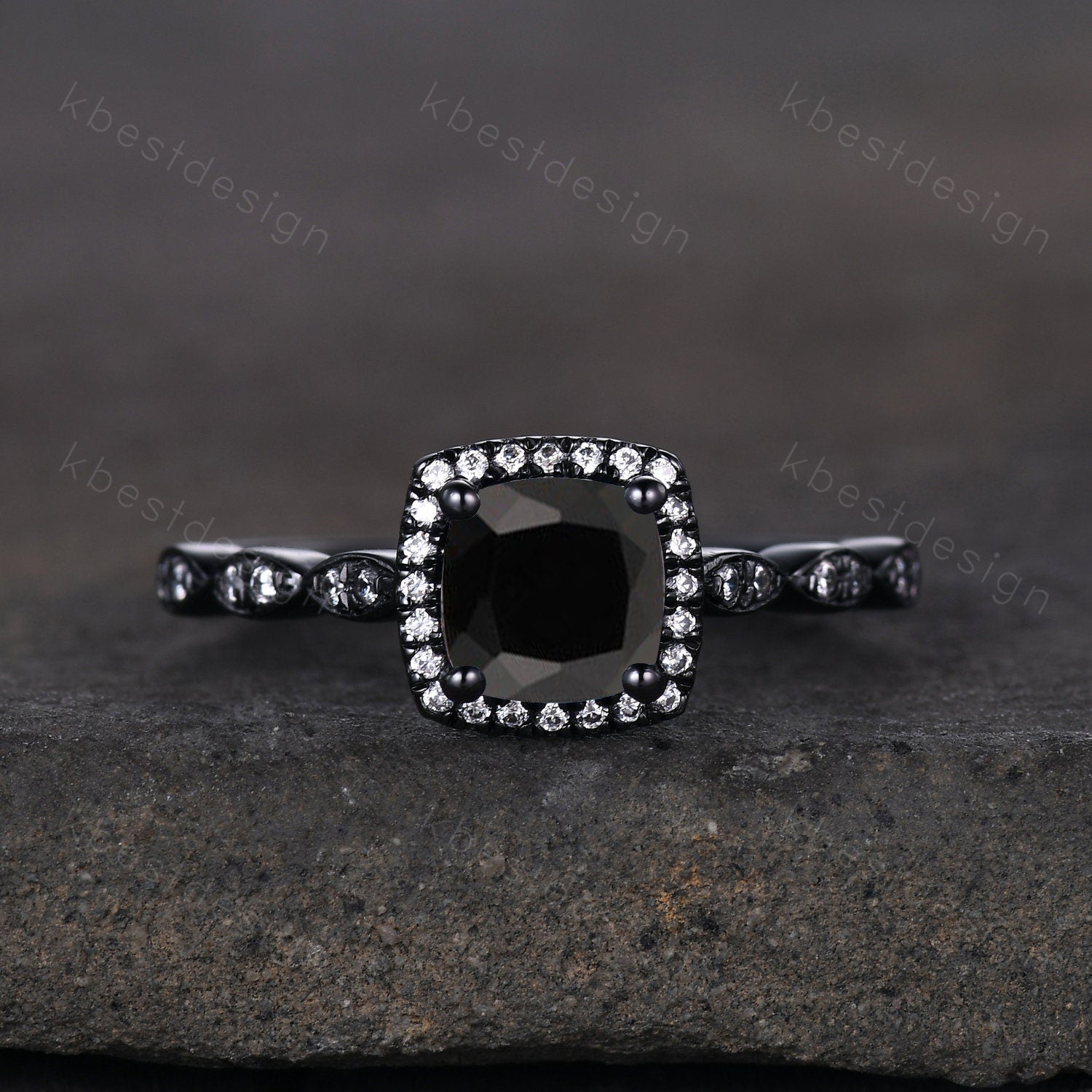 Cushion Cut Natural Black Onyx Engagement Ring Unique Black Gold Ring Vintage Halo Engagement Ring Art Deco Anniversary gift for women