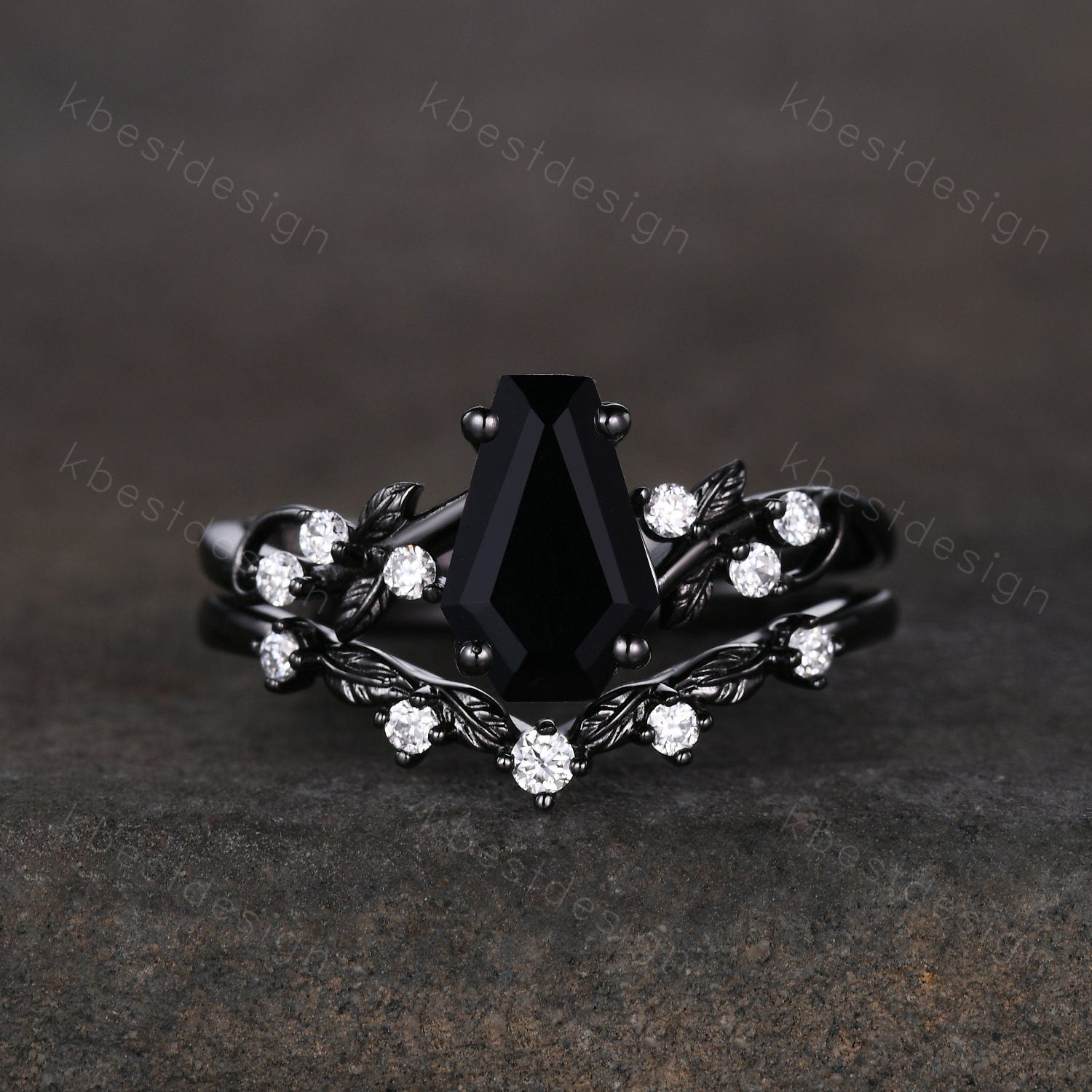 Vintage coffin cut black onyx engagement ring set black gold twig leaf moissanite ring nature branch ring unique bridal wedding ring set