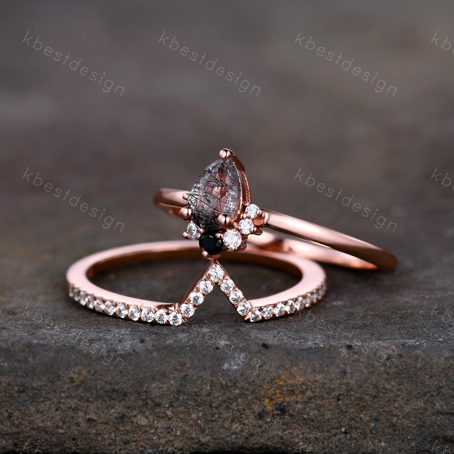 This is a delicate Black Quartz Rutilated engagement ring set in rose gold. Dainty Black Rutilated Quartz Engagement Ring Set Rose Gold Art Deco Moissanite Stacking Band Minimalist Ring Unique Wedding Bridal Ring Set.