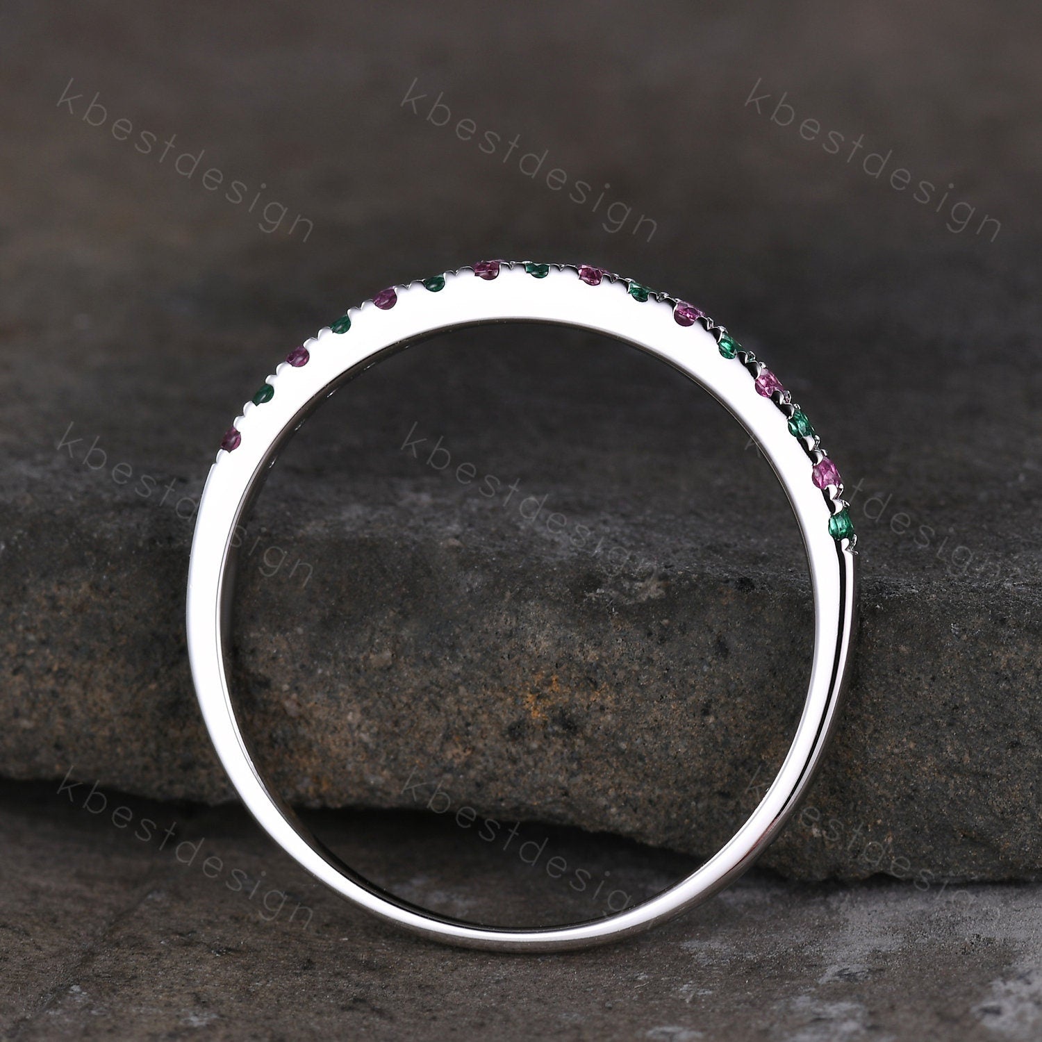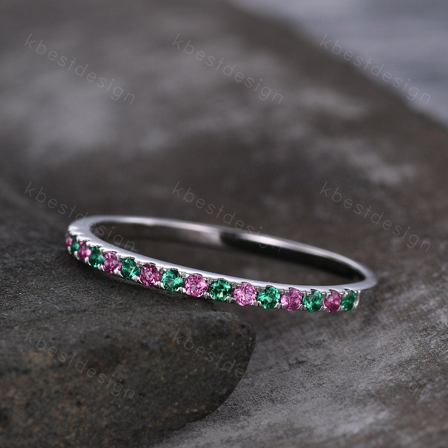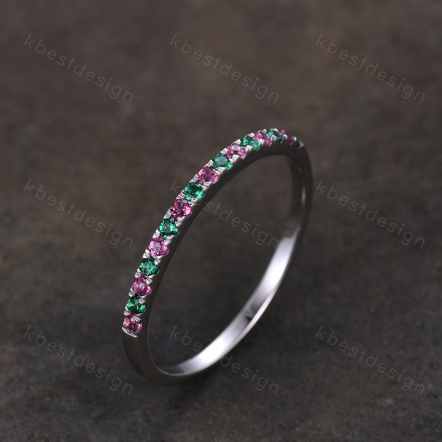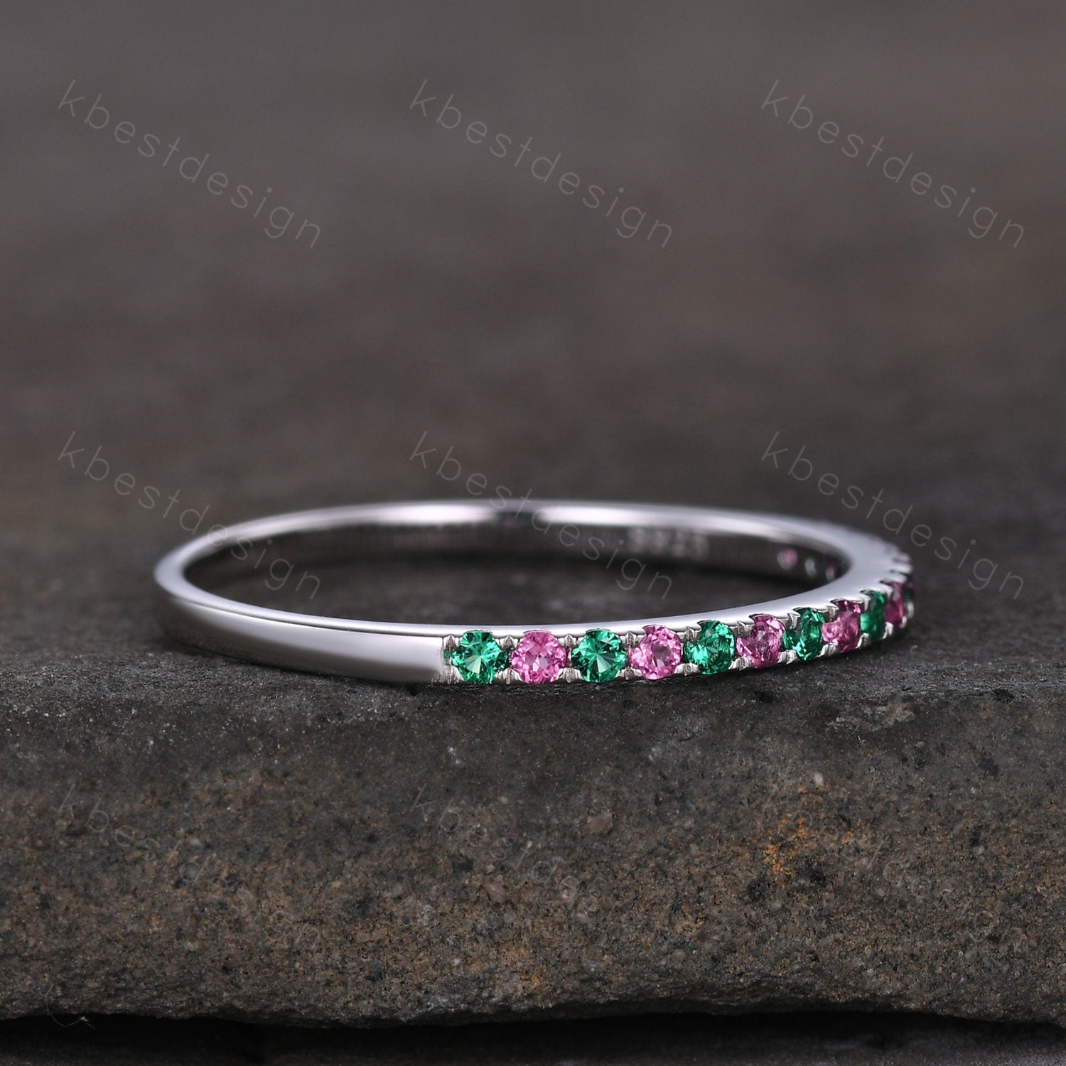 This is a Dainty emerald and pink tourmaline wedding band minimalist half eternity silver wedding ring Art deco micro pave anniversary ring. Perfect for Engagement & Wedding,Christmas,Birthday,New Year gift. :)