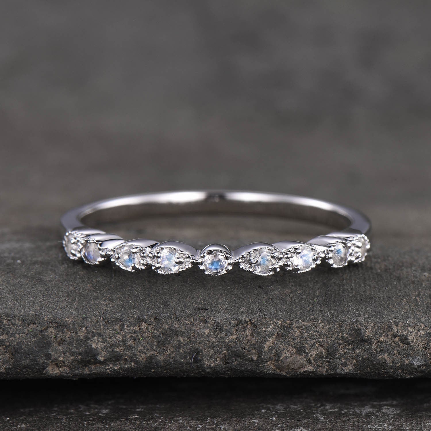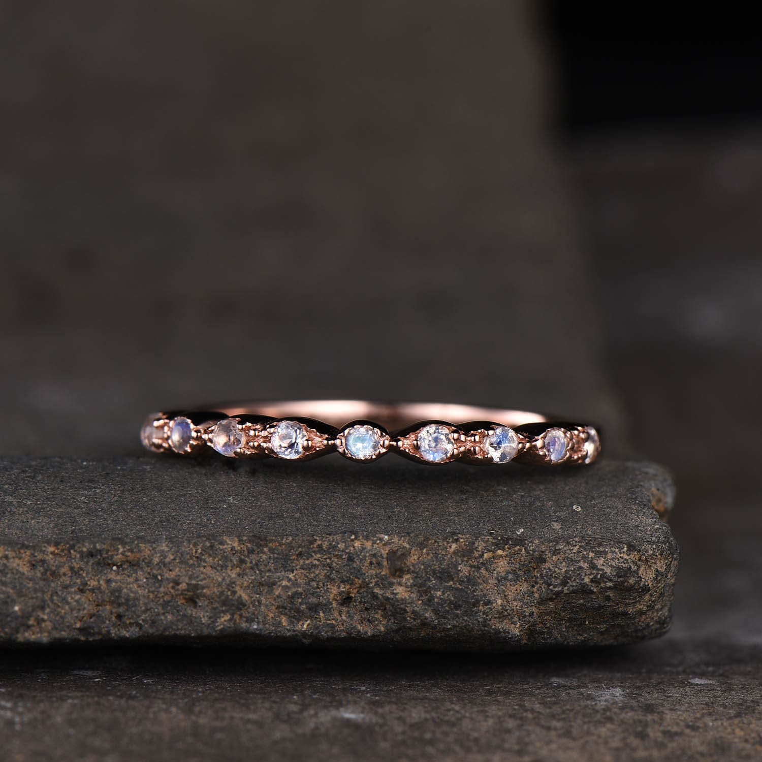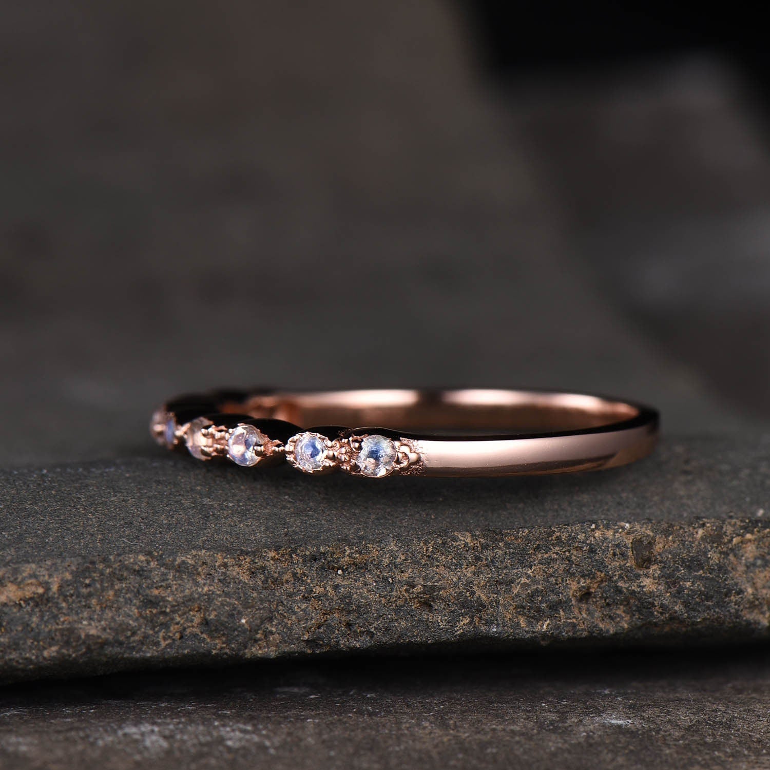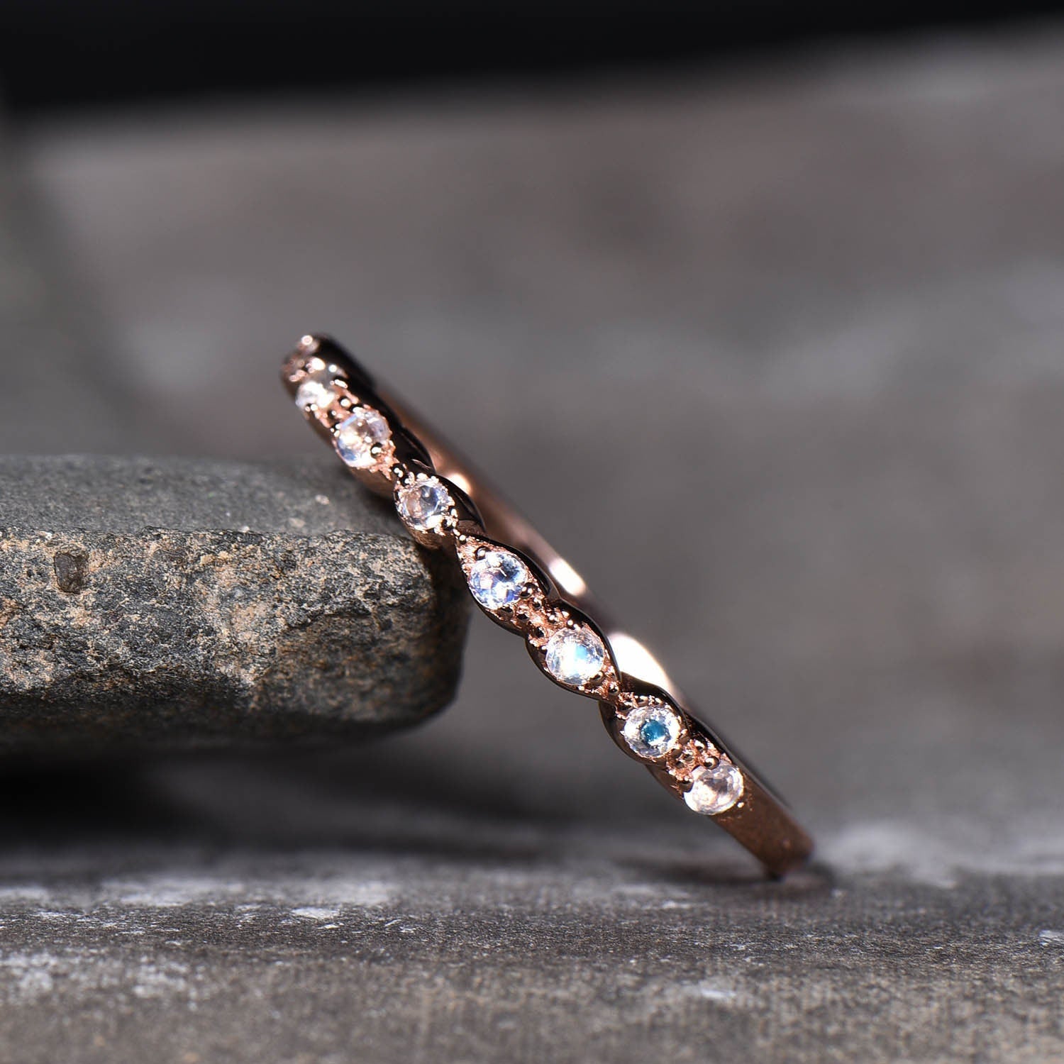 Dainty Moonstone Ring, Rainbow Moonstone Wedding Band, Genuine Gemstone, Stacking Ring, Delicate Ring Rose Gold, Half Eternity Band