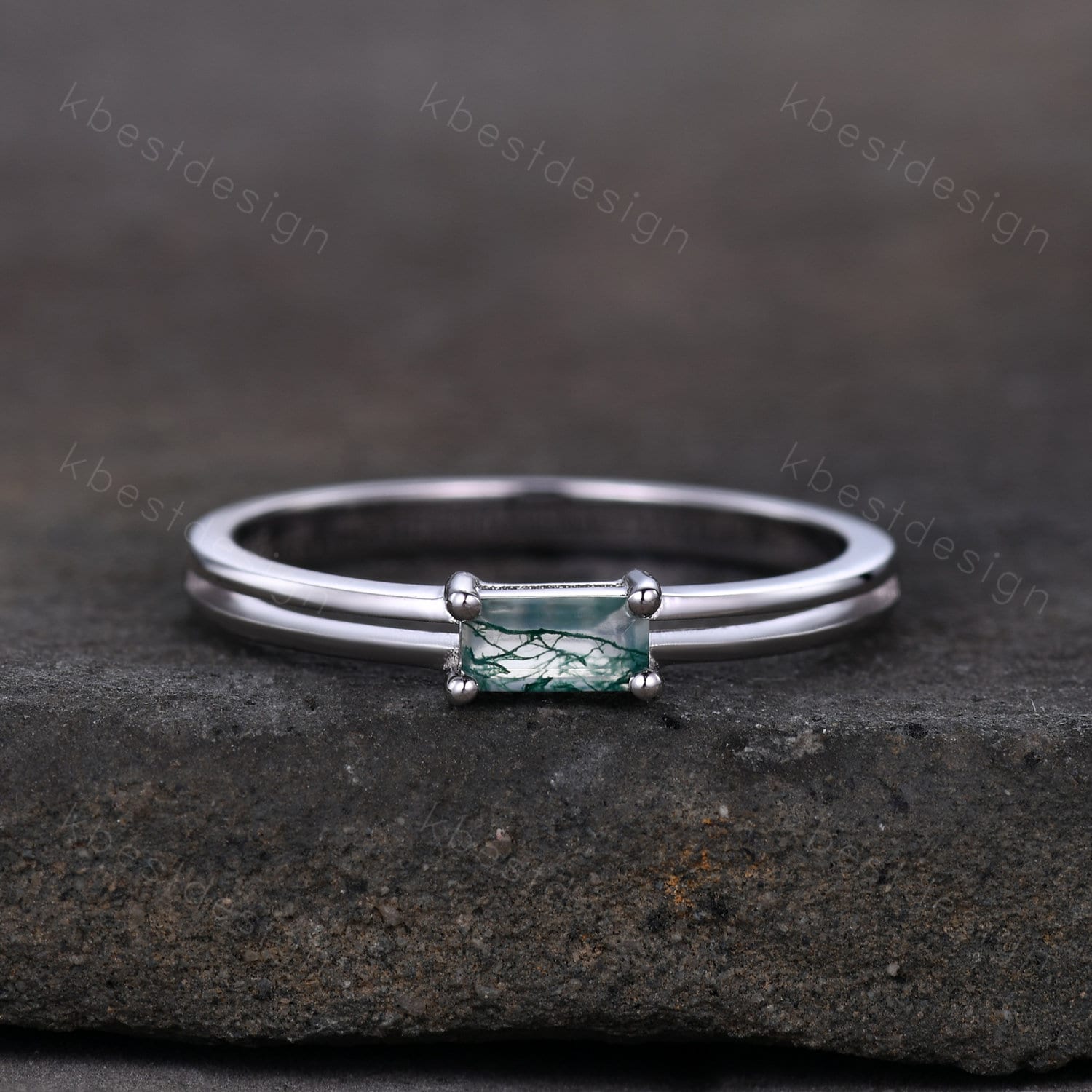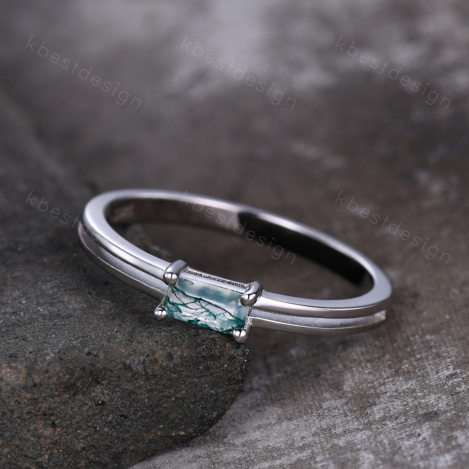 Dainty Moss Agate Engagement Ring Unique Split Shank Ring Sterling Silver Baguette Green Agate Ring Minimalist Promise Anniversary Gift