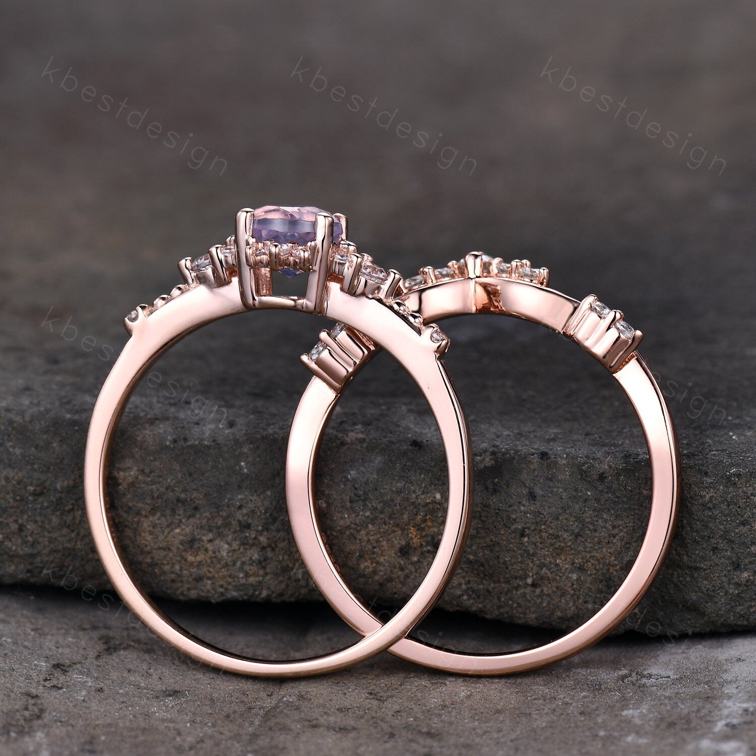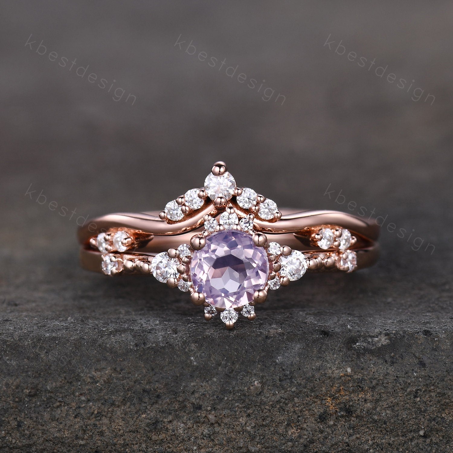 Dainty Rose Gold Lavender Amethyst Engagement Ring Set Unique Art Deco Amethyst Ring For Women Vintage Curved Wedding Bridal Promise Ring
