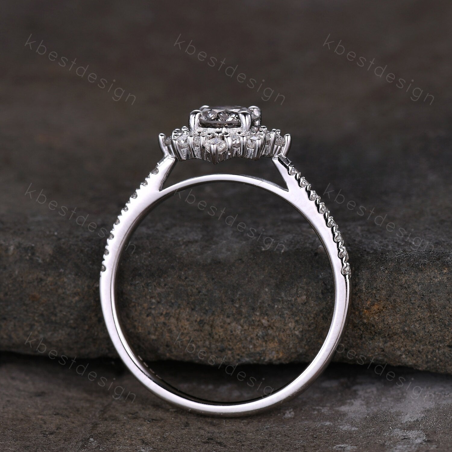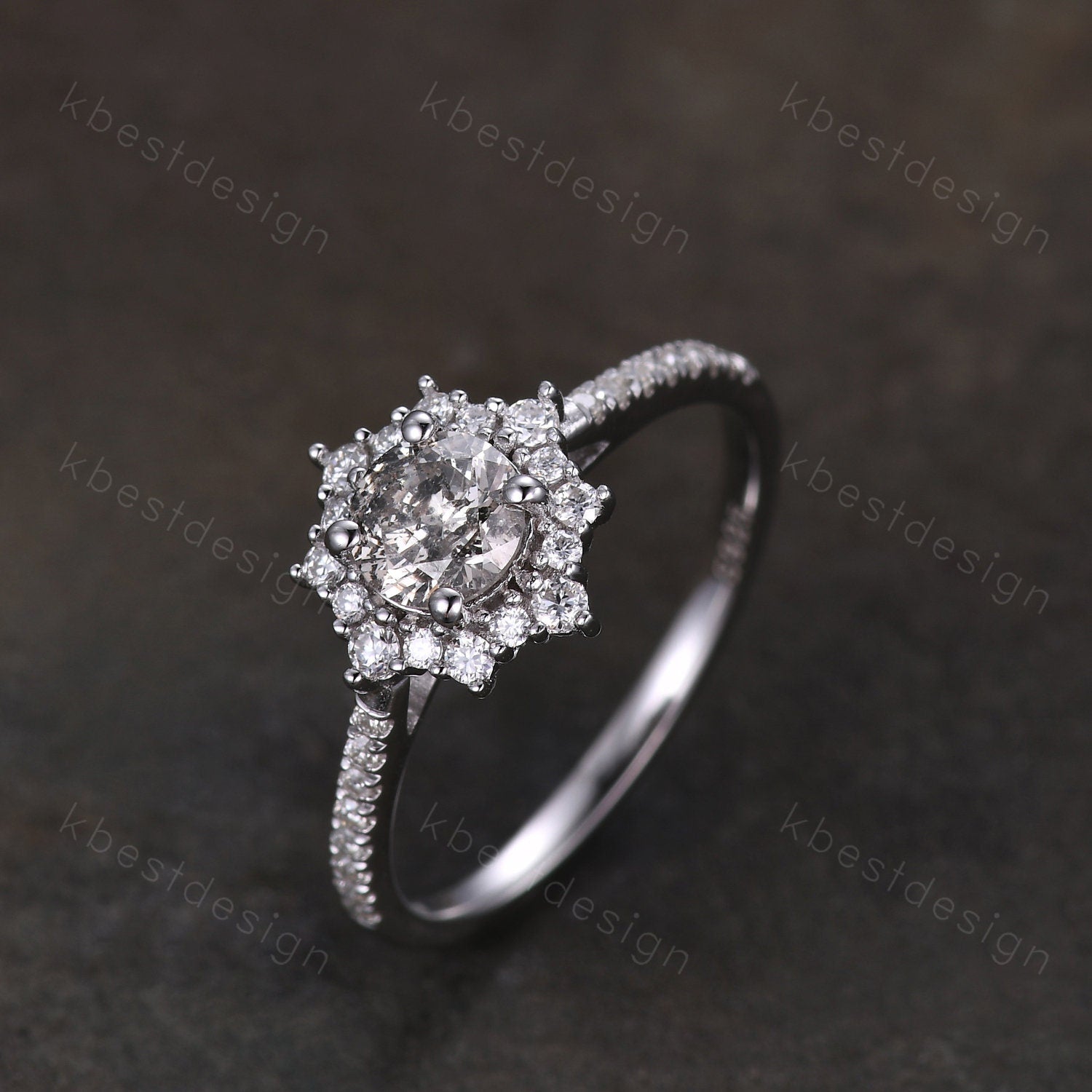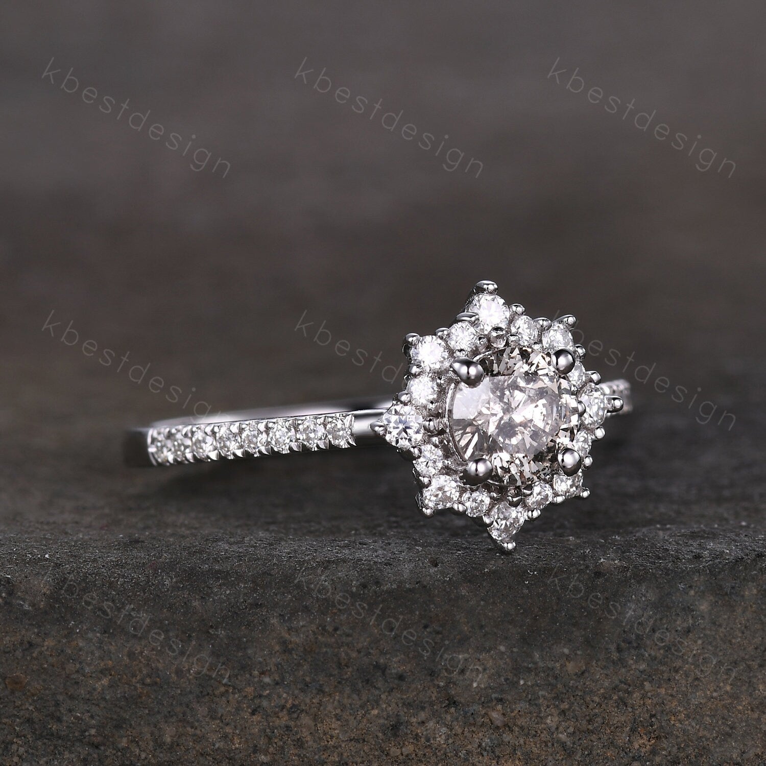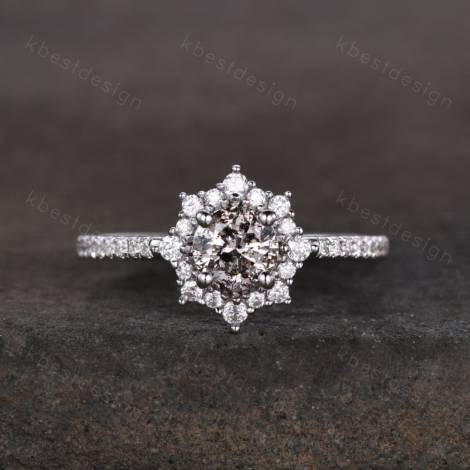 Dainty Salt and pepper diamond engagement ring unique diamond halo engagement ring art deco Bridal Wedding anniversary gift for women