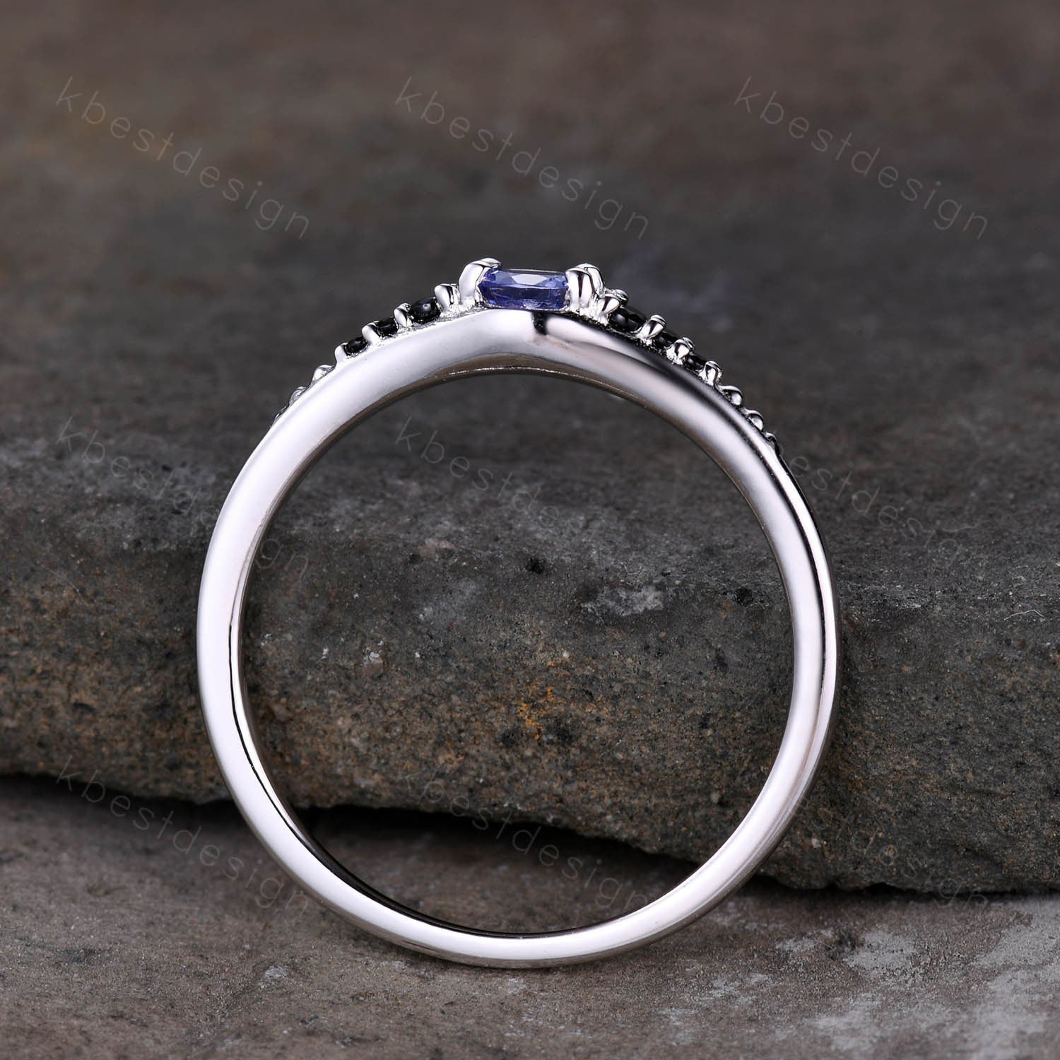 Dainty Tanzanite Wedding Ring Sterling Silver Black Diamond Women Wedding Band Delicate Ring Stackable Band Anniversary Gift for Her