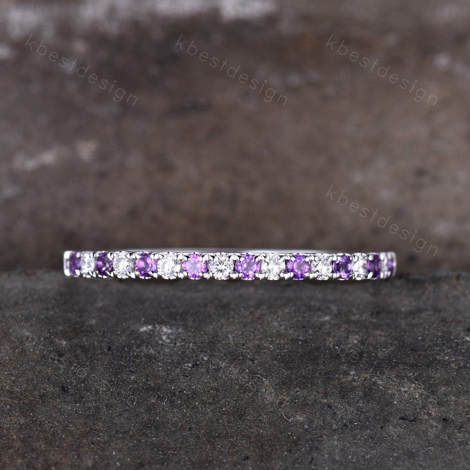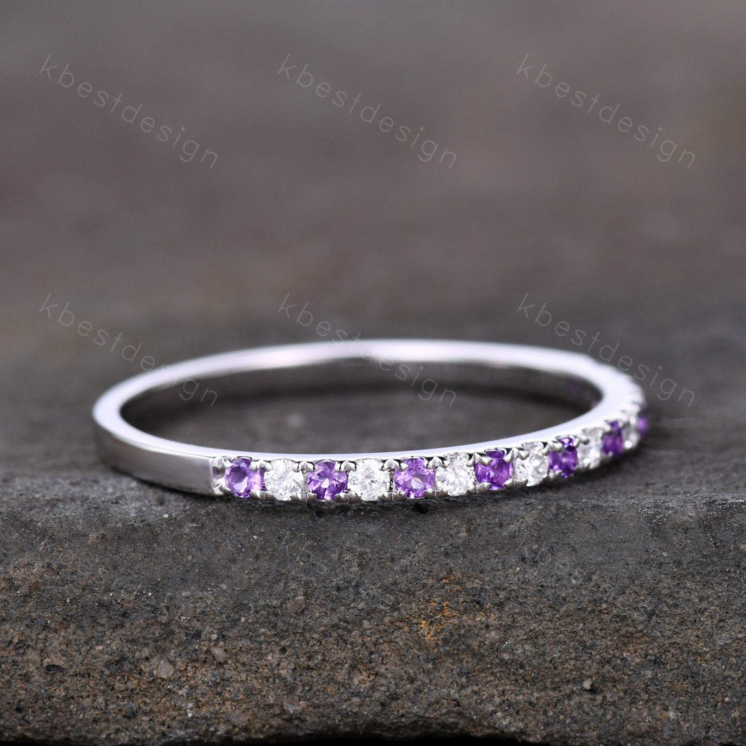This is a dainty natural amethyst + Moissanite Wedding Band in 925 sterling silver. Delicate Amethyst Wedding Band Silver Amethyst Moissanite Band Minimalist Stackable Ring Half Eternity Wedding Band Promise Anniversary Ring