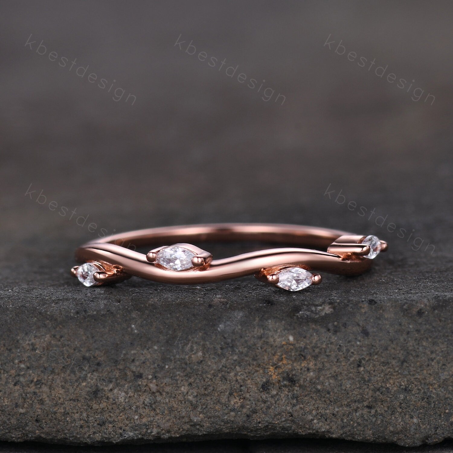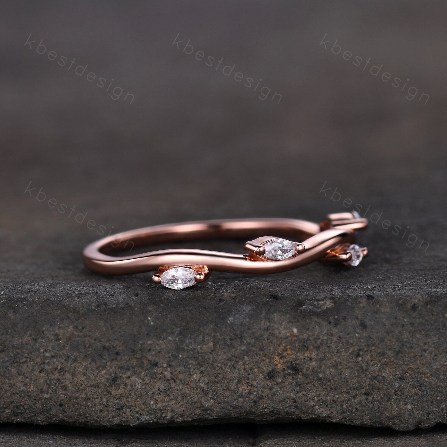 Delicate Leaf Style Moissanite Wedding Band Rose Gold Wave Wedding Ring Unique Marquise cut Moissanite Stacking Band Anniversary Ring