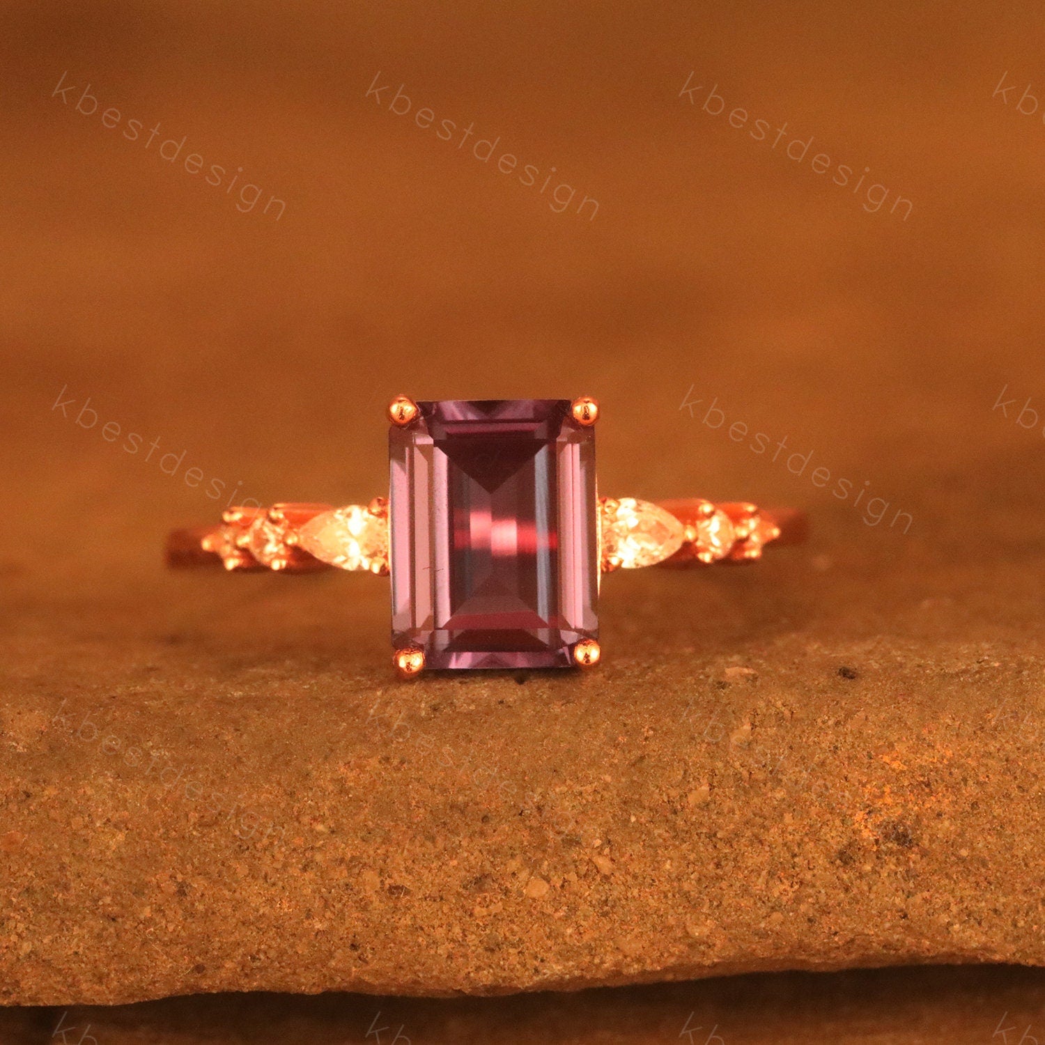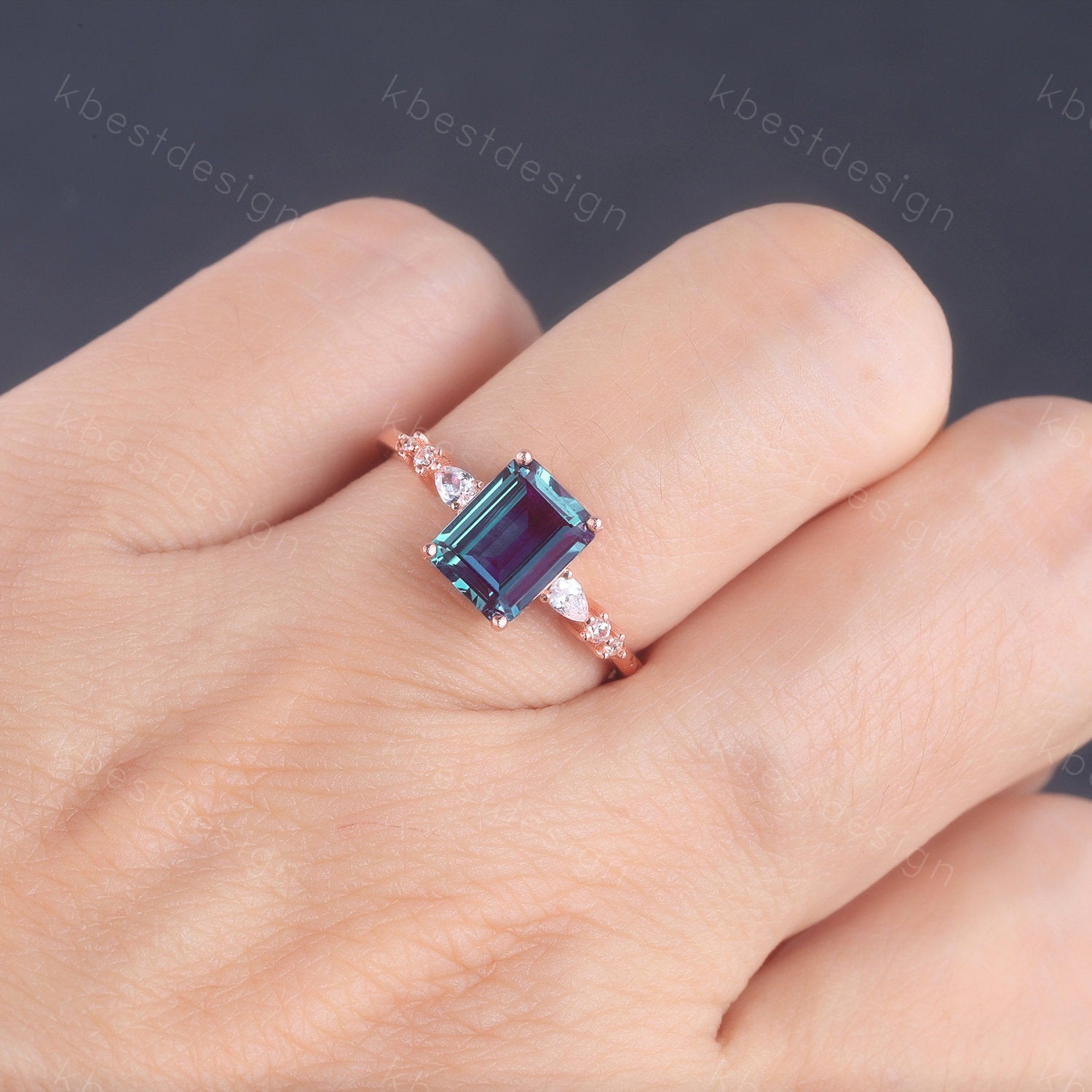 Emerald cut Alexandrite engagement ring vintage diamond Cluster wedding ring rose gold engagement ring anniversary gift for women
