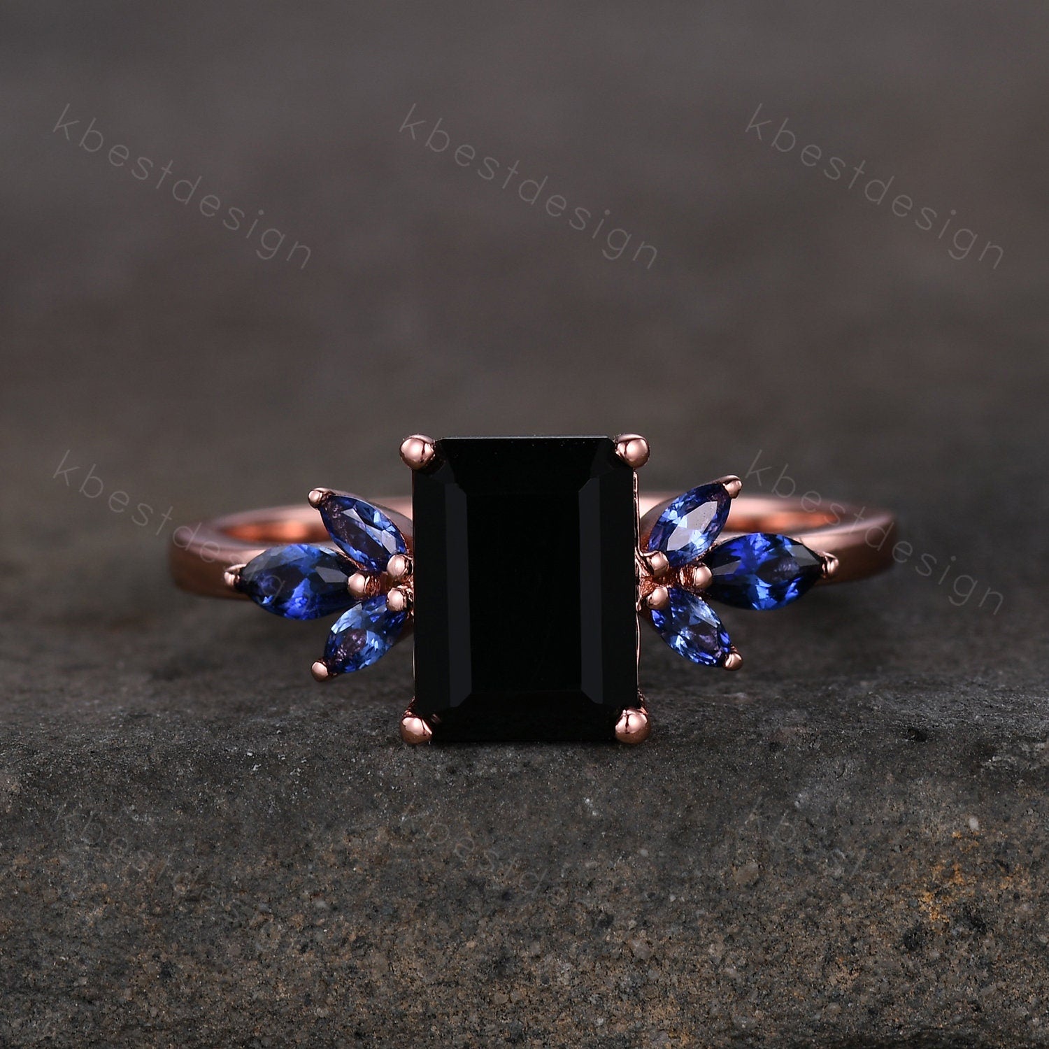 Emerald cut black onyx engagement ring rose gold unique marquise cut blue sapphire ring art deco black stone ring promise anniversary ring