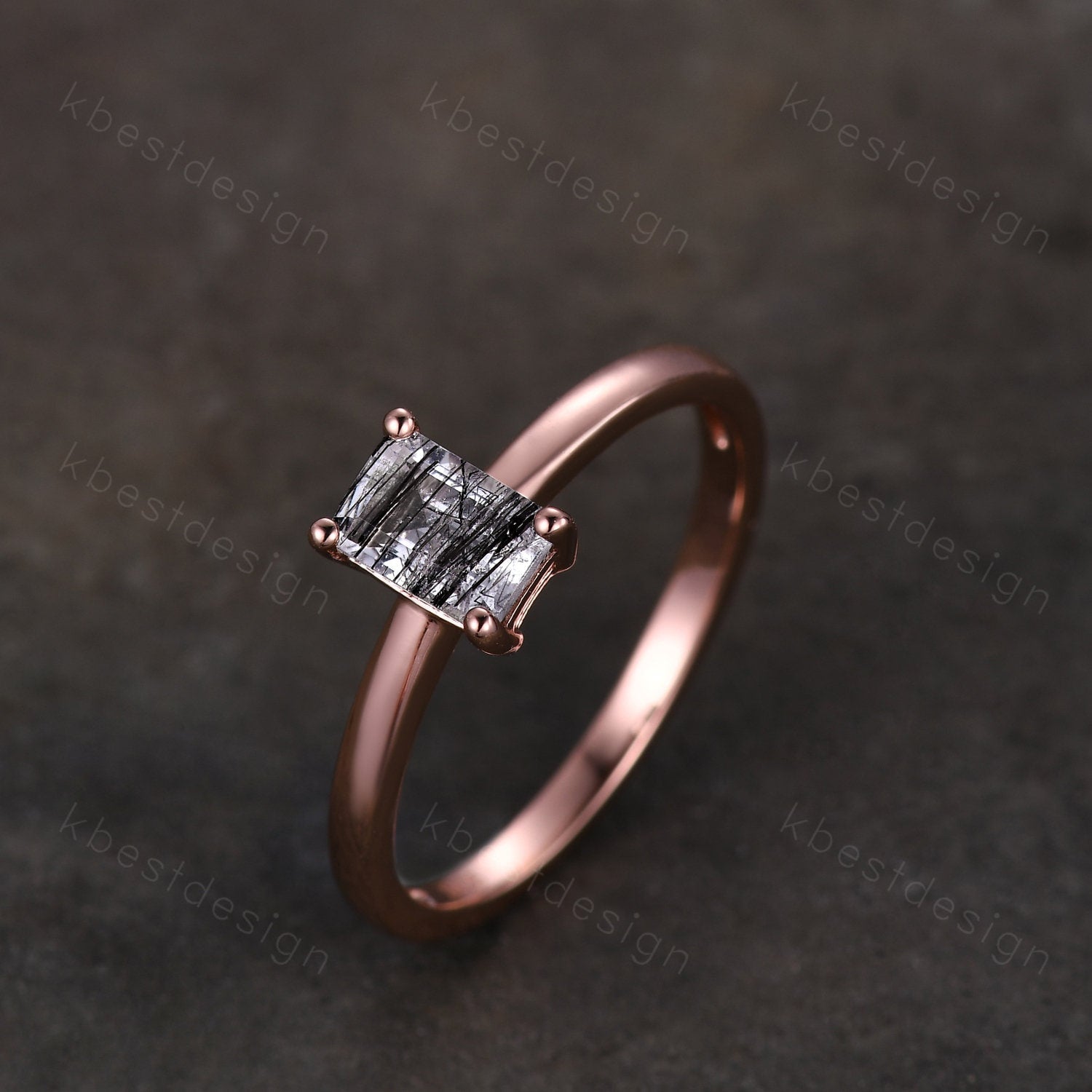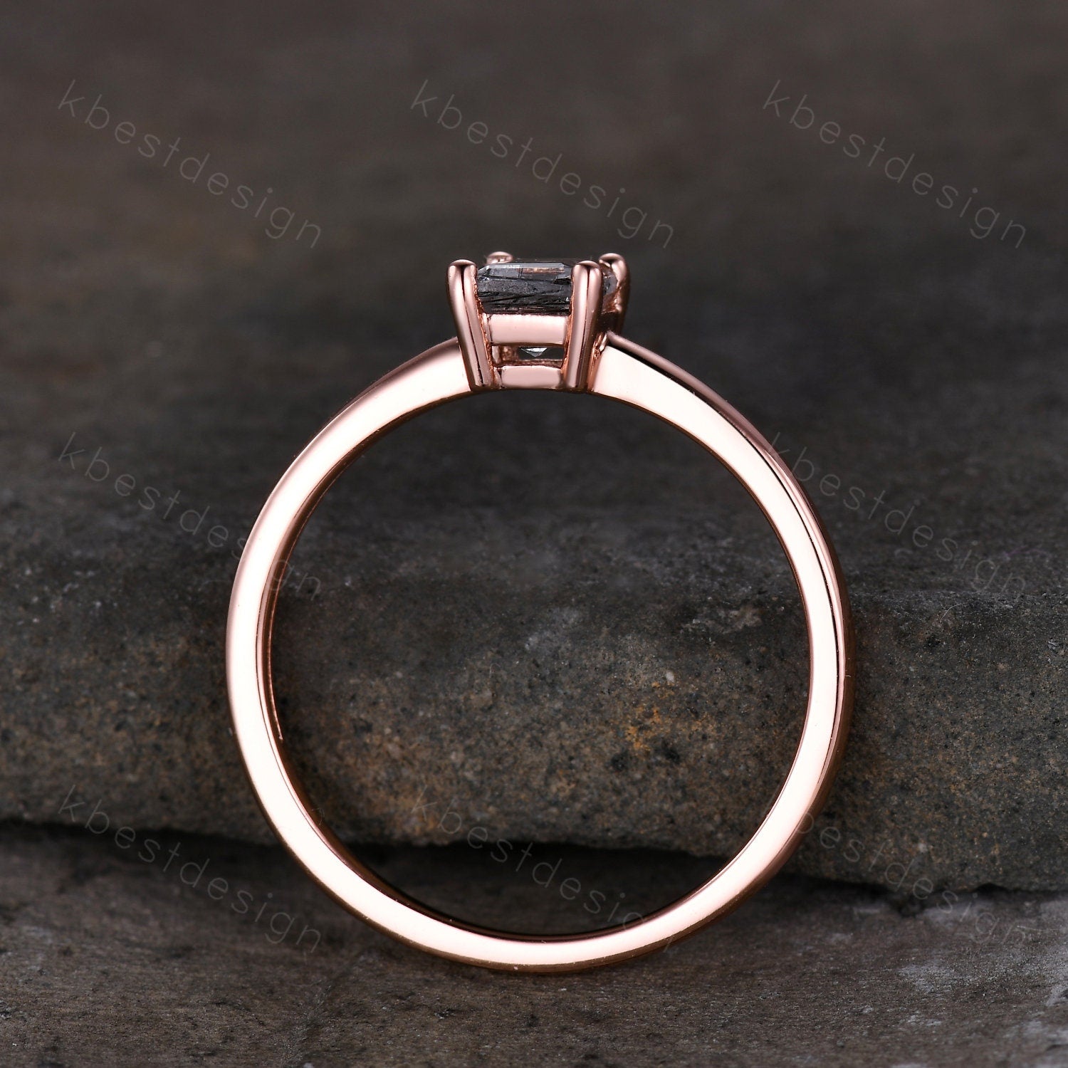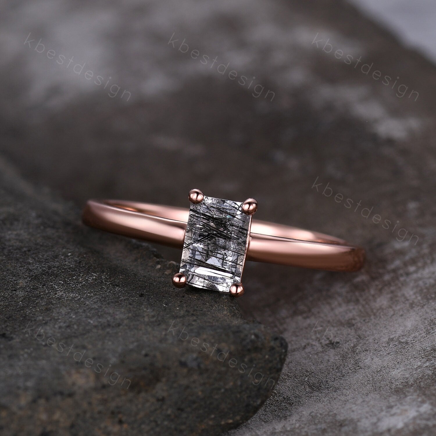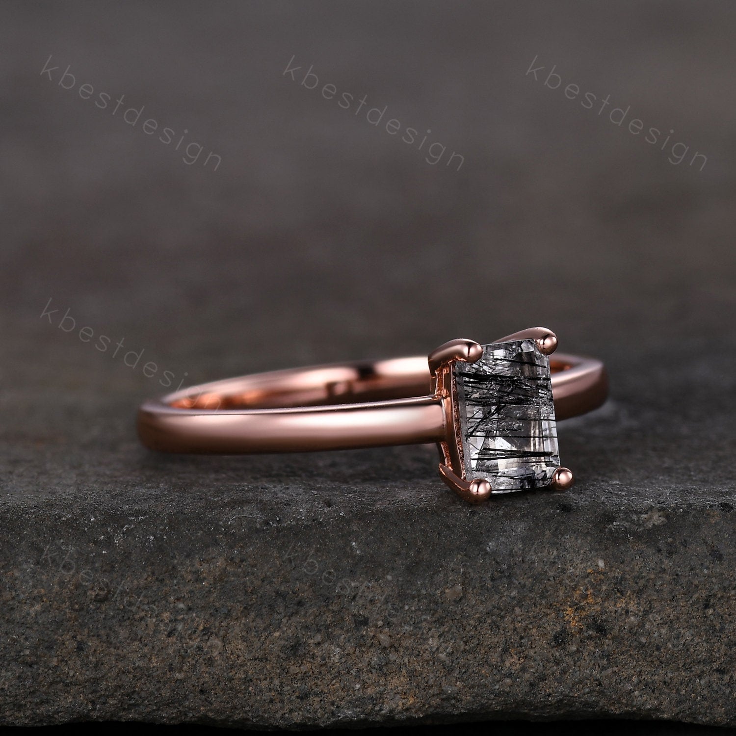 Emerald cut black rutilated quartz ring rose gold solitaire engagement ring minimalist ring delicate black stone ring anniversary ring