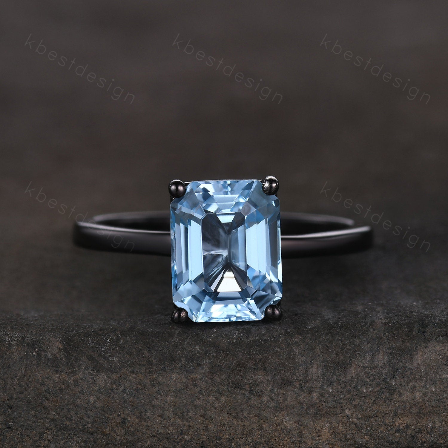 Emerald cut blue topaz engagement ring black gold ring solitaire Sky blue topaz engagement ring prong set statement ring promise gift