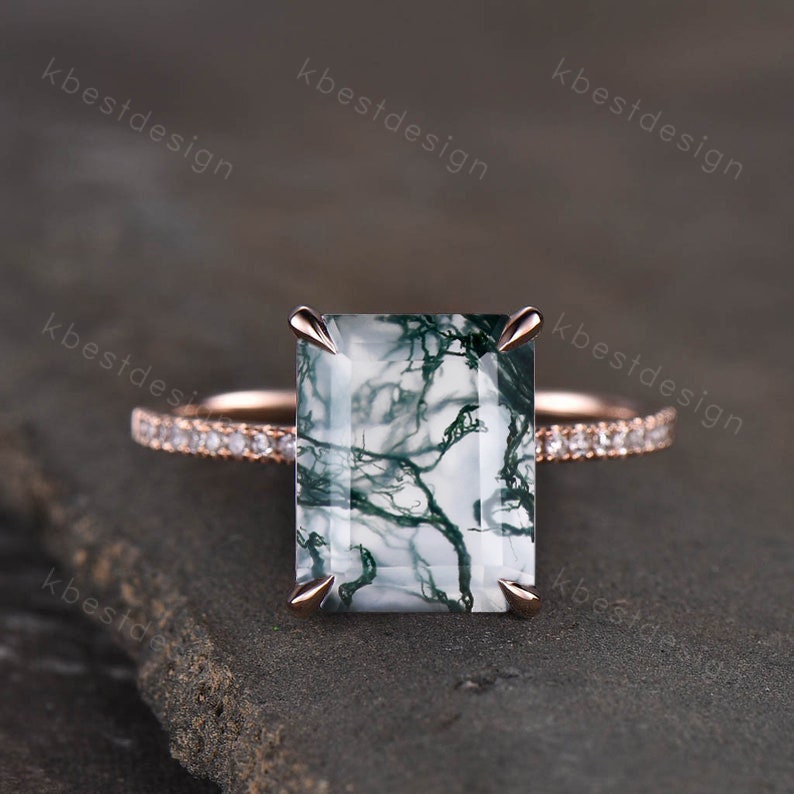 Emerald cut moss agate ring rose gold vintage engagement ring statement ring half eternity wedding bridal band anniversary promise ring
