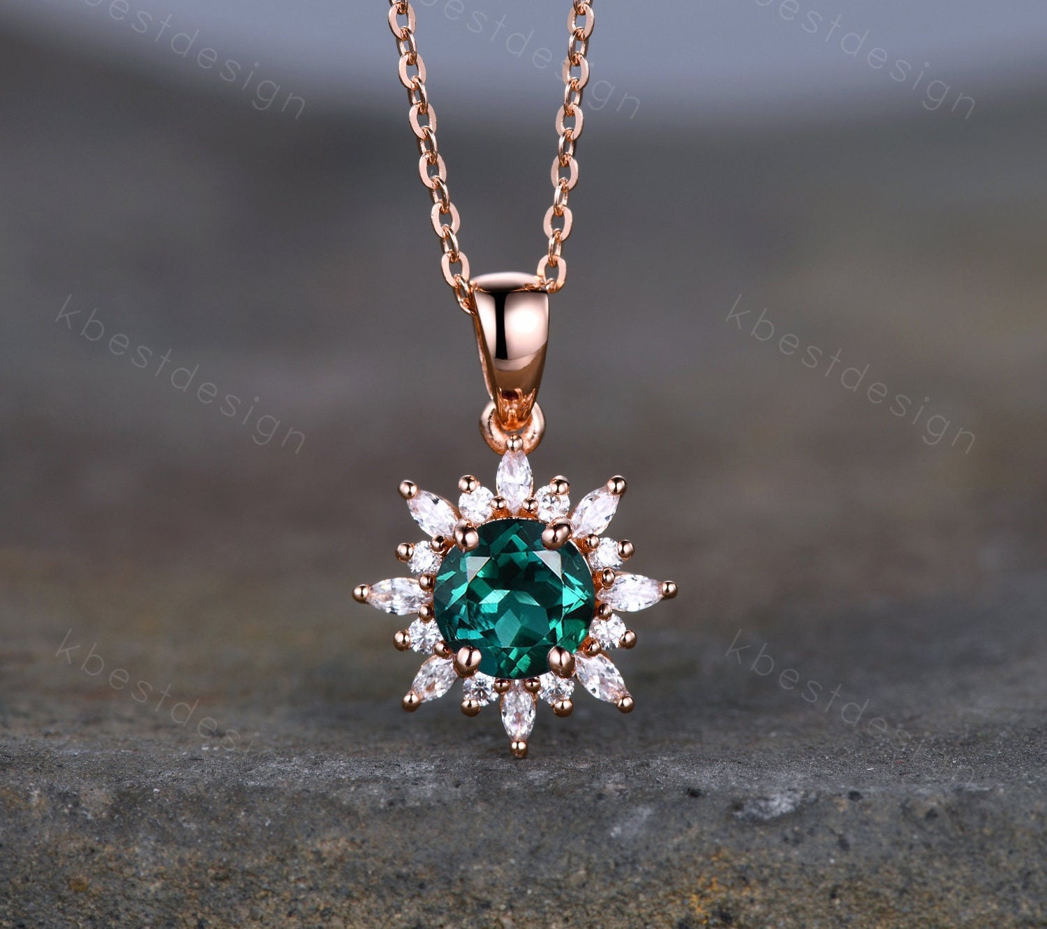 Emerald Necklace, Rose Gold Necklace, Vintage Birthstone Necklace, Round Emerald Pendant, May Birthstone Jewelry, Gift for Her, Art Deco