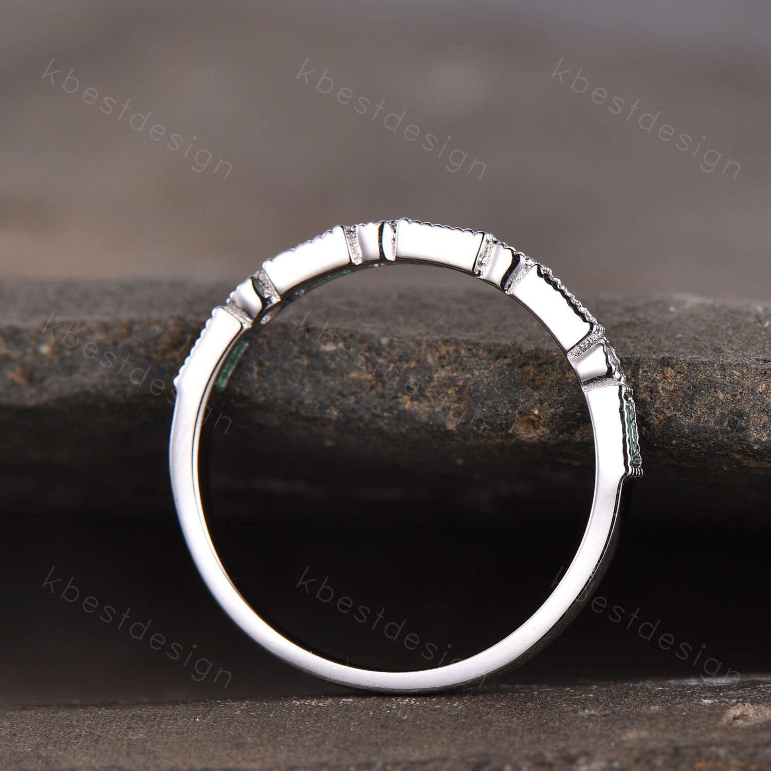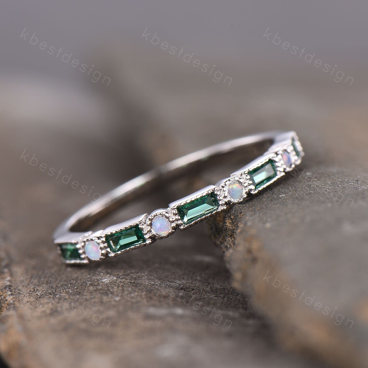 Emerald Opal Wedding Band, Half Eternity Band, Baguette Stacking Band, Opal Ring, Sterling Silver Ring, Anniversary Ring, May Birthstone
