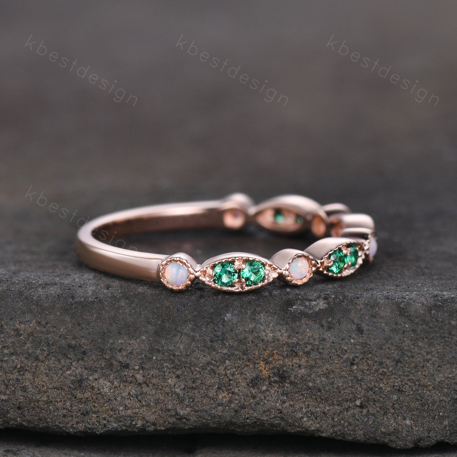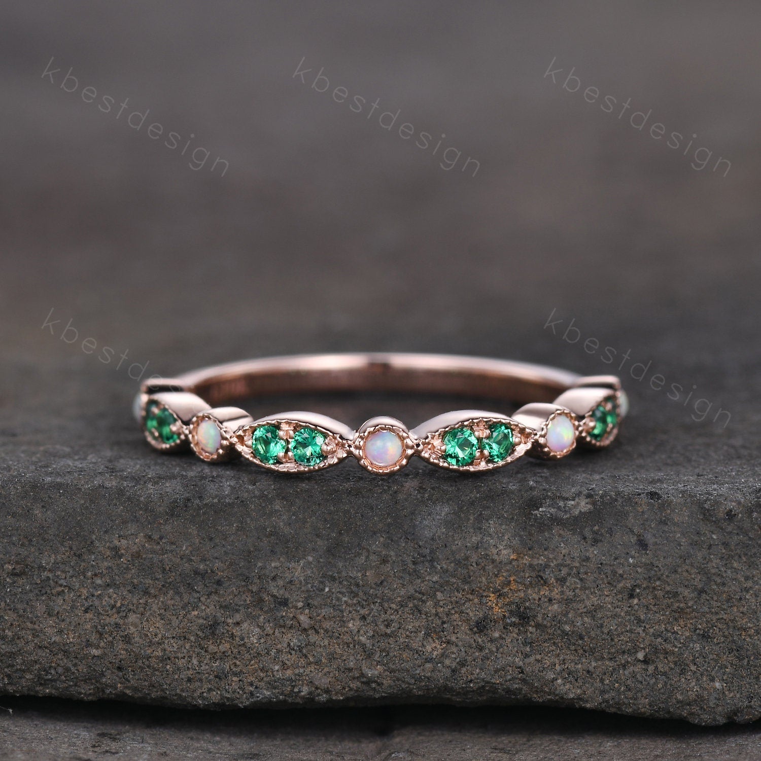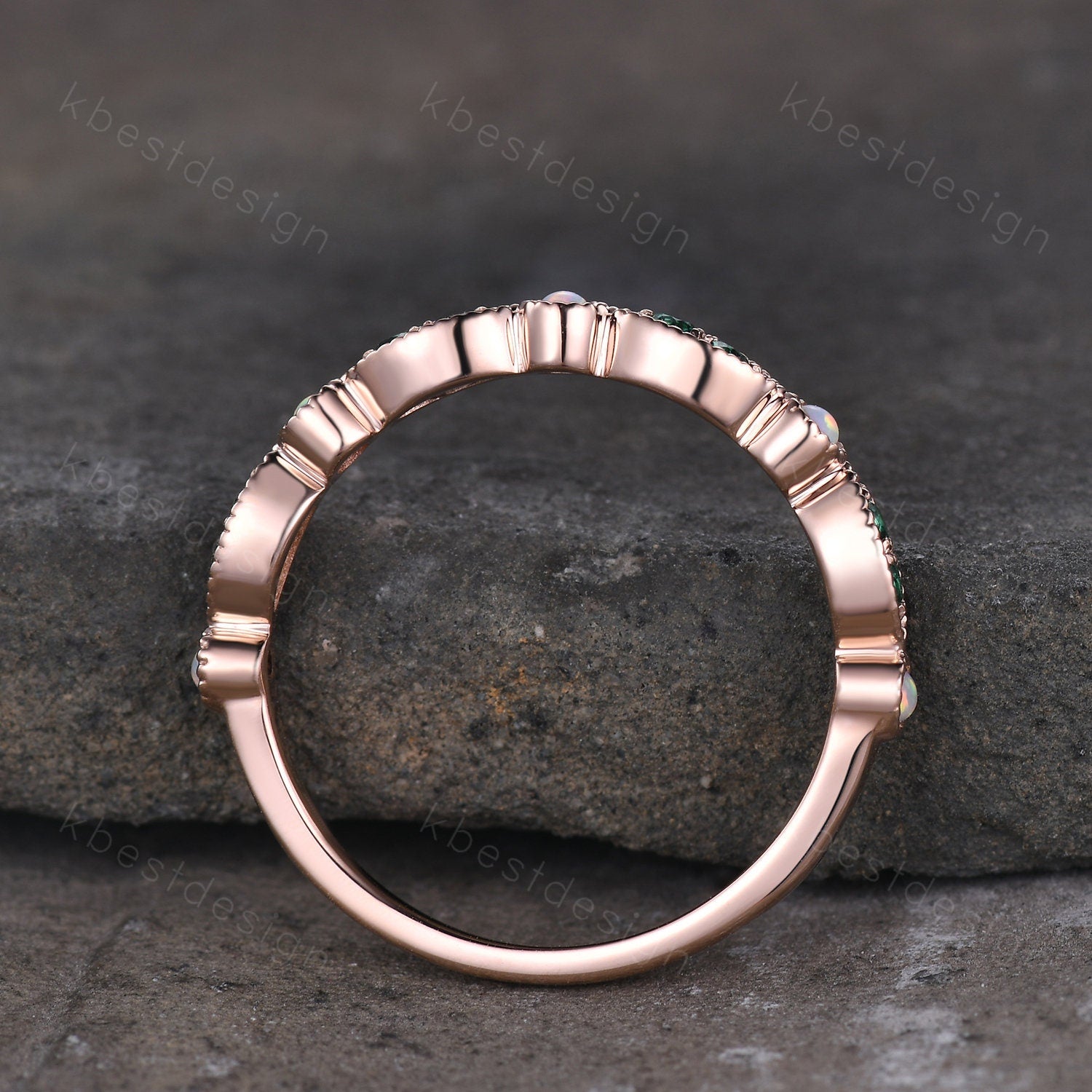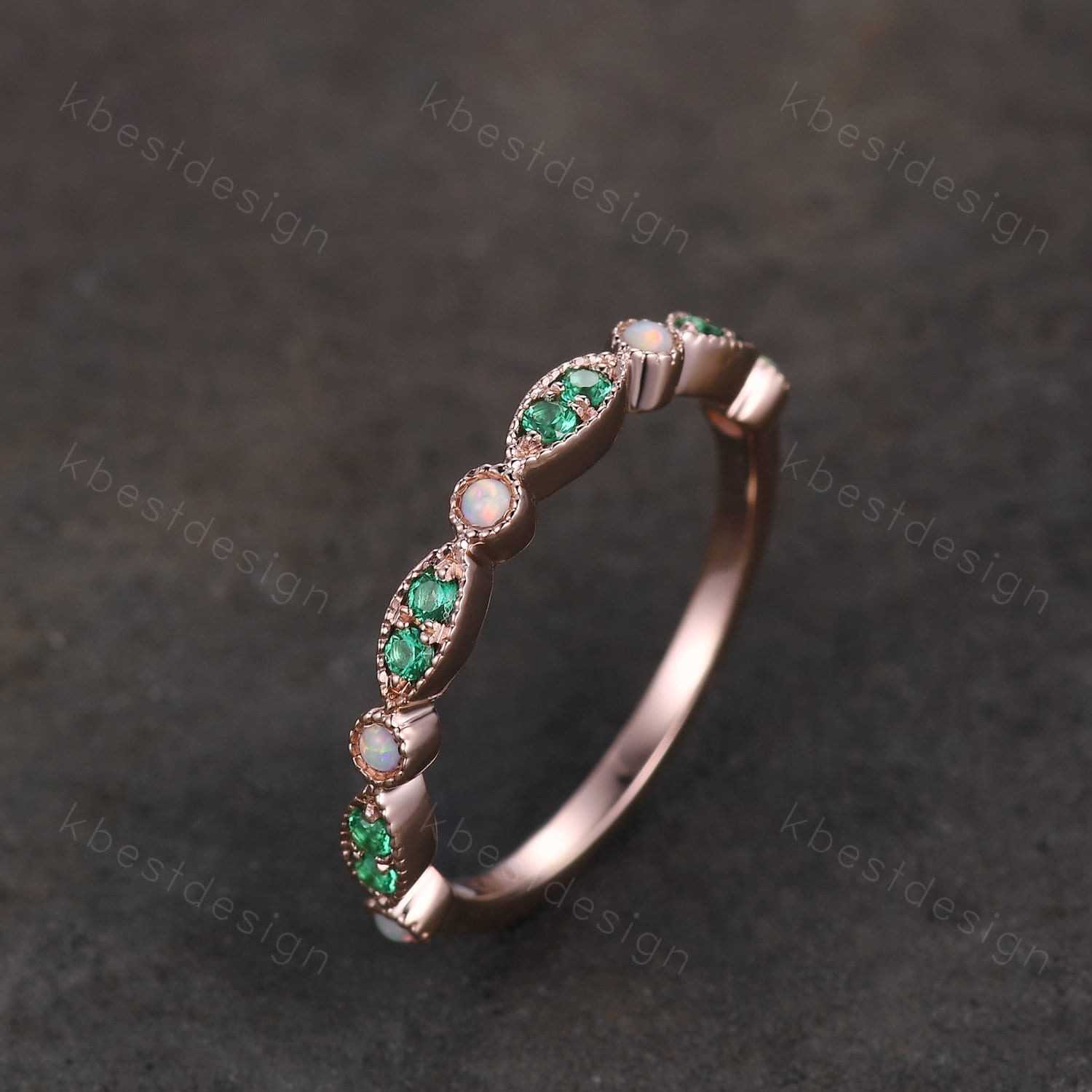 This art deco wedding ring is made with emerald and opal in rose gold, Emerald Opal Wedding Band, Half Eternity Wedding Band, Art Deco Stacking Band, Opal Wedding Ring, Rose Gold Emerald Band, Anniversary Gift.