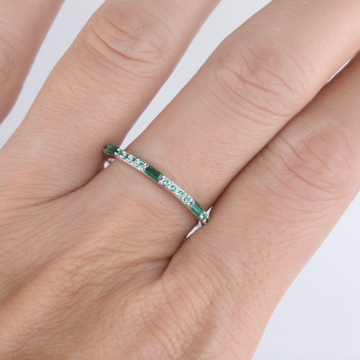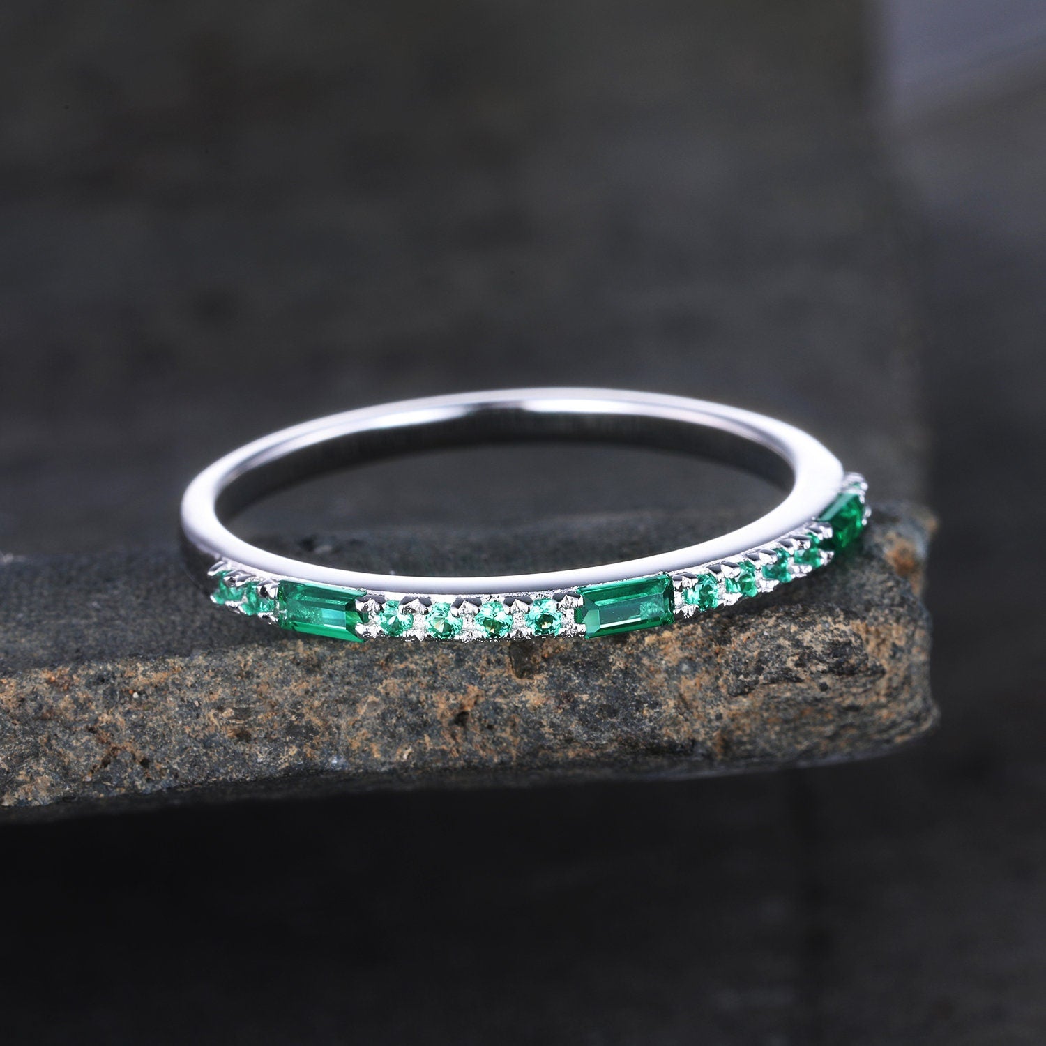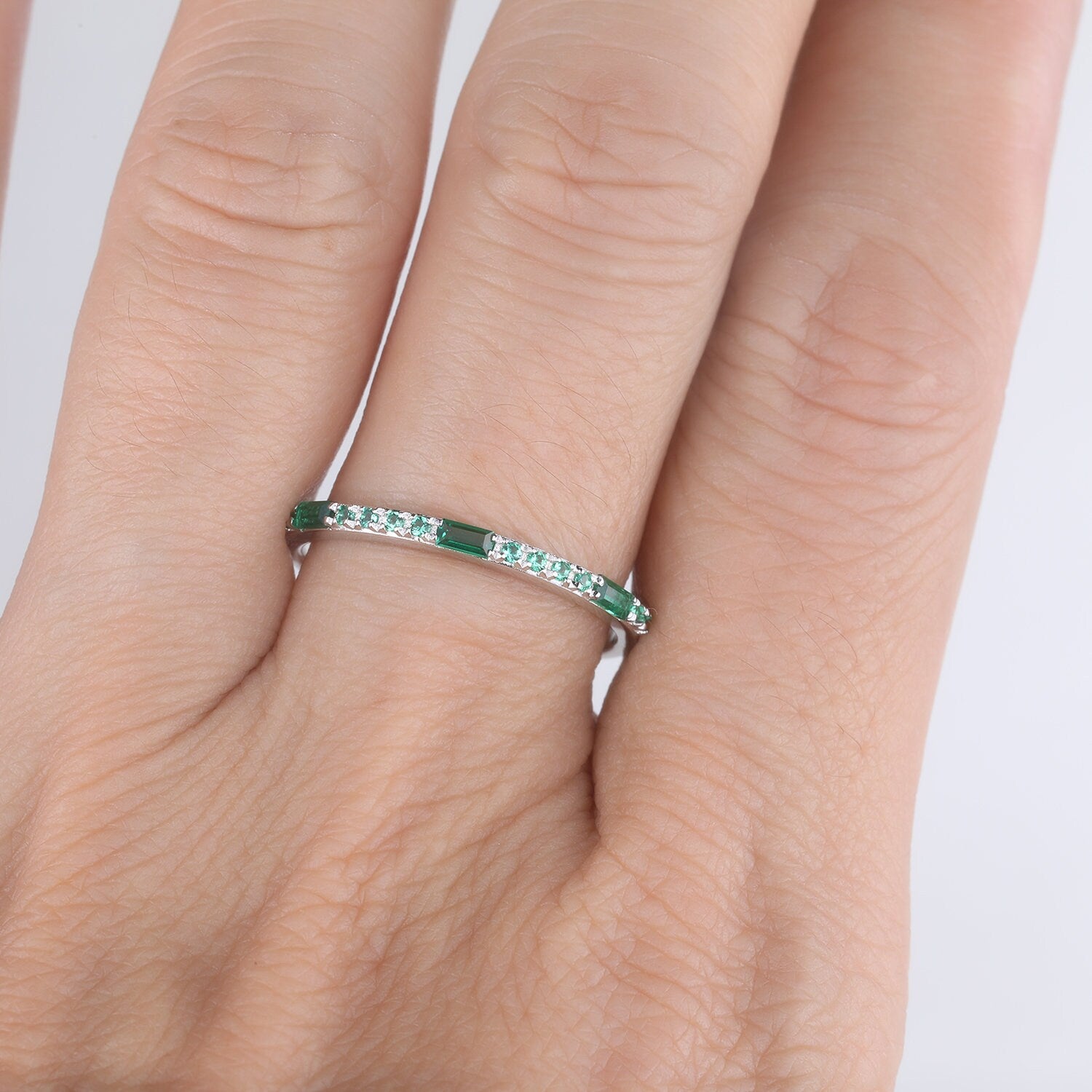 Emerald Ring, Sterling Silver Ring, Half Eternity Emerald Wedding Band, Baguette Ring, Stacking Band, May Birthstone, Anniversary Ring