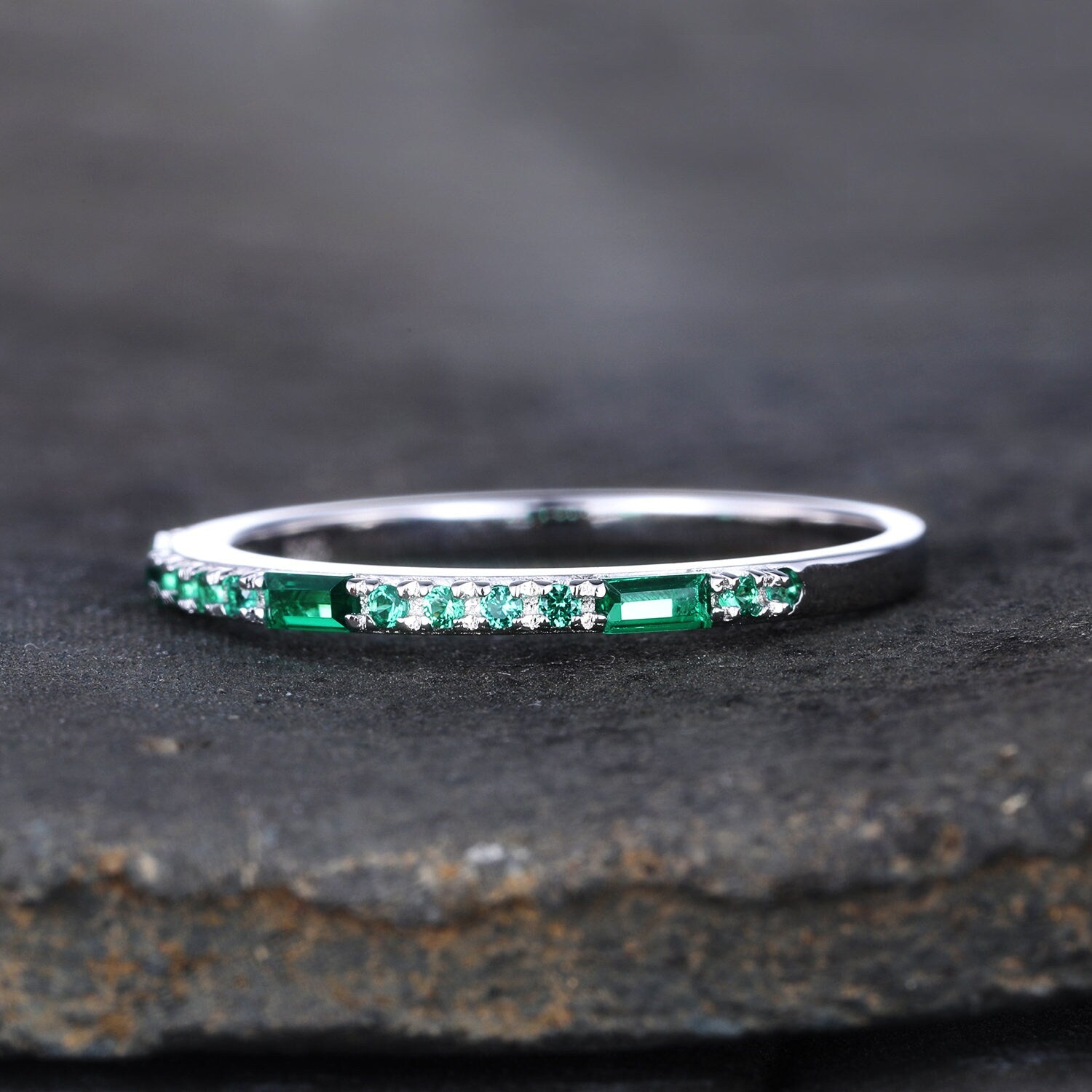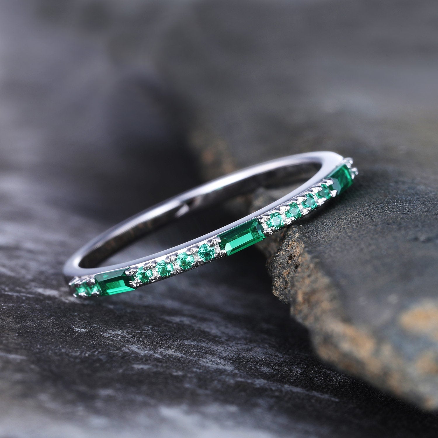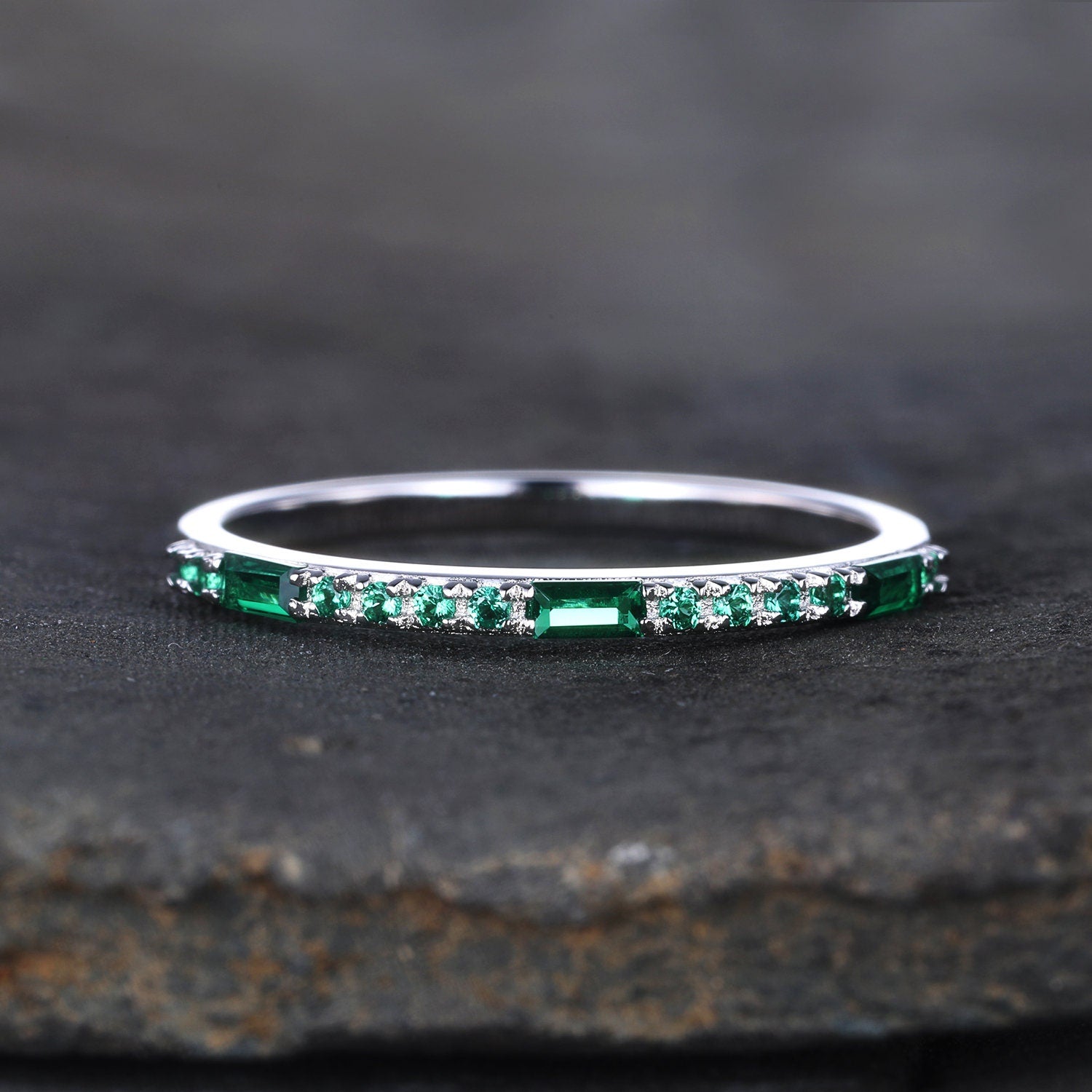 Emerald Ring, Sterling Silver Ring, Half Eternity Emerald Wedding Band, Baguette Ring, Stacking Band, May Birthstone, Anniversary Ring
