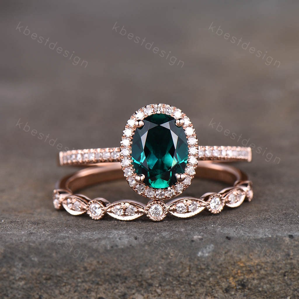 Emerald ring vintage unique oval emerald engagement ring set rose gold ring for women Art deco moissanite wedding band May birthstone ring
