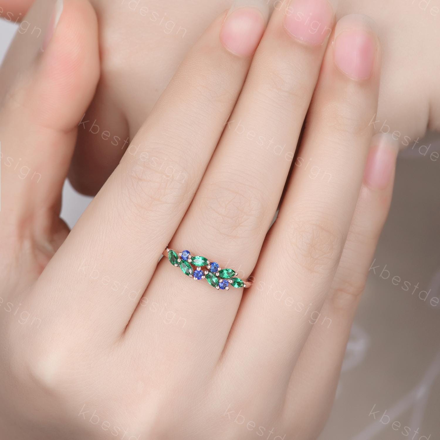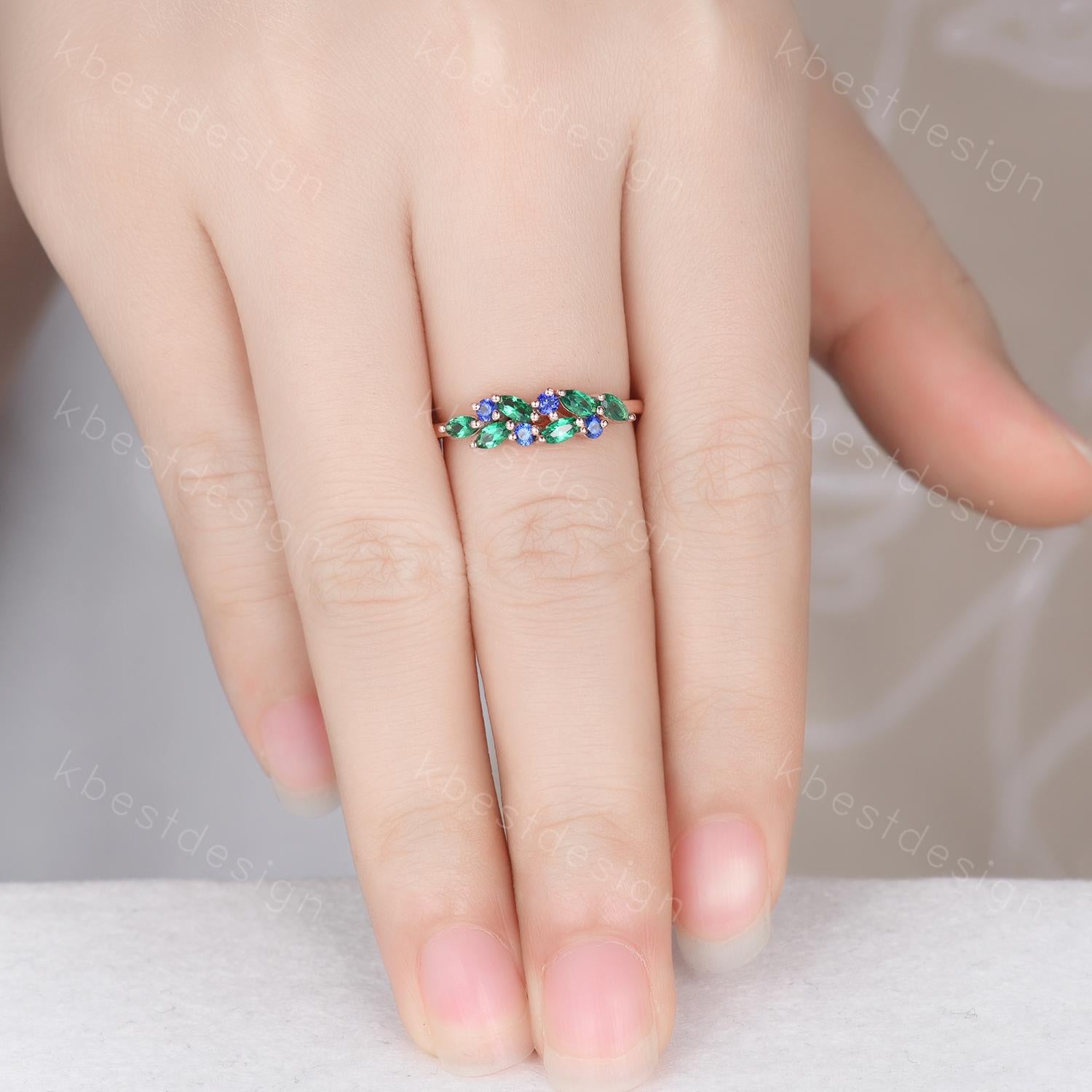 Emerald sapphire cluster wedding band Unique marquise cut emerald wedding band Vintage Moissanite ring Rose gold ring Anniversary gift