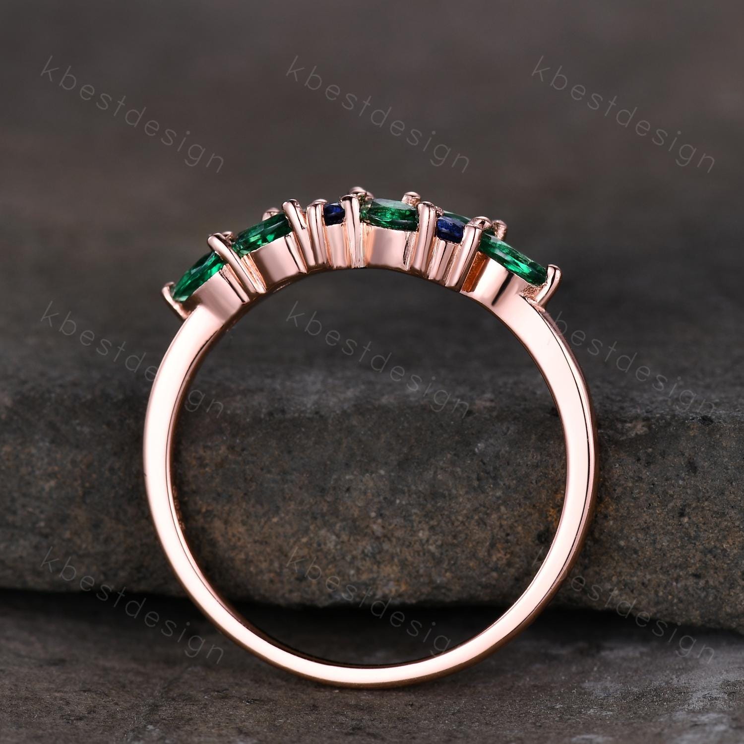 This is a vintage marquise cut emerald and blue sapphire wedding ring. Emerald sapphire cluster wedding band Unique marquise cut emerald wedding band Vintage Moissanite ring Rose gold ring Anniversary gift
