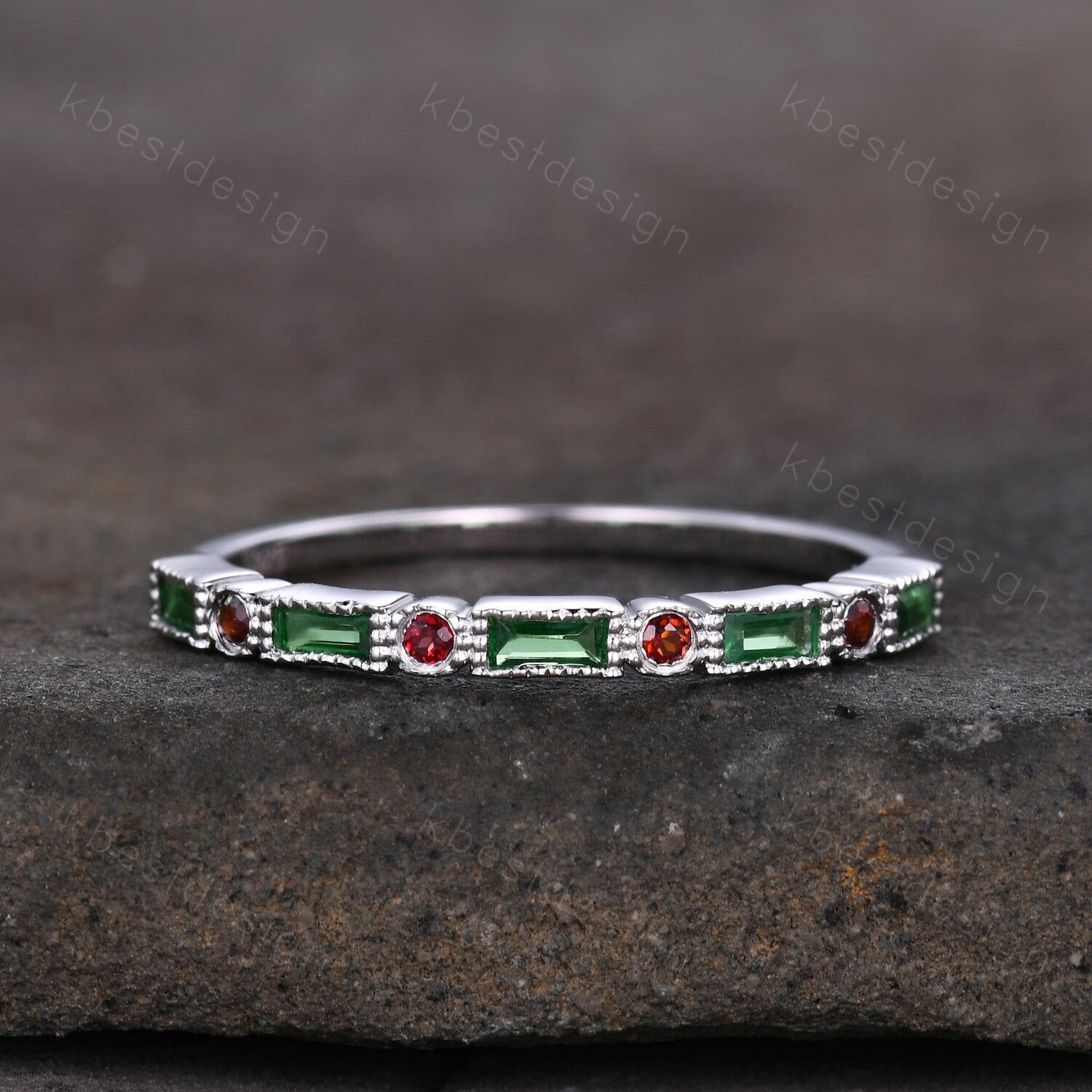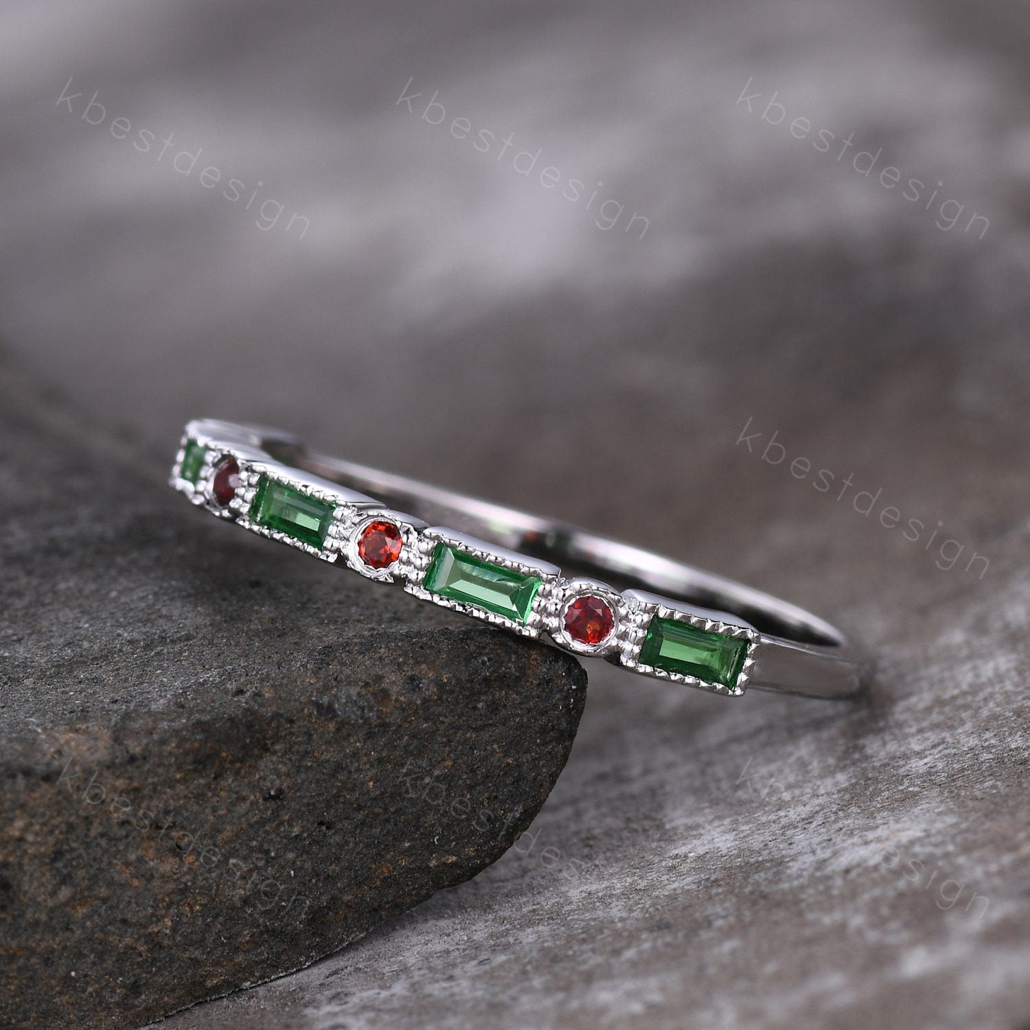 Emerald Wedding Band Half Eternity Band Emerald Garnet Band Art Deco Stacking Wedding Ring Anniversary Ring White Gold Ring Milgrain