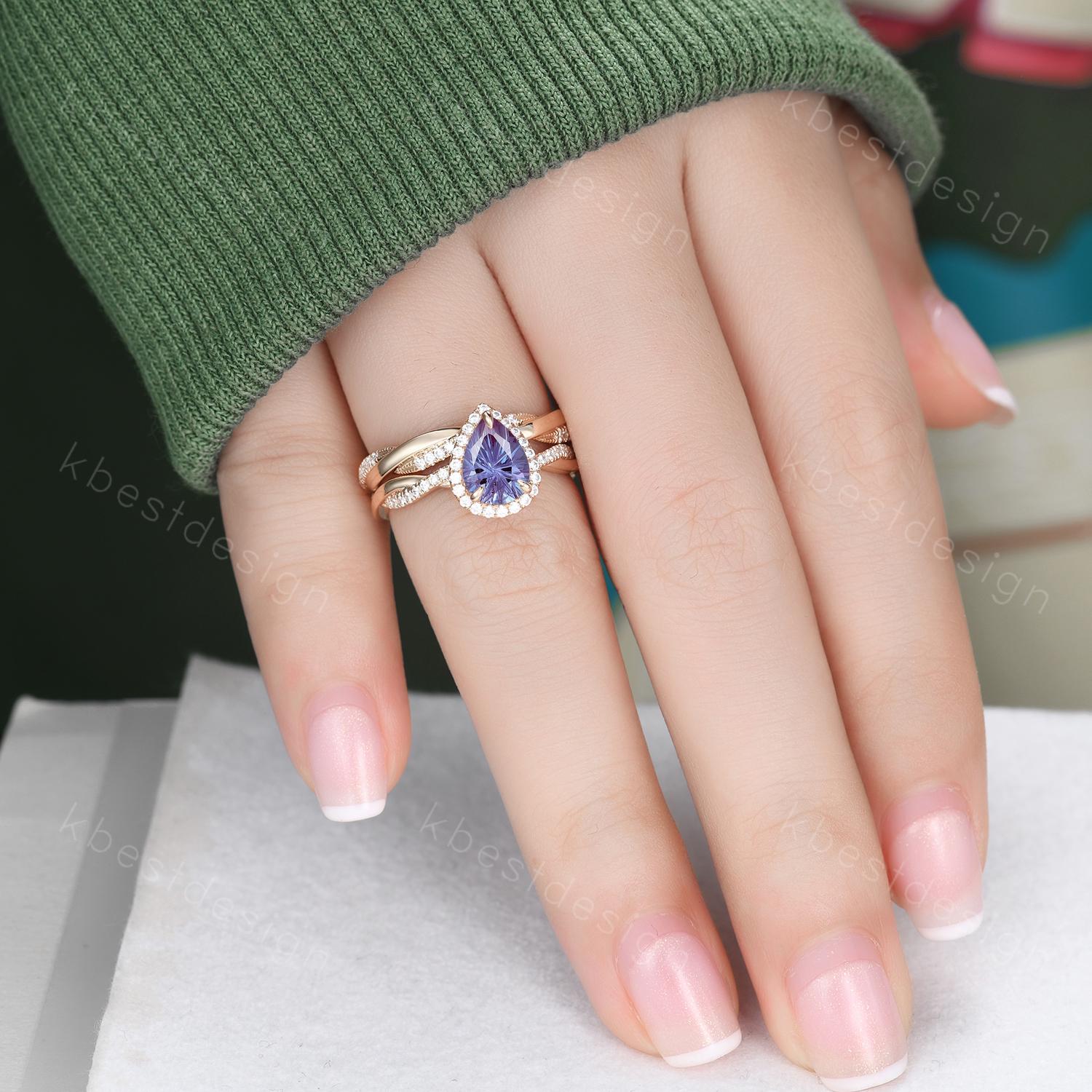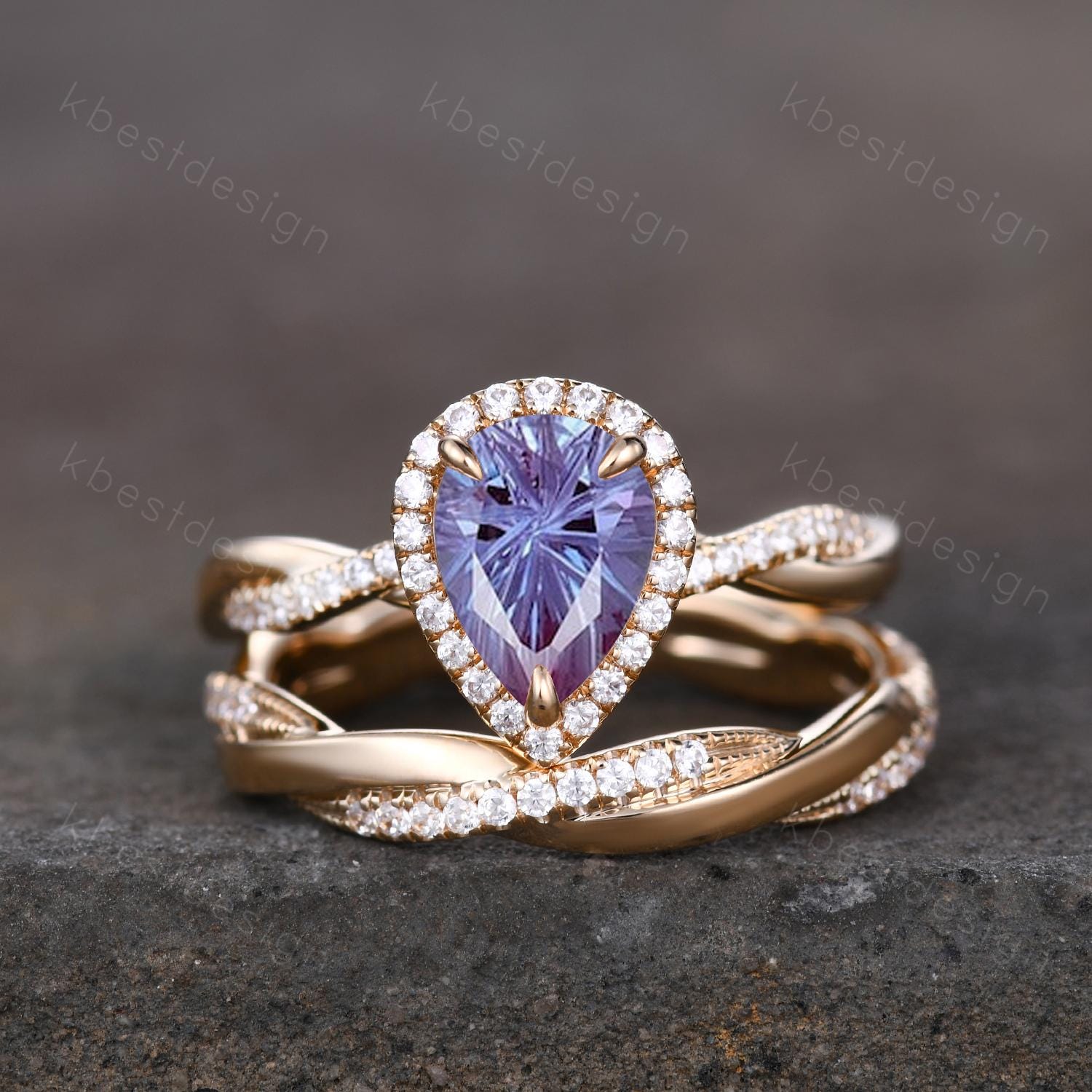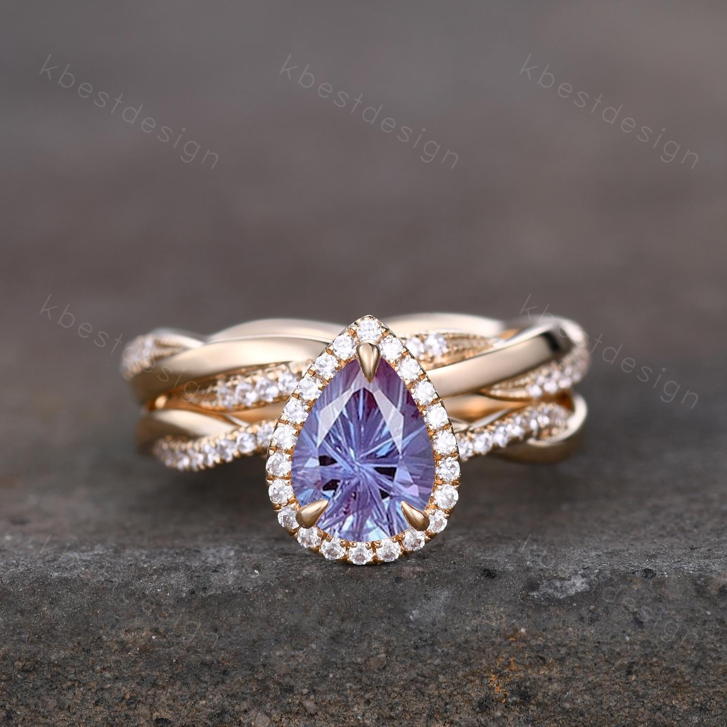 Firework Alexandrite Engagement Ring Set Teardrop Alexandrite Ring Twist Moissanite Wedding Band Promise Ring Bridal Set Rose Gold Rings
