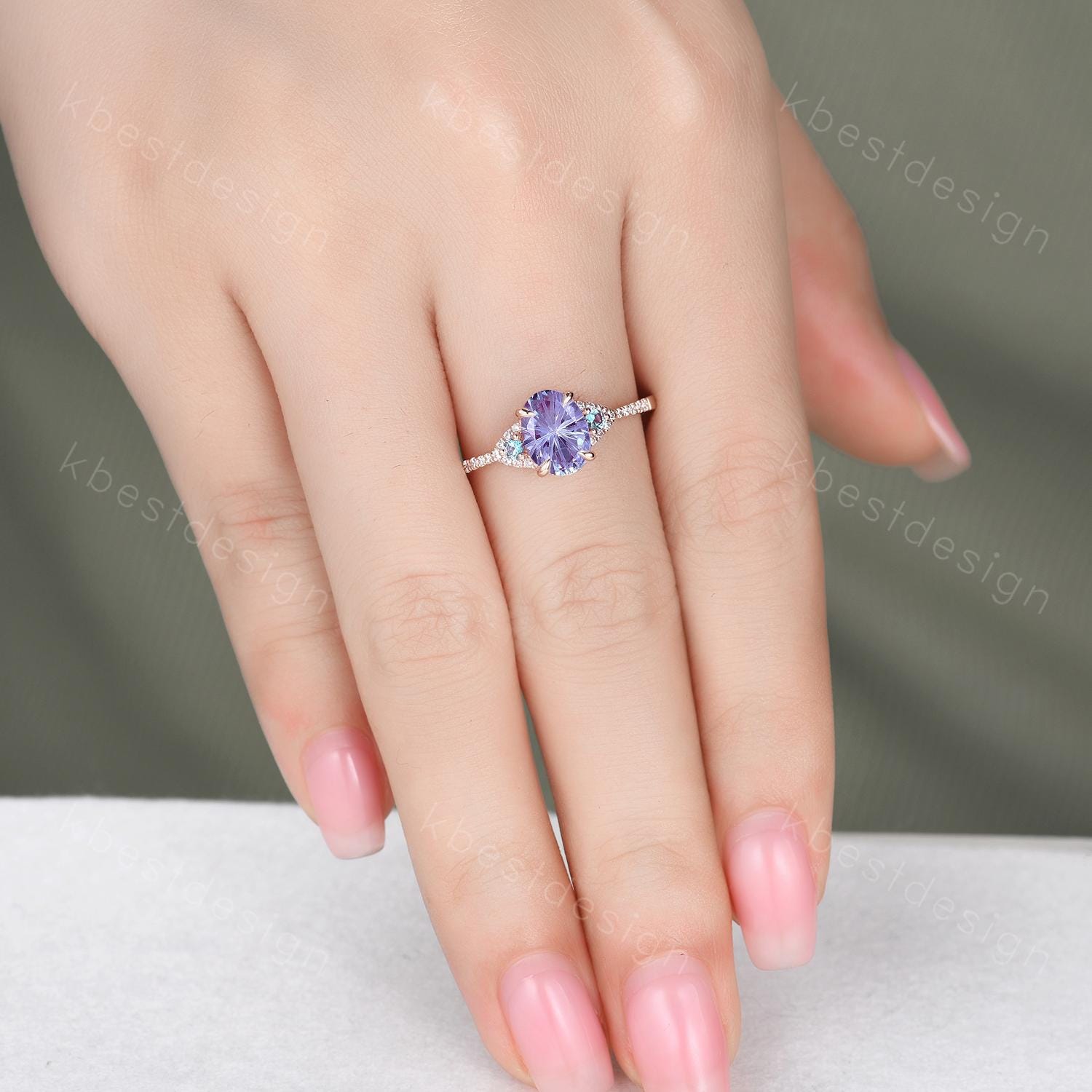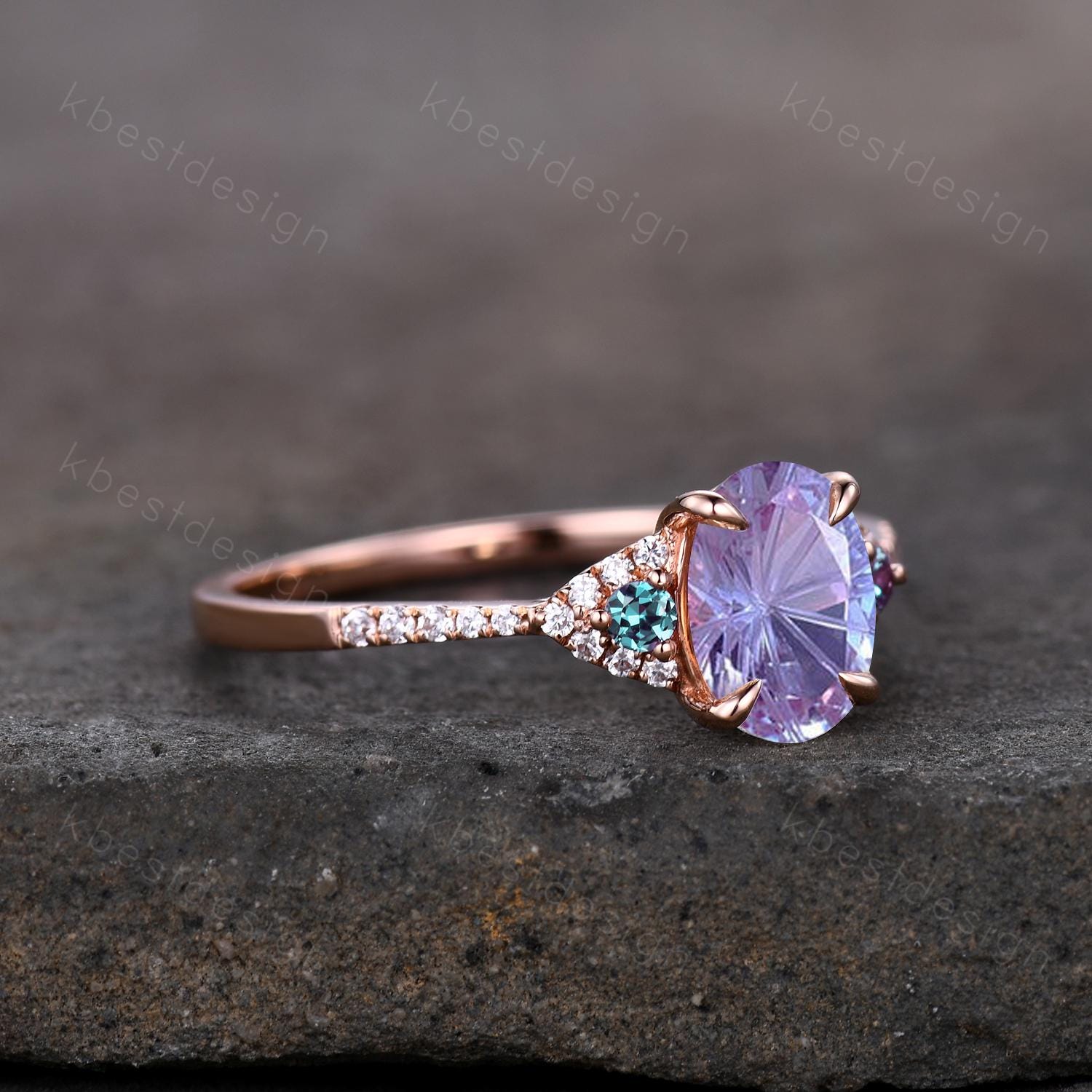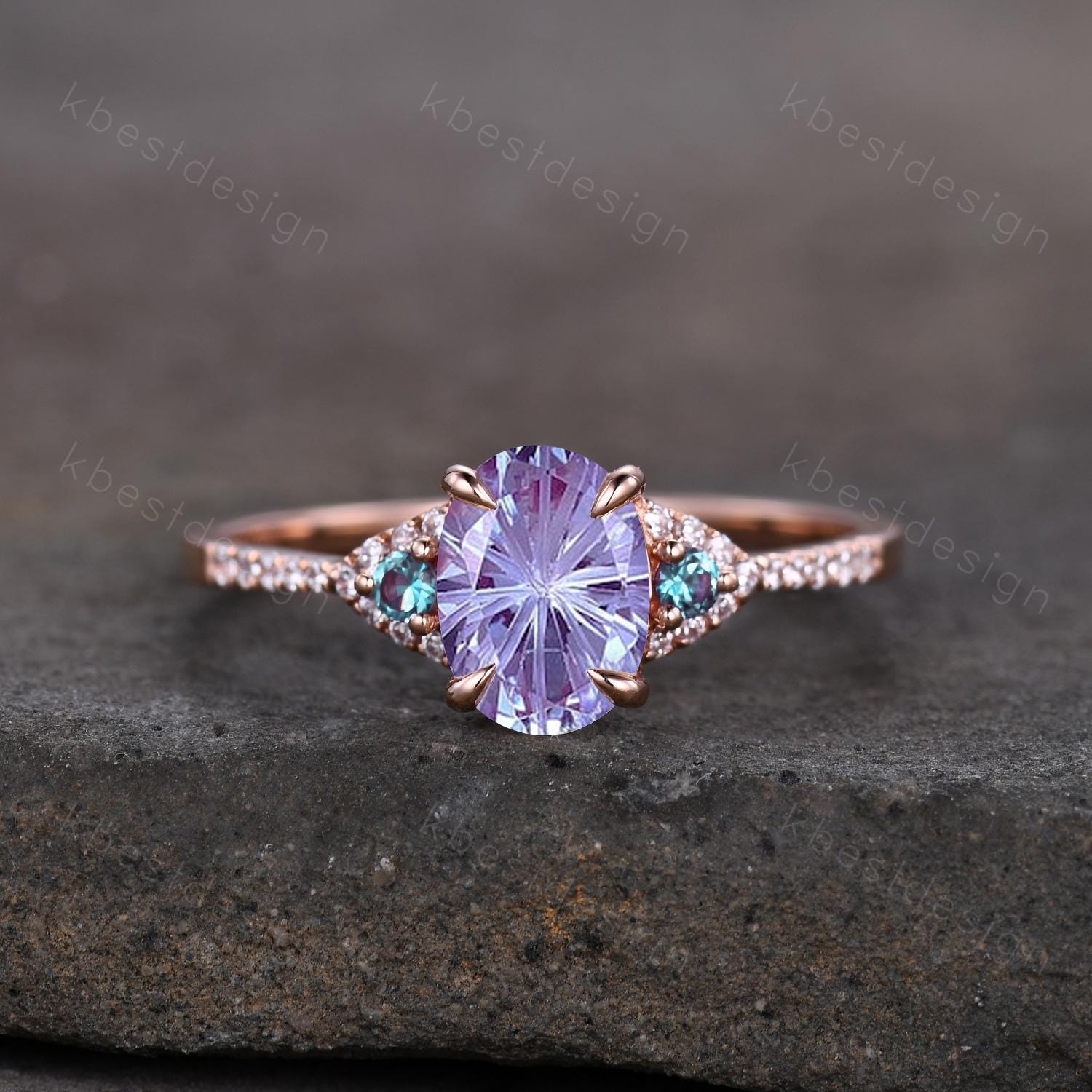 Firework cut alexandrite engagement ring rose gold art deco three stone ring oval cut bridal ring unique alexandrite promise ring for her