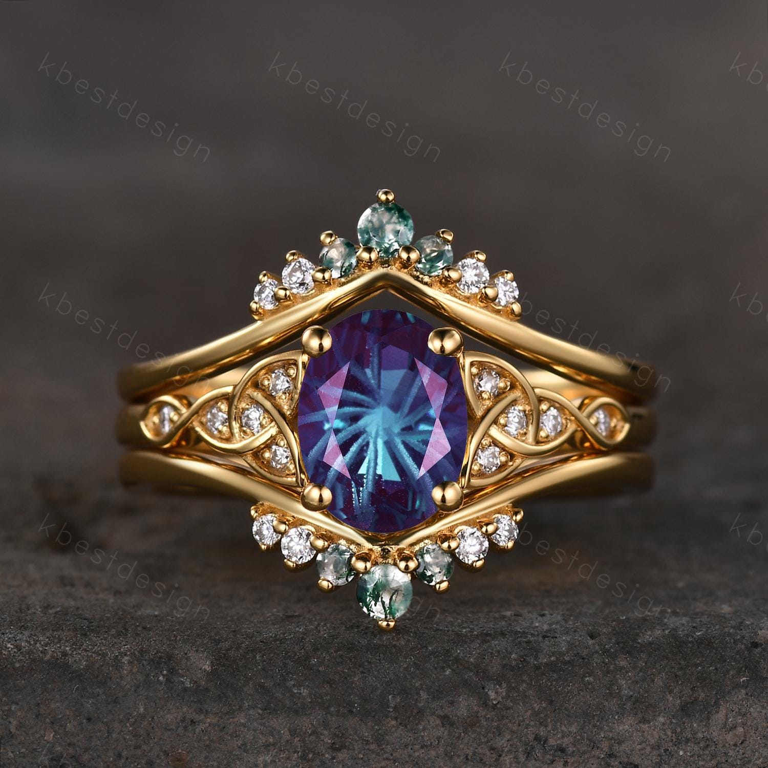 Fireworks cut Alexandrite engagement ring set yellow gold double curved moss agate stacking band unique celtic ring vintage bridal set