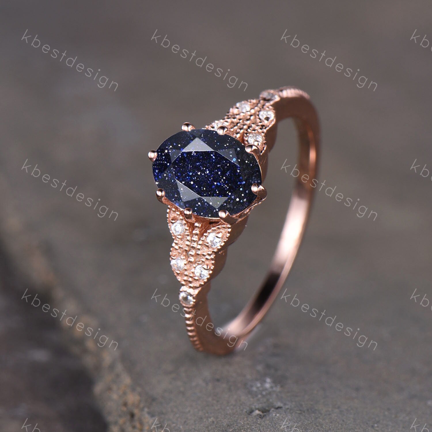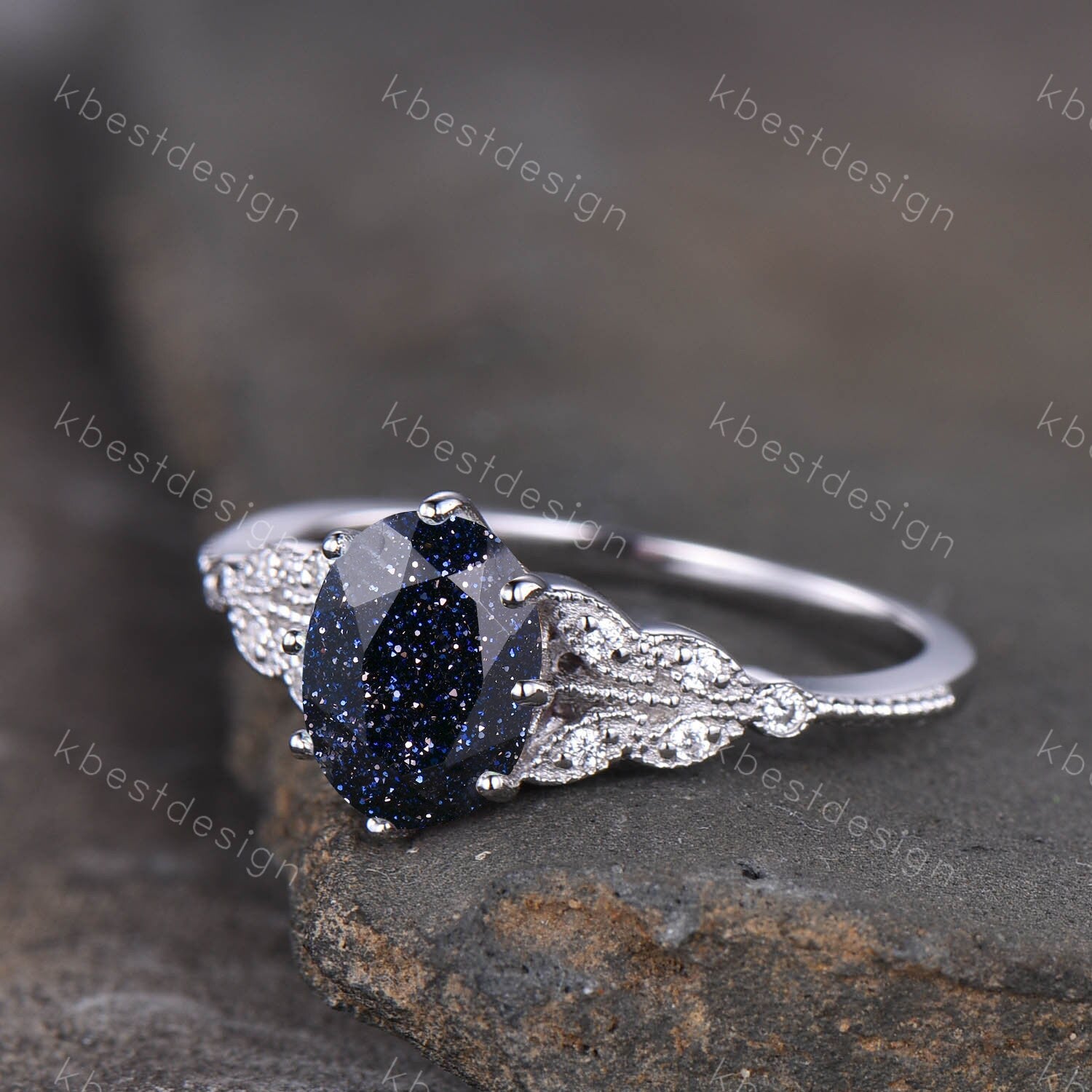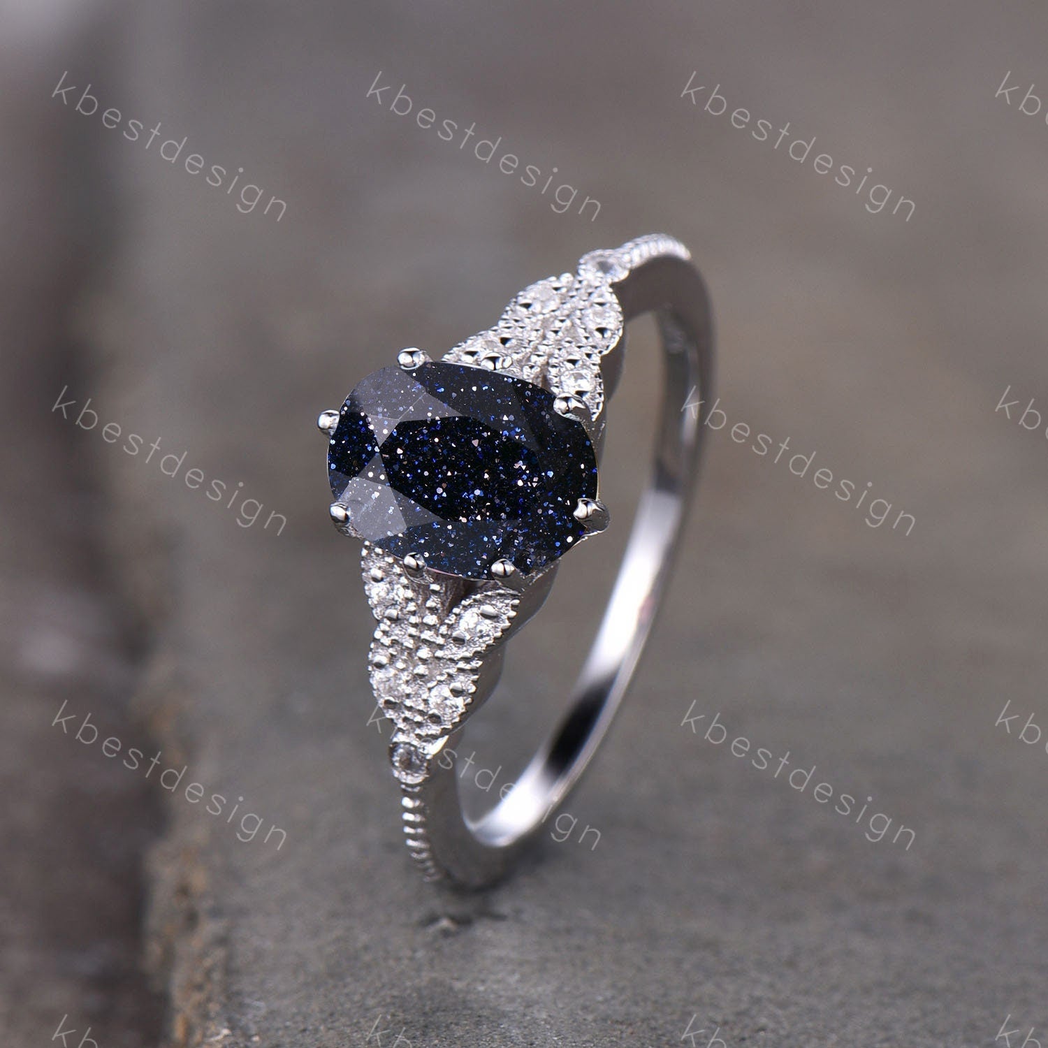 Galaxy Sandstone Ring Oval Blue Sandstone Engagement Ring Sterling Silver Ring Unique Art Deco Bridal Wedding Ring Promise Anniversary Ring
