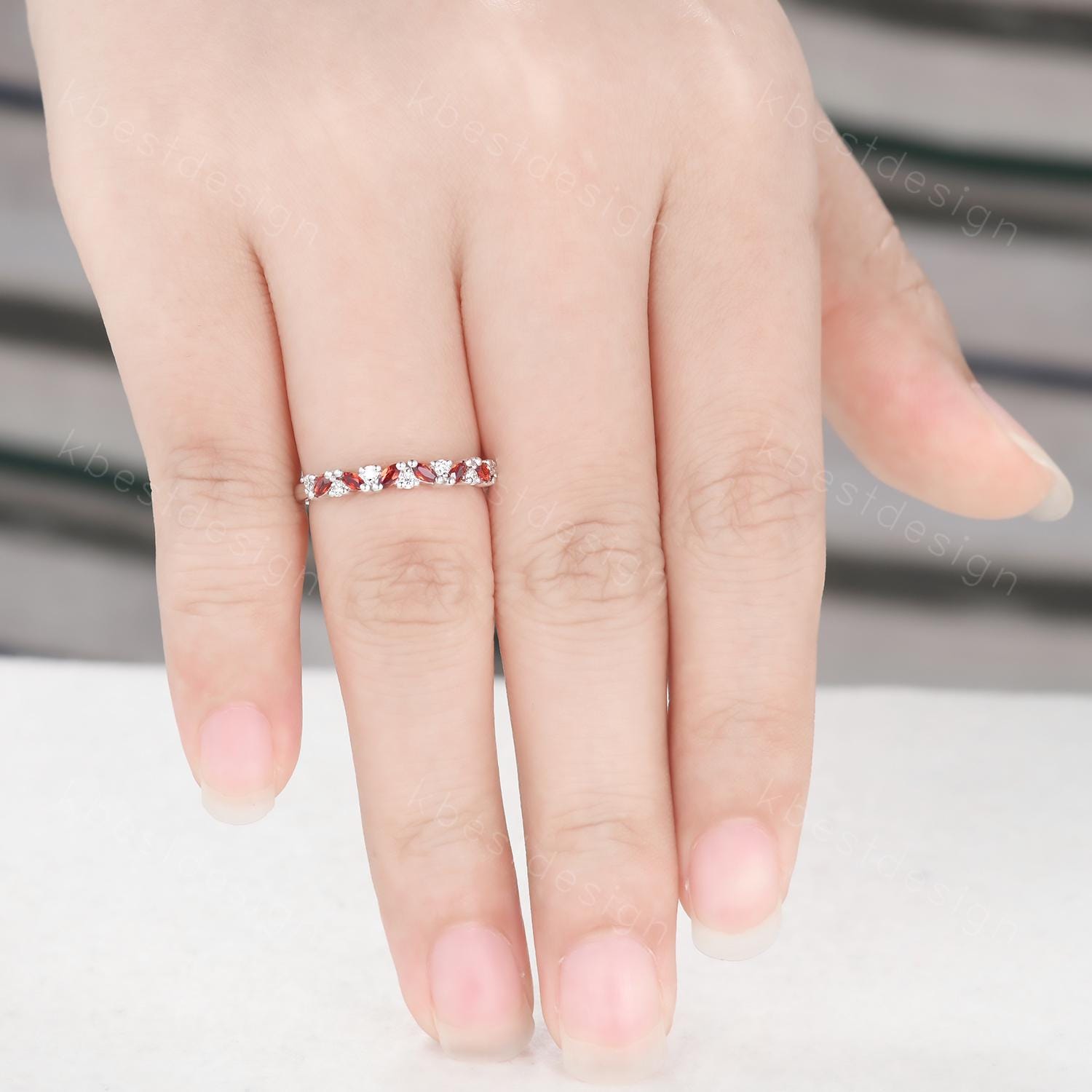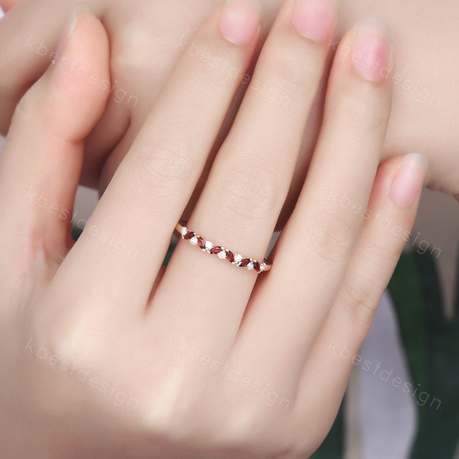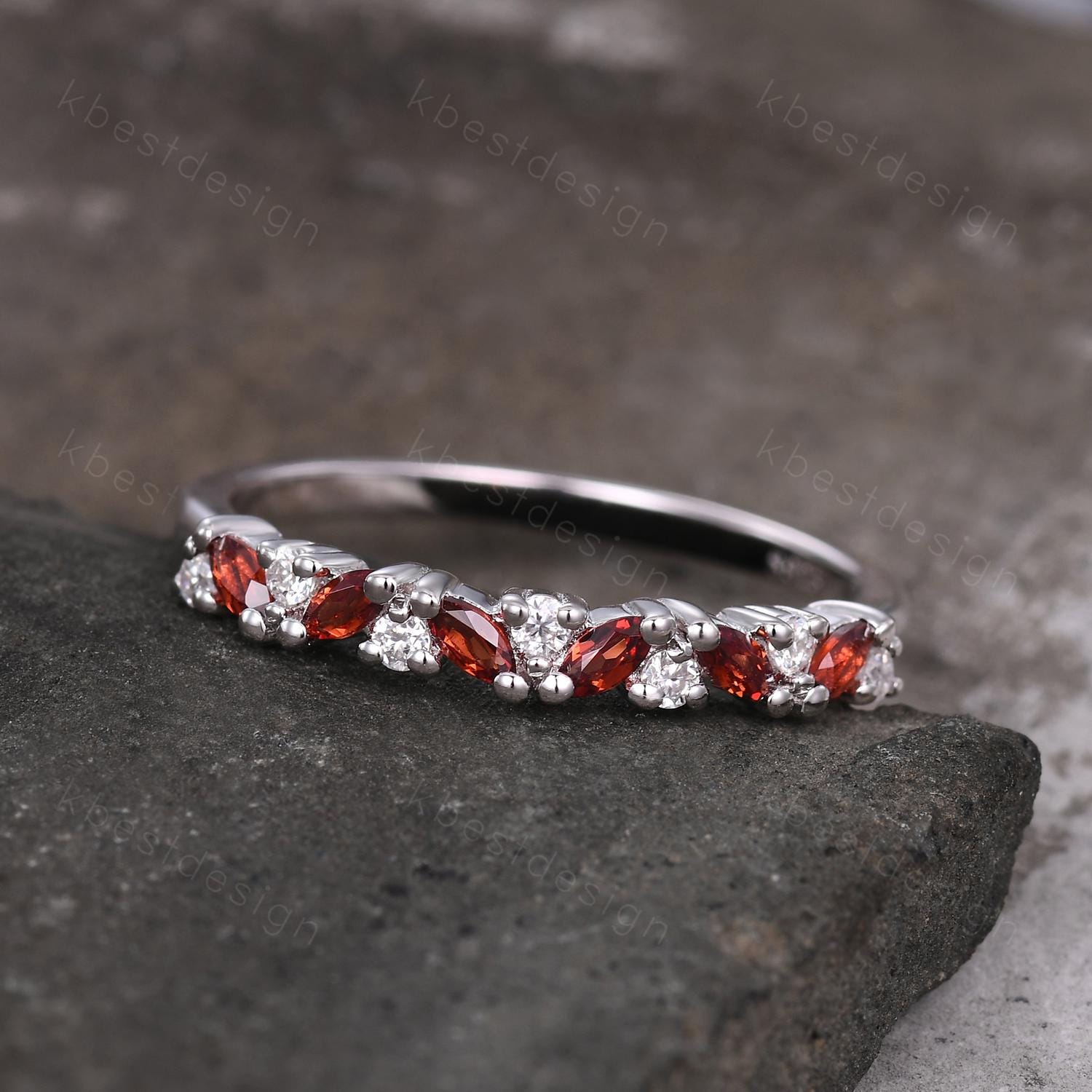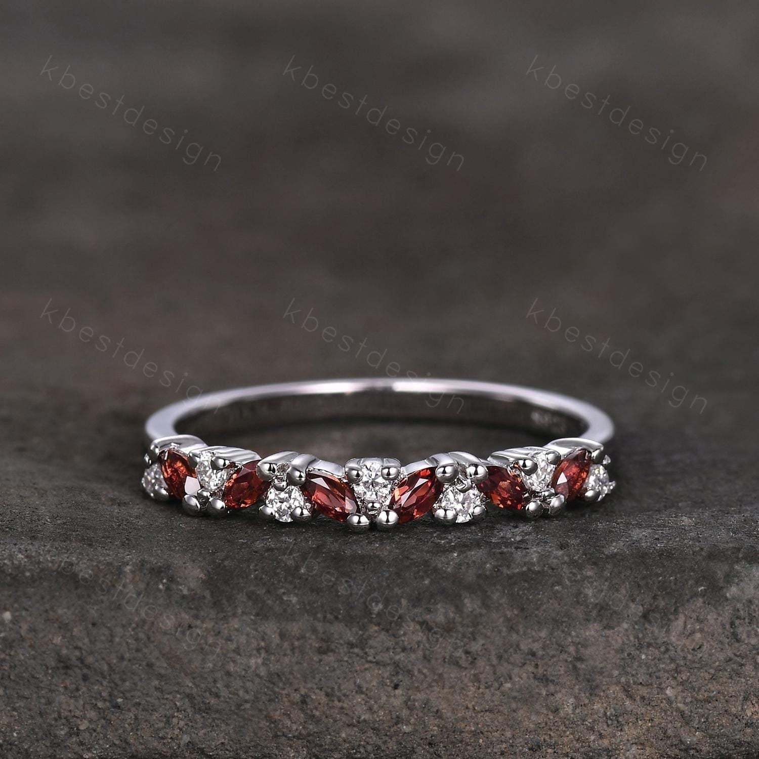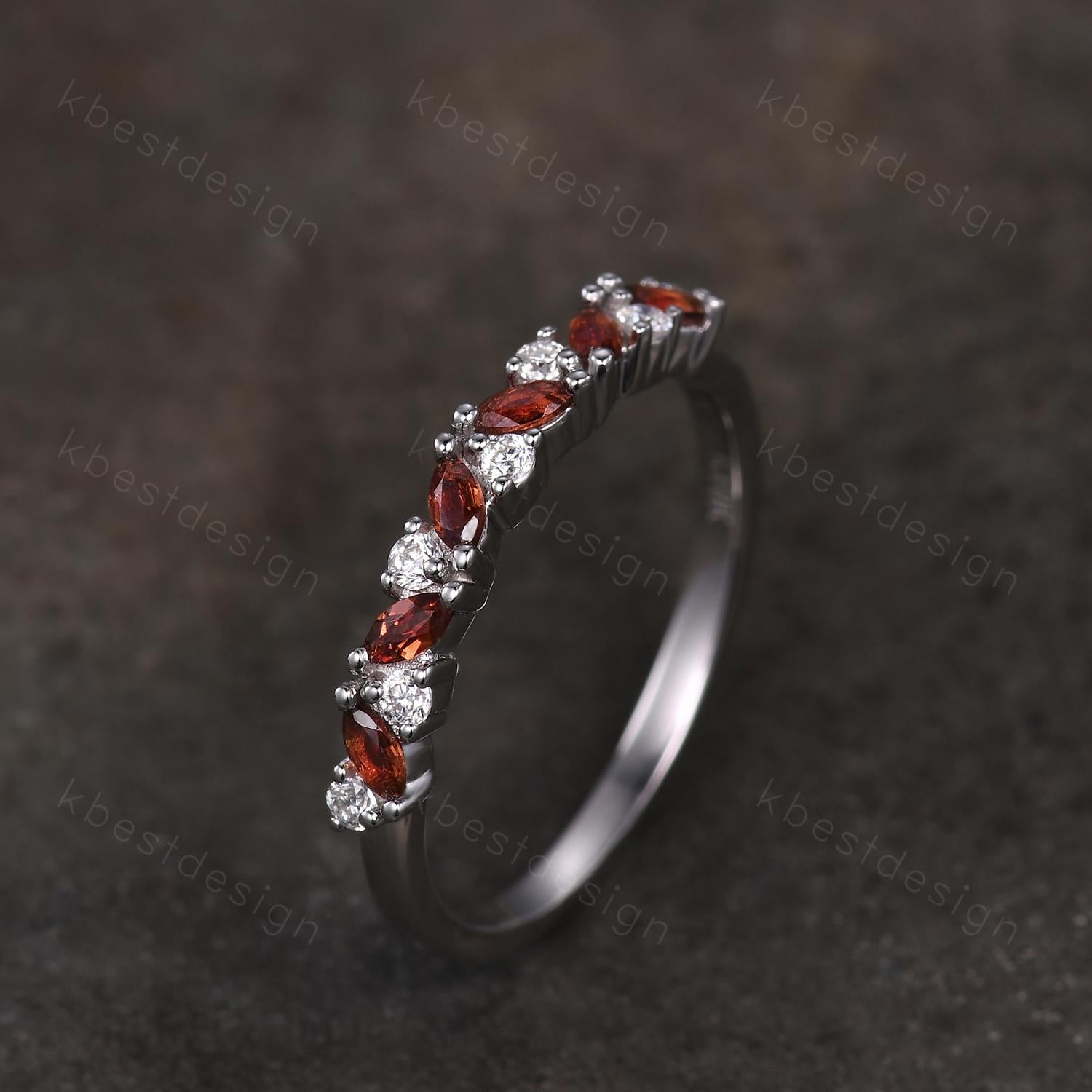 Garnet cluster wedding band Unique marquise cut garnet wedding band Vintage Moissanite ring Sterling silver ring Anniversary gift for Her