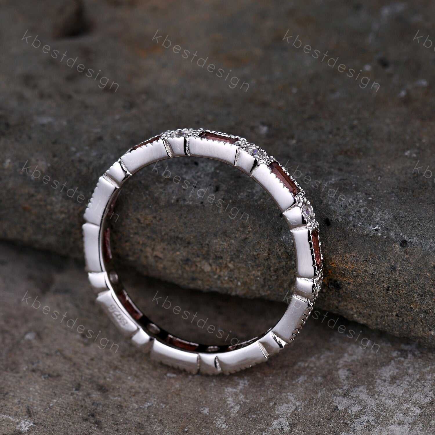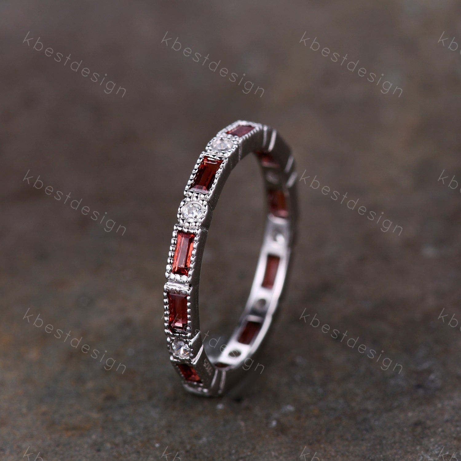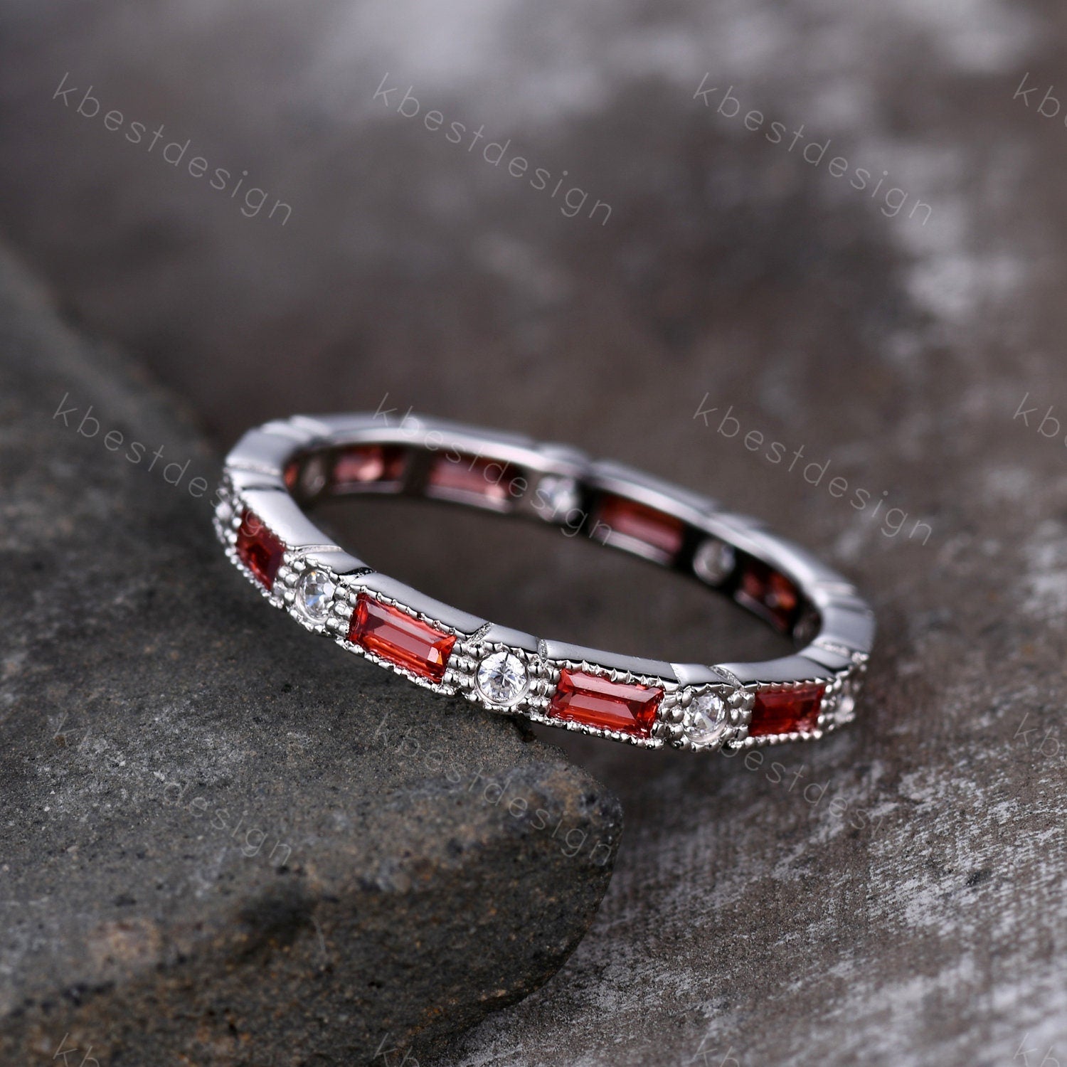 Garnet Ring, Art Deco Eternity Band, Baguette Garnet Wedding Band, January Birthstone Ring, Gemstone Band, Anniversary Gift, White Gold Ring