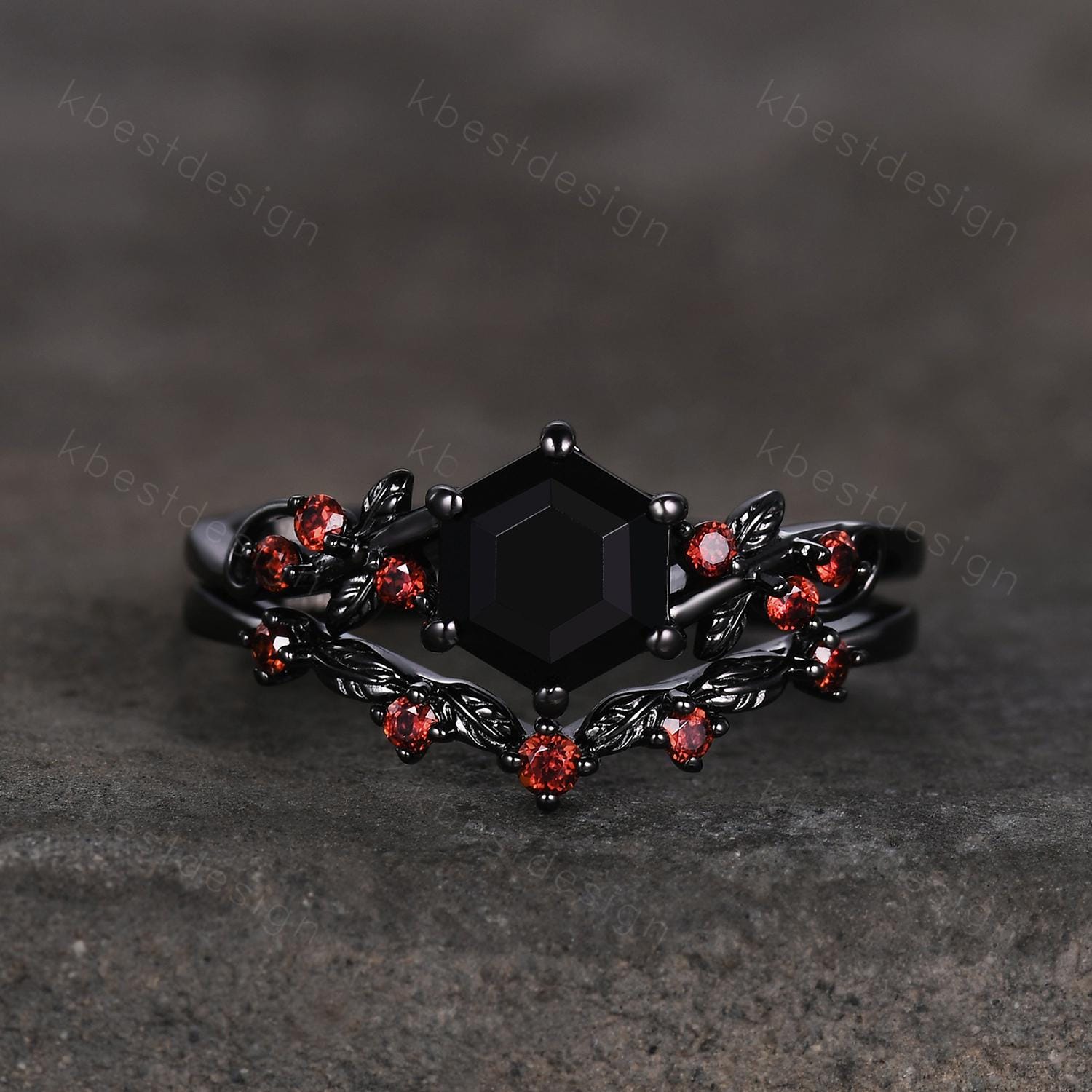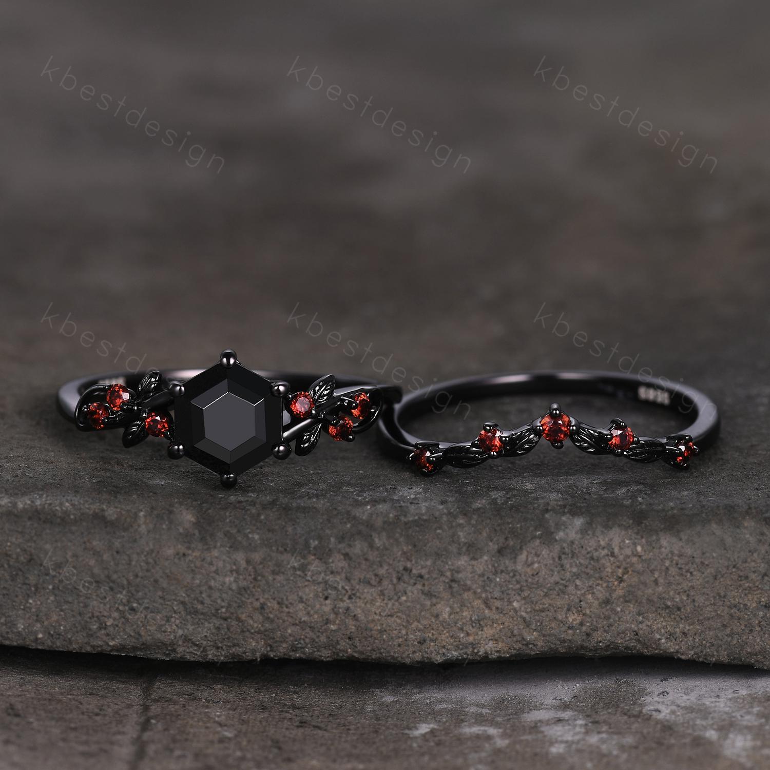 Gothic Hexagon cut Black Onyx Engagement Ring Art Deco Branch Design Leaf Garnet Wedding Ring Black Gold Ring Unique Bridal Ring Set