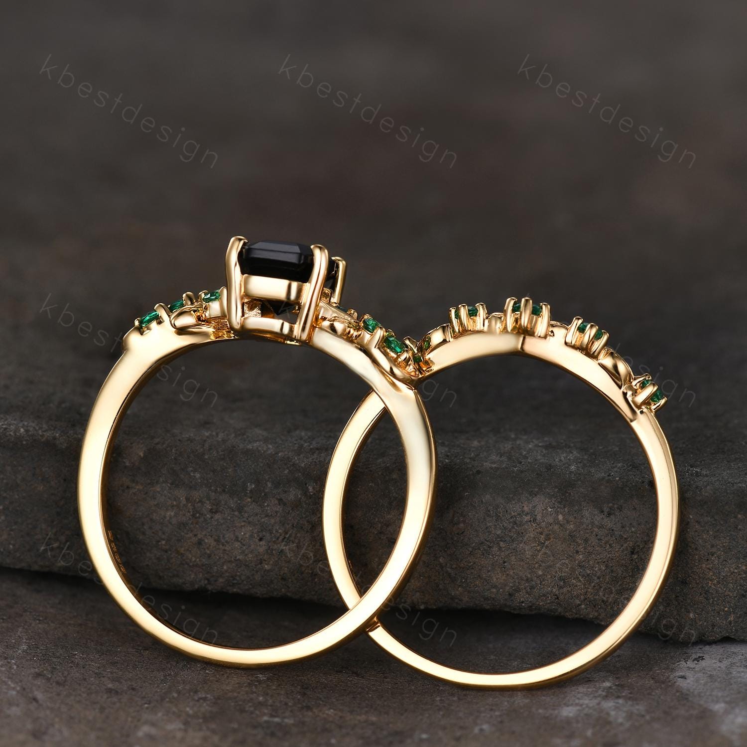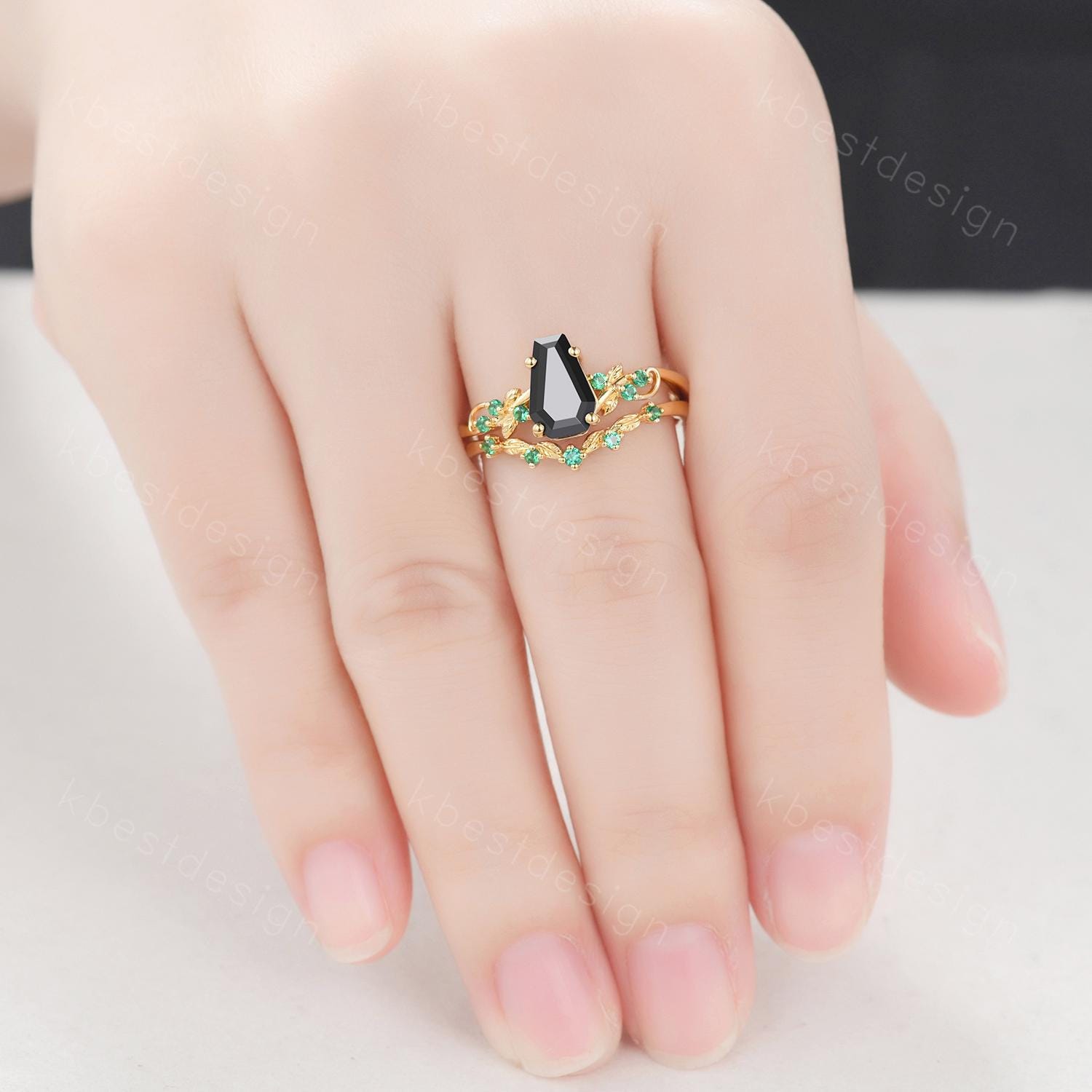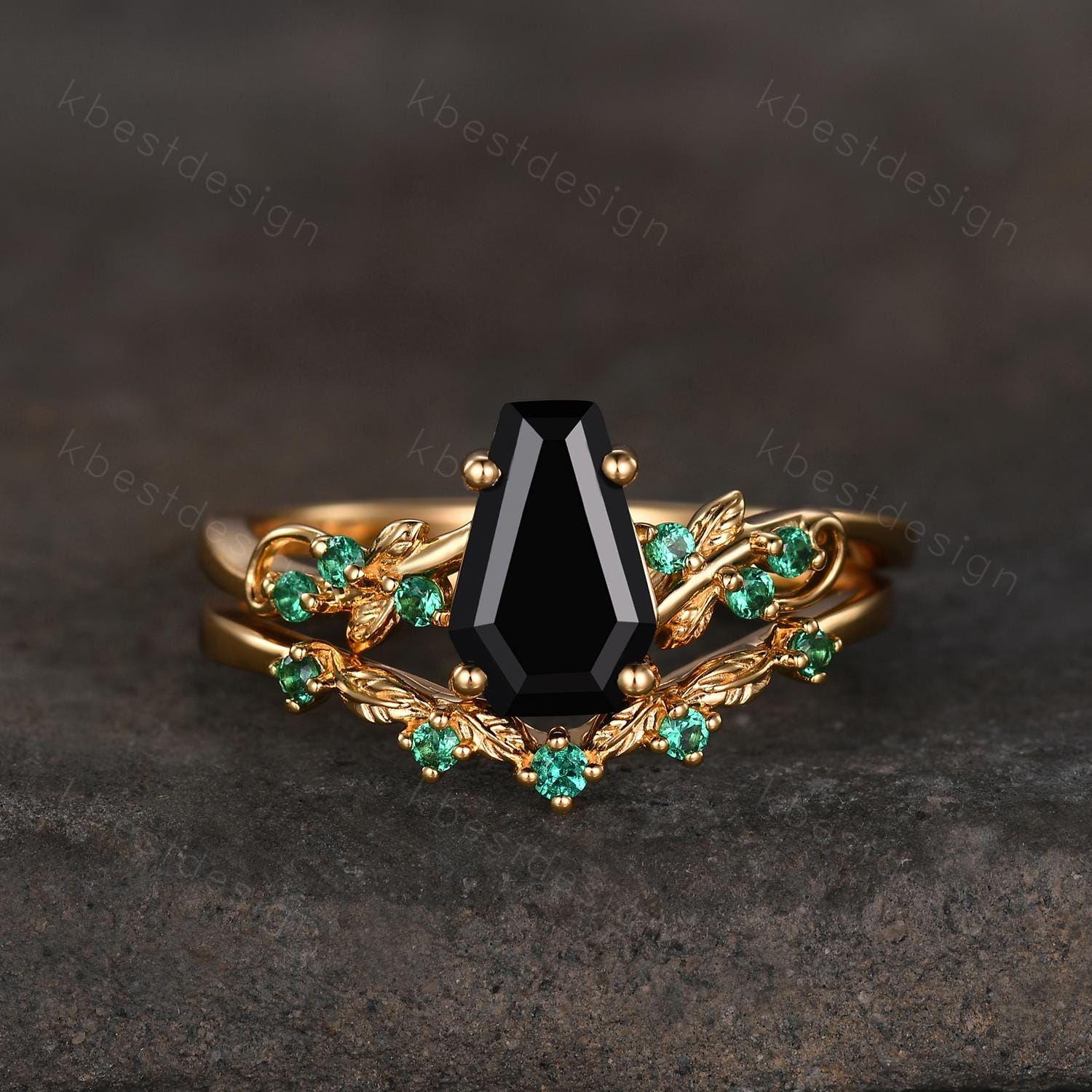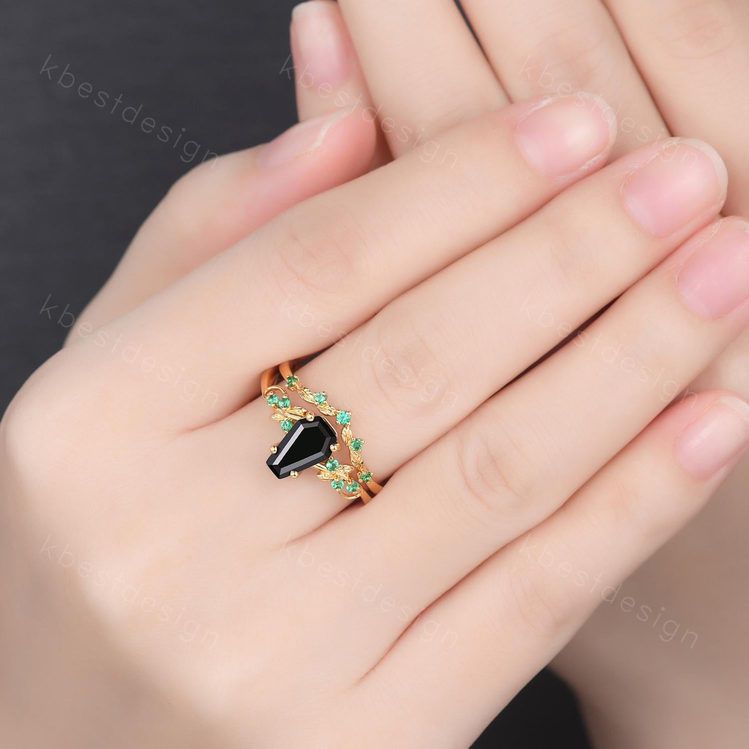 Gothic Yellow Gold Black Onyx Engagement Ring Art Deco Branch Design Leaf Emerald Wedding Ring Coffin cut Ring Unique Bridal Ring Set