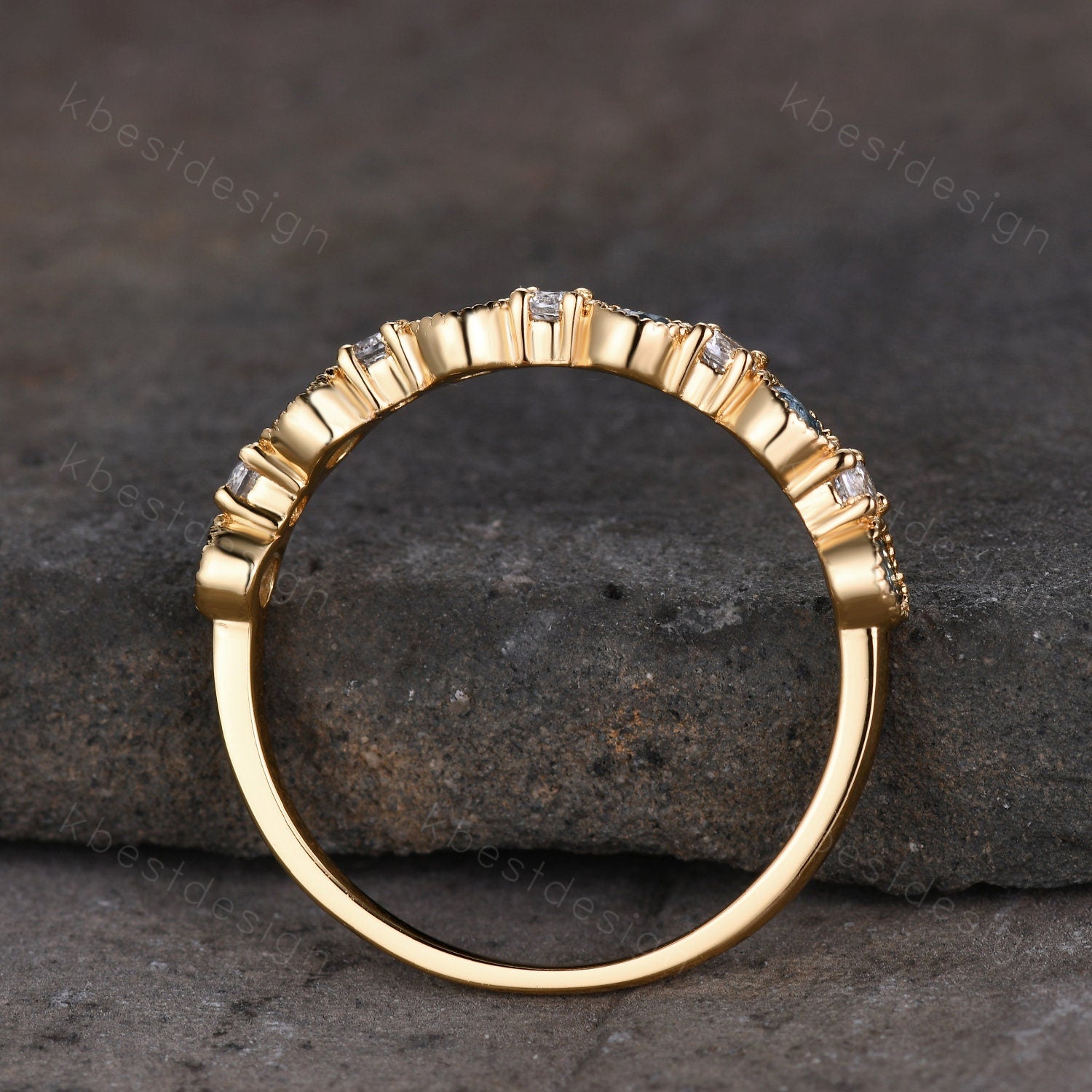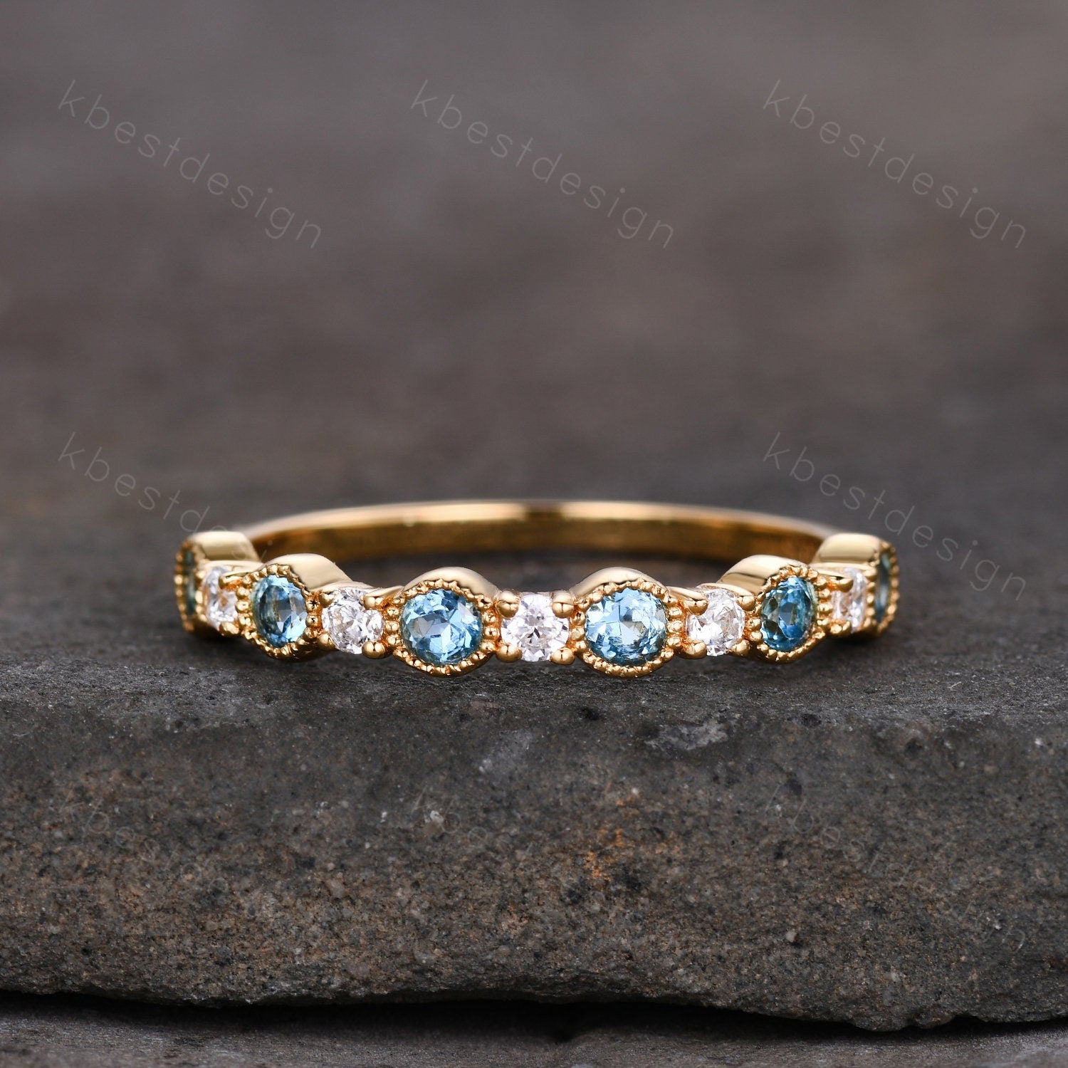 Half Eternity Blue Topaz Wedding Band Women Yellow Gold Band Art Deco Blue Topaz and Moissanite Wedding Band Unique Anniversary Ring